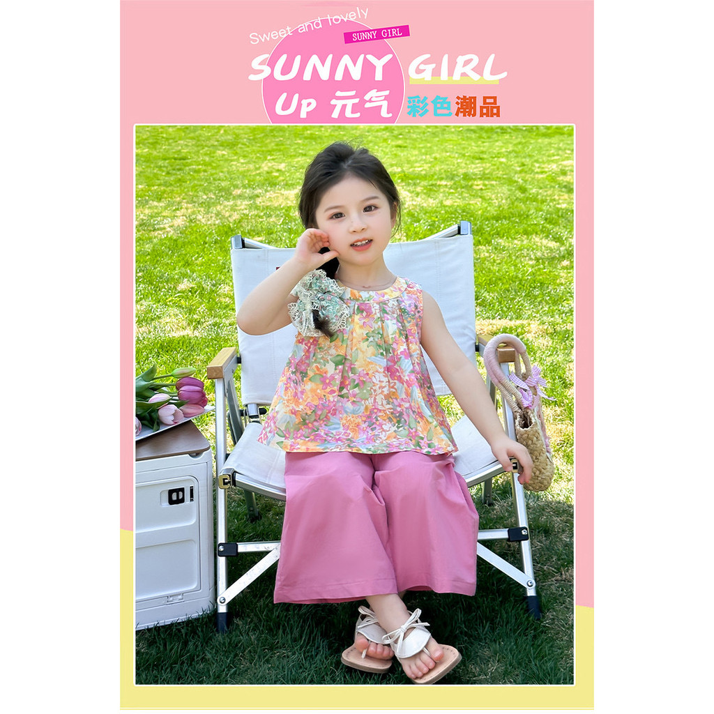 [มล] 80-150ซม สาวชุดสองชิ้นดอกไม้กางเกงขากว้างฤดูร้อนสไตล์ใหม่เด็กสาวชุดเสื้อกั๊กชุดสองชิ้น