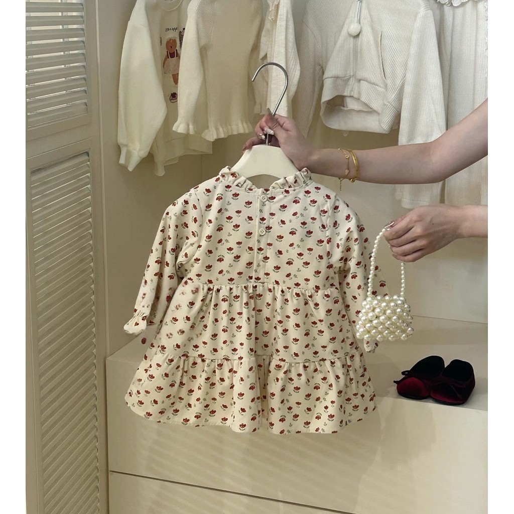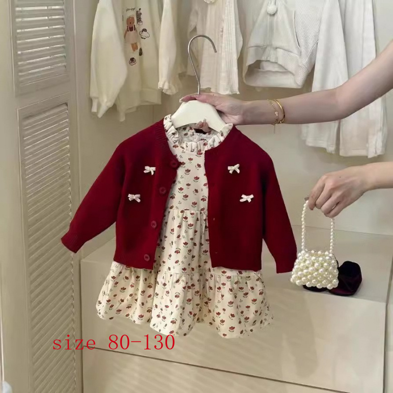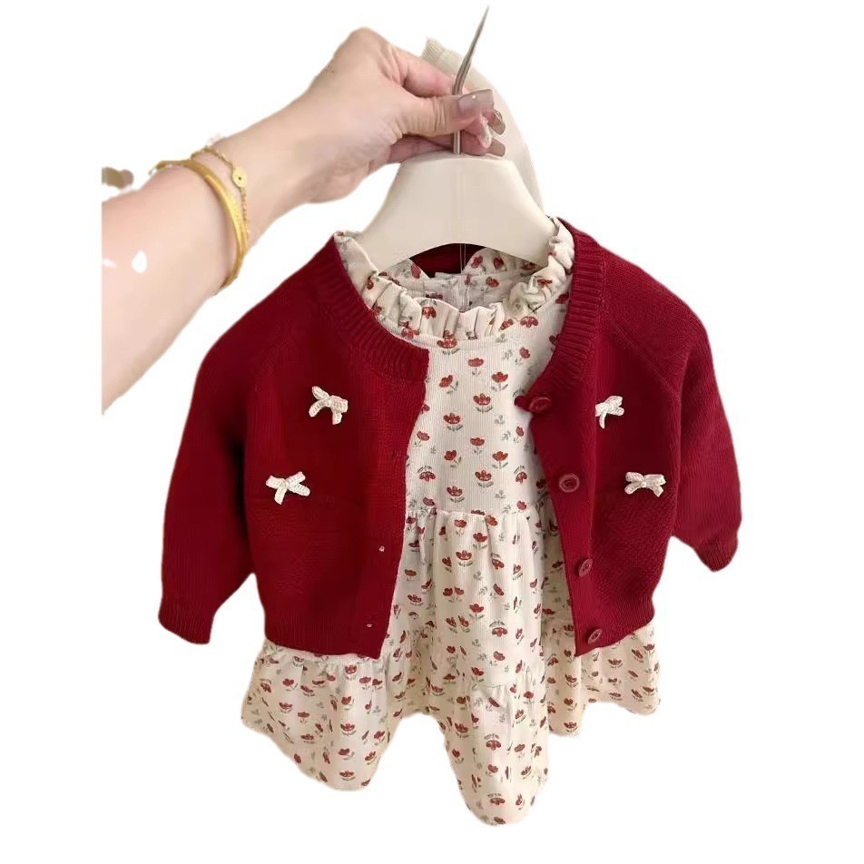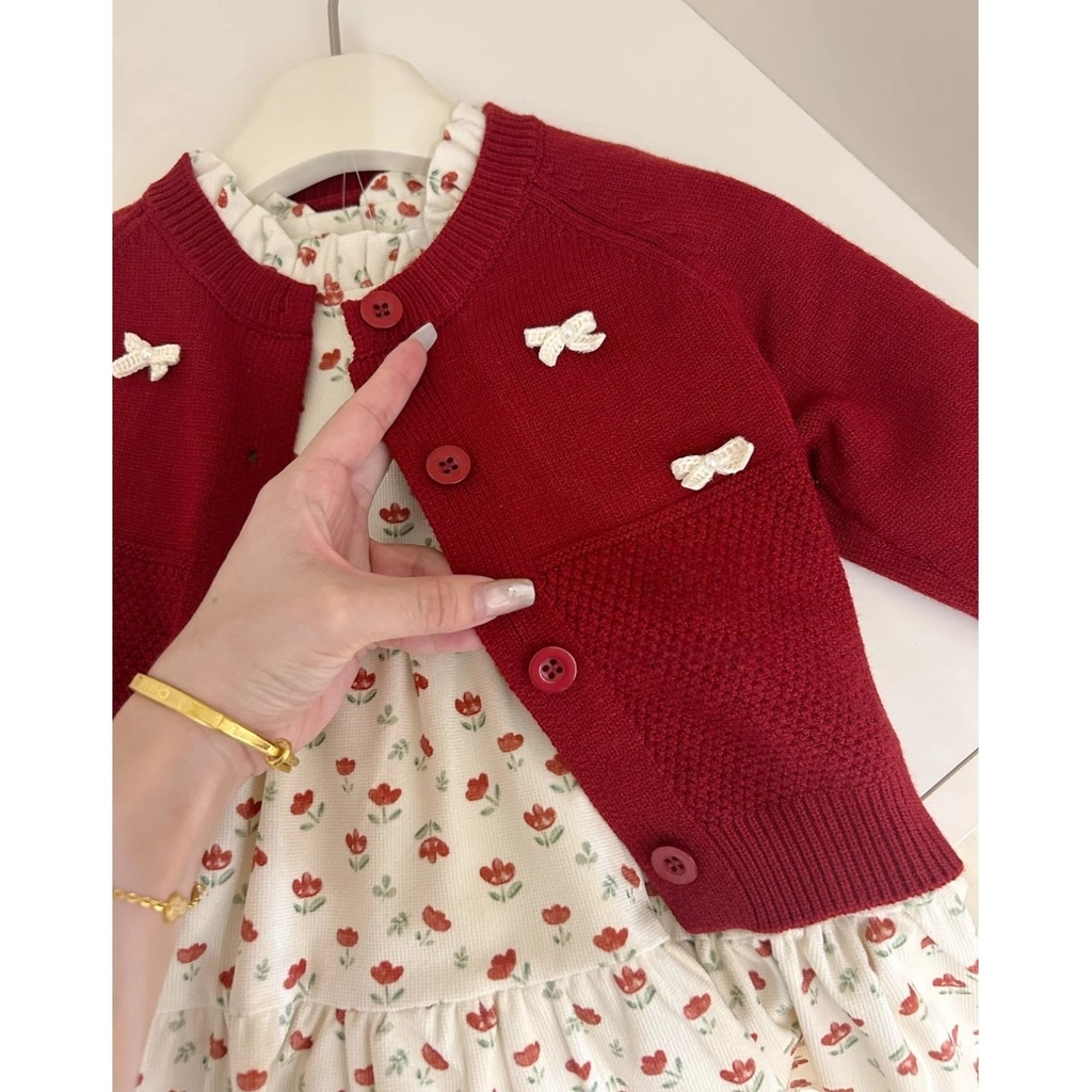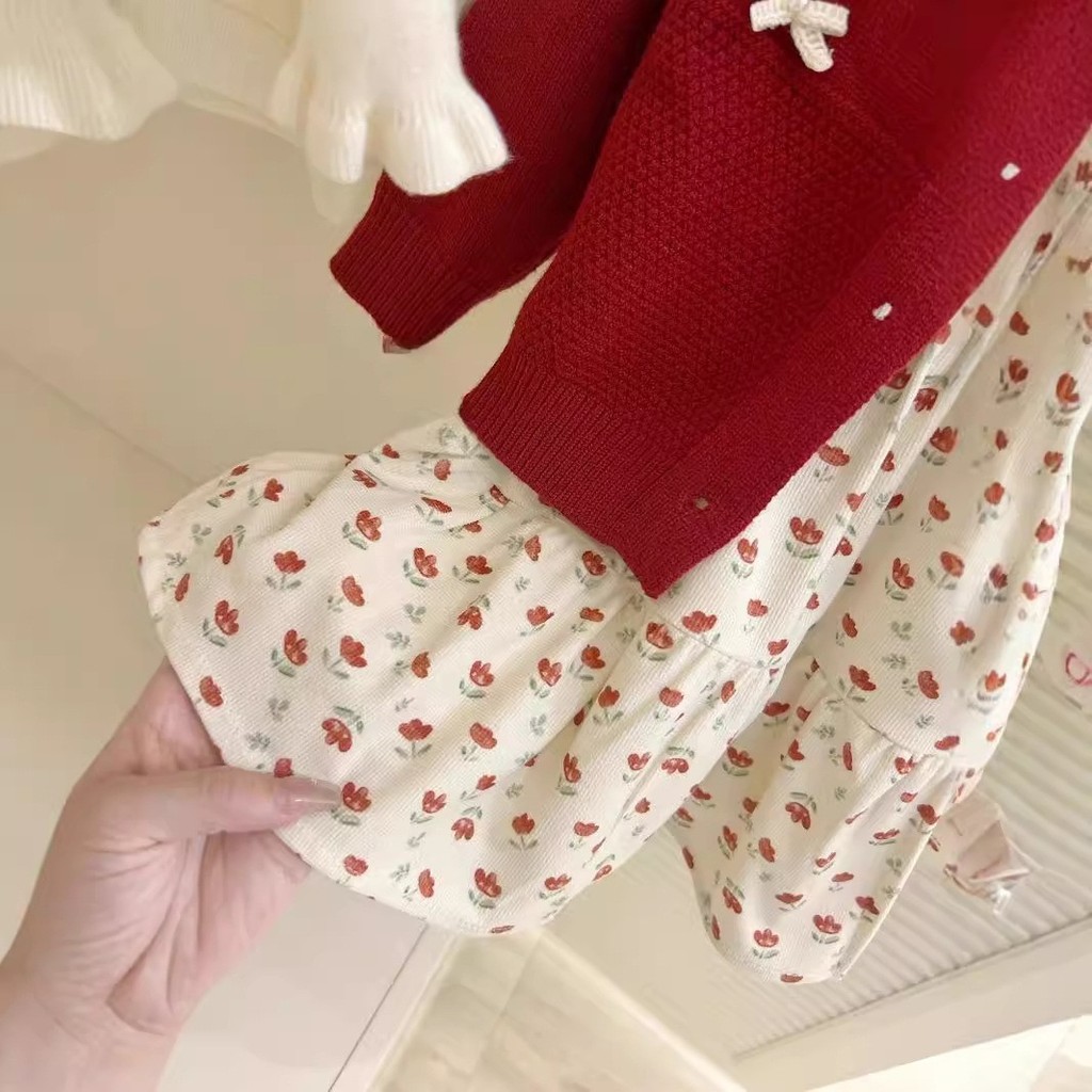 [อาเรีย] สาวต้นฤดูใบไม้ร่วงเสื้อสเวตเตอร์ถักโบว์สีแดงสไตล์ใหม่กระโปรงลายดอกไม้ชุดสองชิ้น