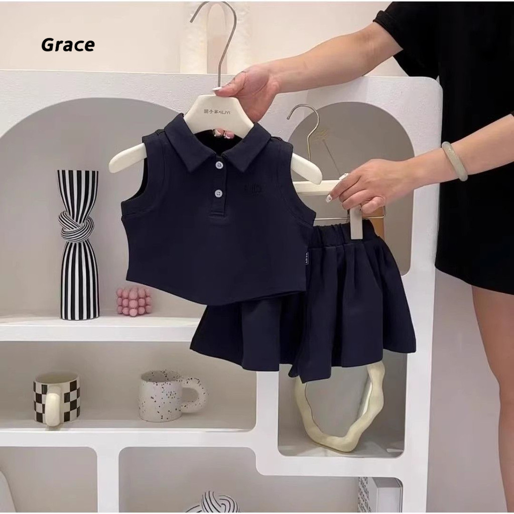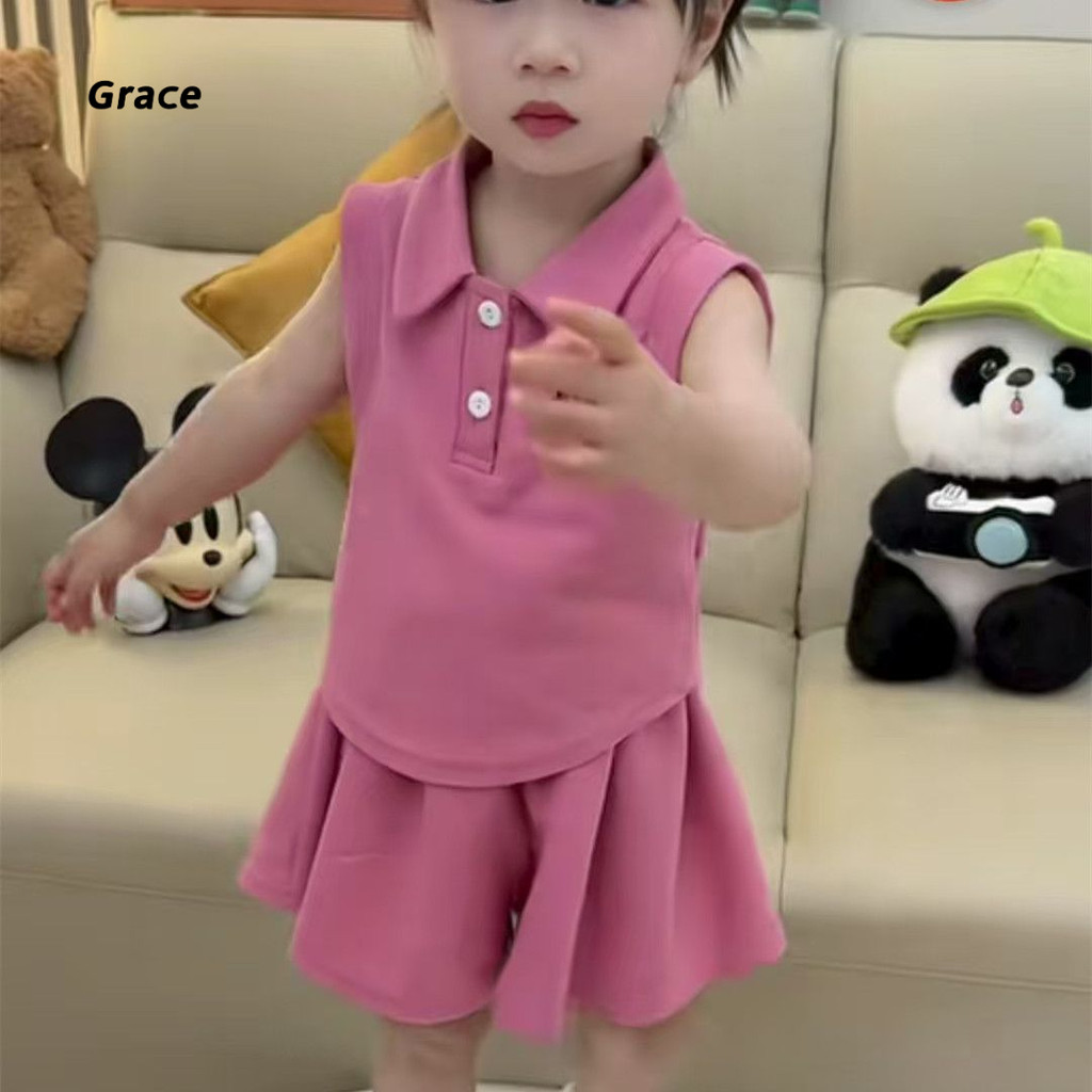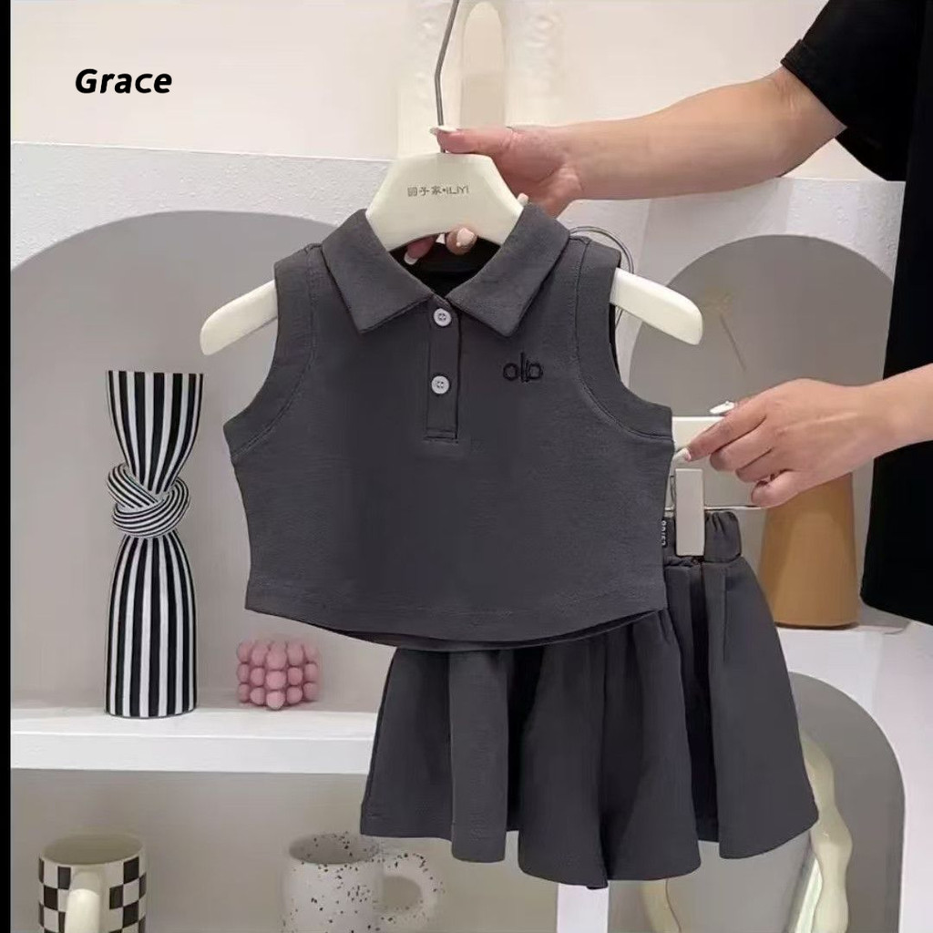 【Grace】ชุดเด็กผู้หญิง ชุดเดรส 2 ชิ้น 2025 ชุดแฟชั่นเด็กผู้หญิงแขนสั้นโปโล + กางเกงกระโปรงน่ารัก..GR3298#