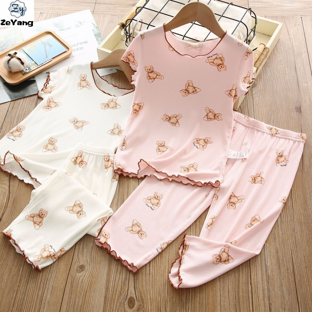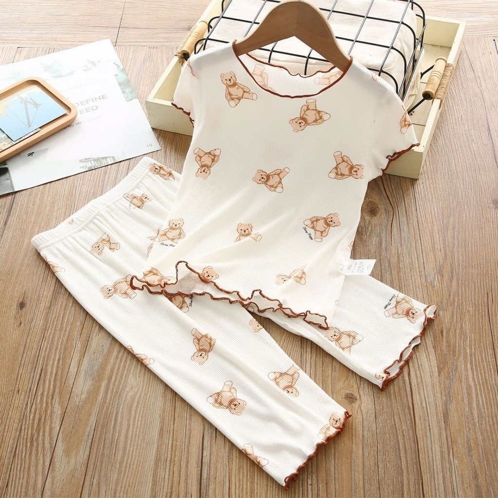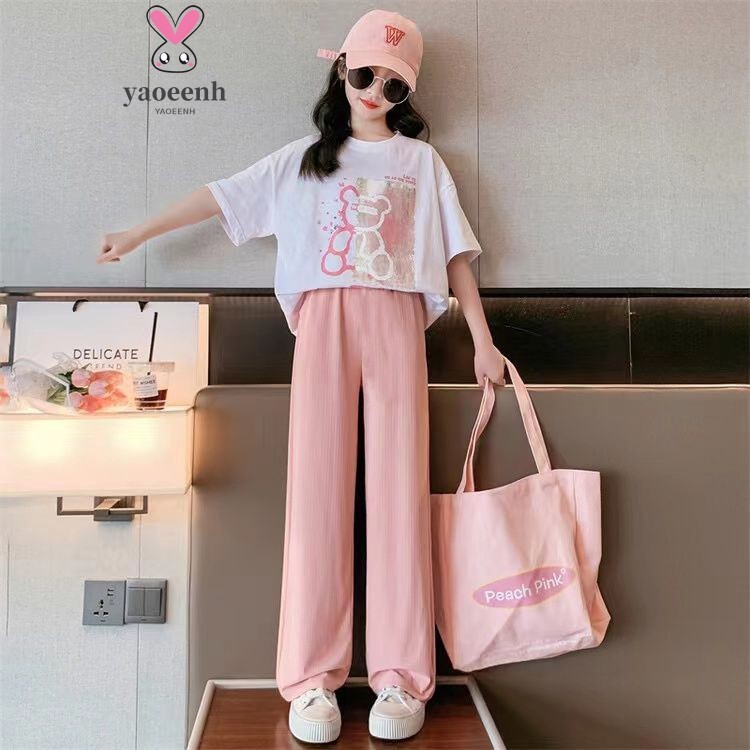 【YAOEENH】120-170ซม.ฤดูร้อนสาวหลวมสบายๆแขนสั้นกางเกงสูทเด็กใหญ่น่ารักหมีกางเกงตรงชุดสองชิ้นพร้อมสต็อกจัดส่งที่รวดเร็ว