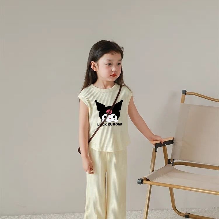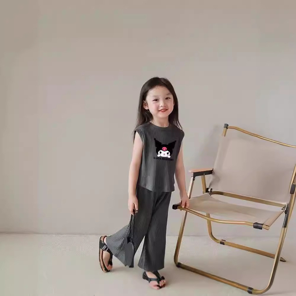[มล] 90-140เซนติเมตรฤดูร้อนสไตล์ใหม่สาวเด็กผ้าไหมน้ําแข็งชุดฤดูร้อนเสื้อกั๊กแขนกุดด้านบนกางเกงแฟชั่นชุดสองชิ้น