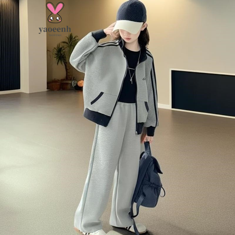 【YAOEENH】ชุดสองชิ้นสำหรับเด็กอายุ 4-12 ปี ขนาด 120-170 ซม., กีฬายืดหยุ่น ลายพิมพ์สดใส พร้อมเสื้อกันหนาวแบบคาร์ดิแกนซิป