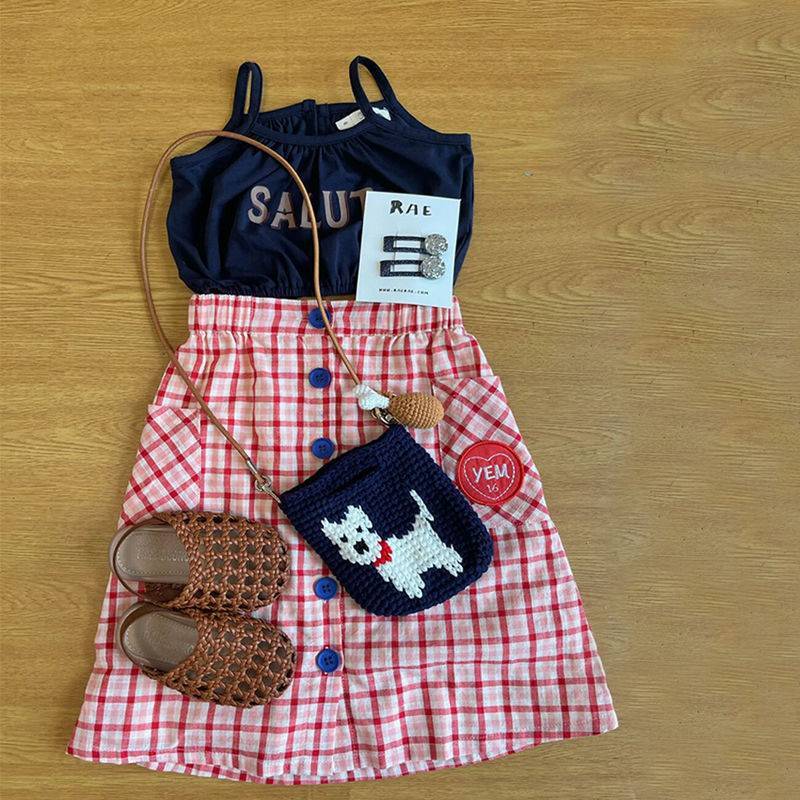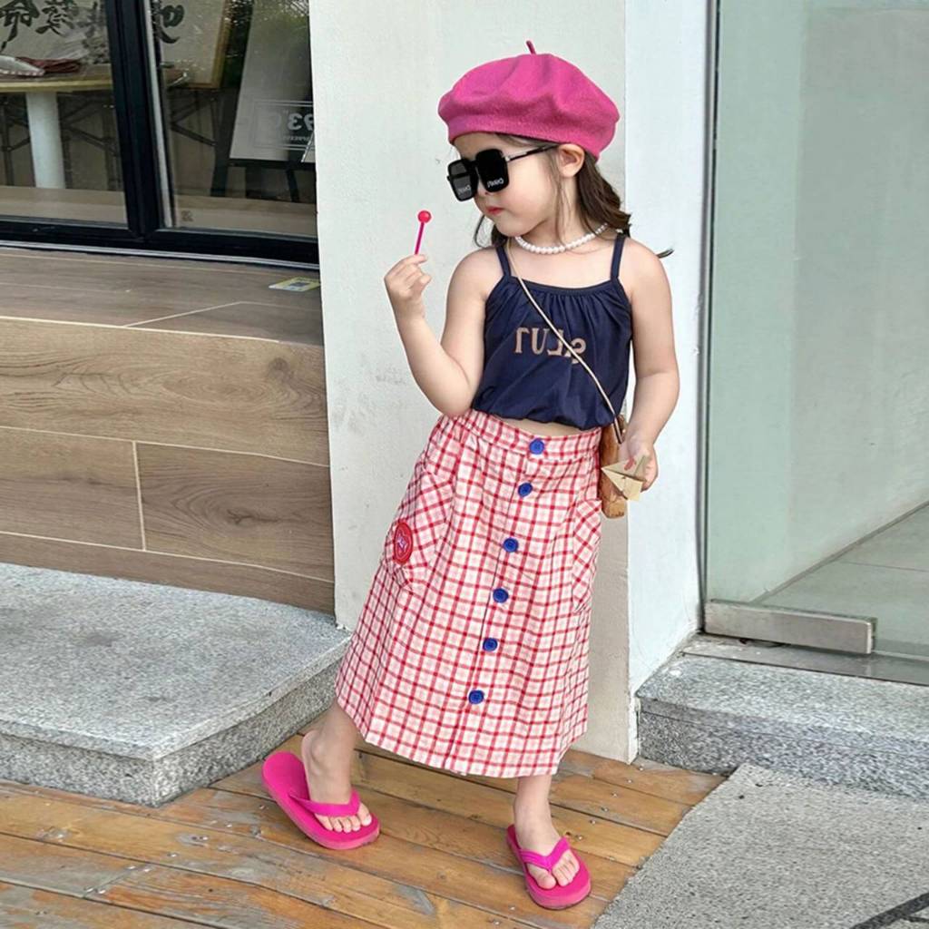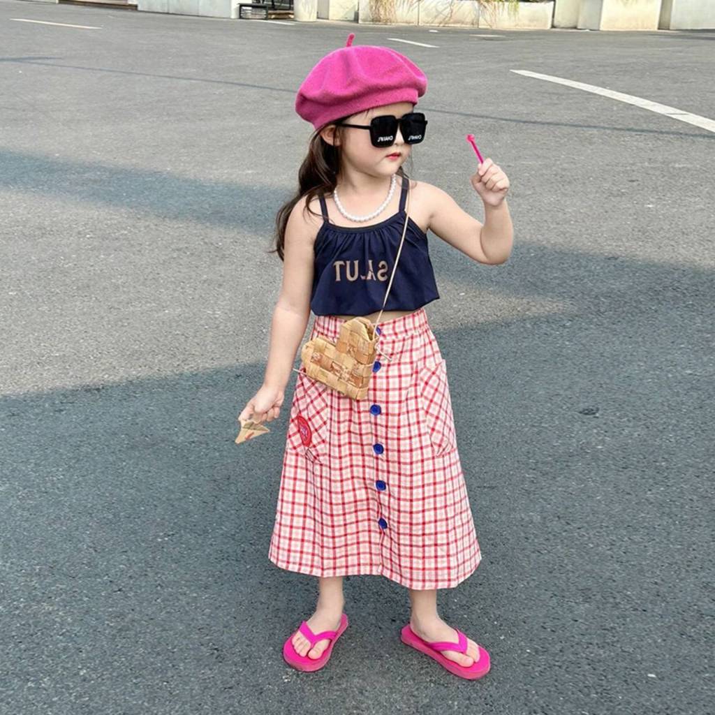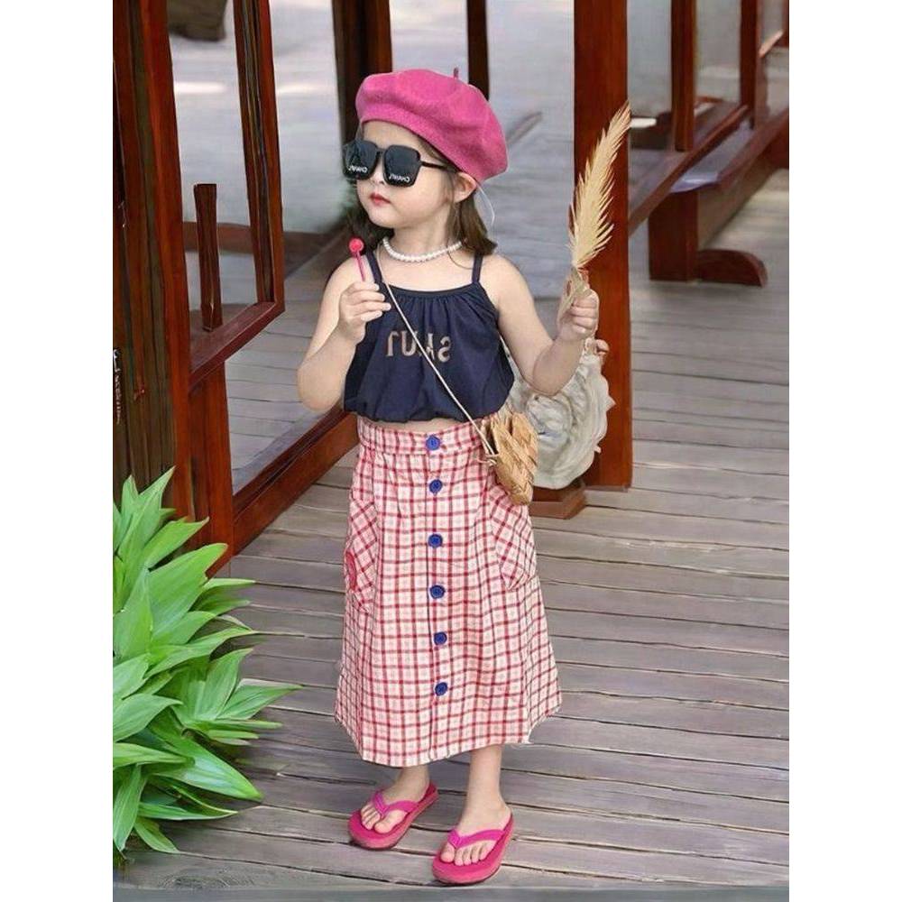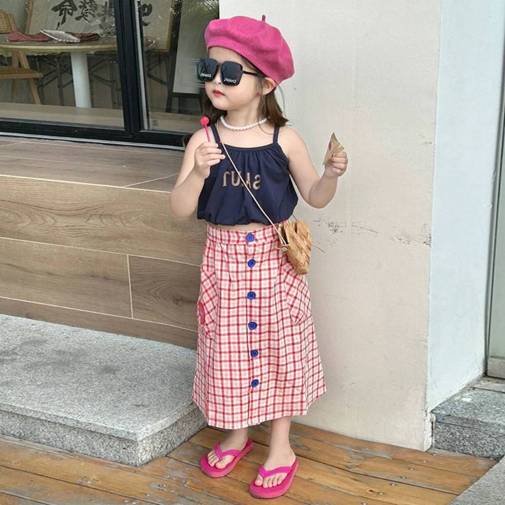 [Y D]🔥พร้อมส่ง🔥ชุดเซ็ท2ชิ้นเด็กผู้หญิง เสื้อสายเดี่ยว+กระโปรงลายสก๊อต#397