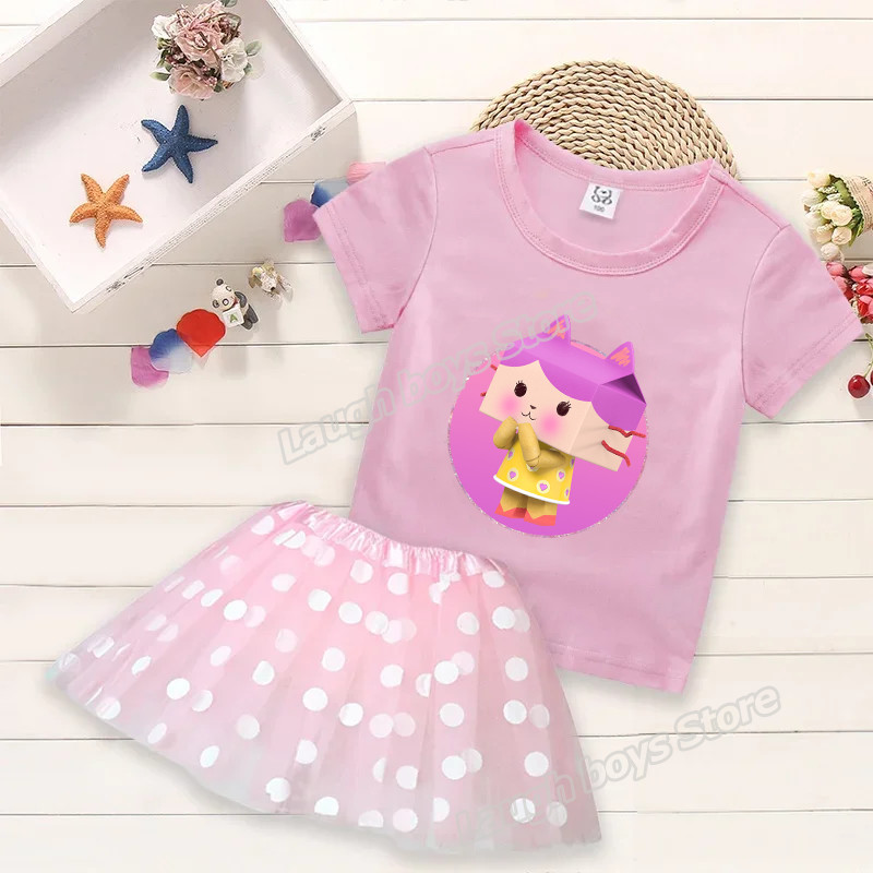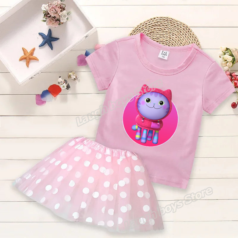 Gabby Dollhouse เด ็ กฤดูร ้ อนสีชมพูผ ้ าฝ ้ ายแท ้ เสื ้ อยืดลายจุดชุดกระโปรงปุย