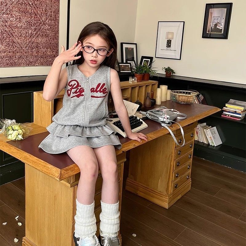 Lemon-tree girls American retro street เสื้อกั๊กเสื้อสเวตเตอร์ถักเด็กฤดูร้อนเสื้อยืดแขนกุด + กระโปรงปุยชุดสองชิ้น