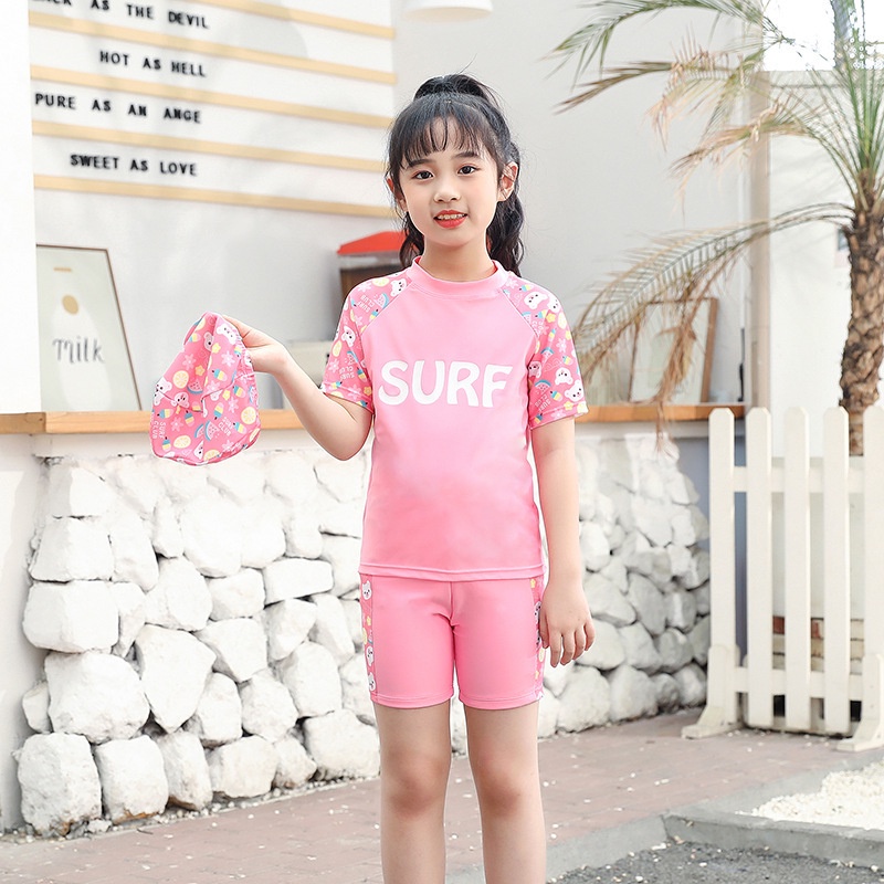 ชุดว่ายน้ํา แขนสั้น ลายหมี สีชมพู พร้อมหมวก พลัสไซซ์ XL-6XL สําหรับเด็กผู้หญิง