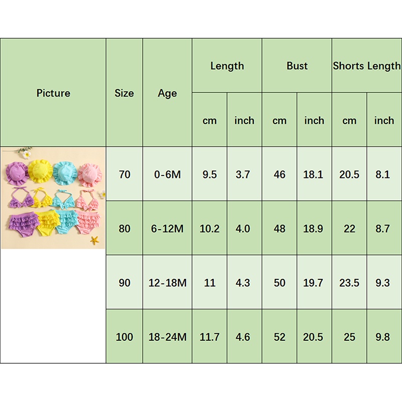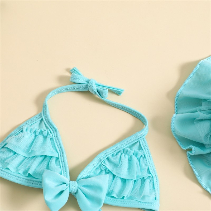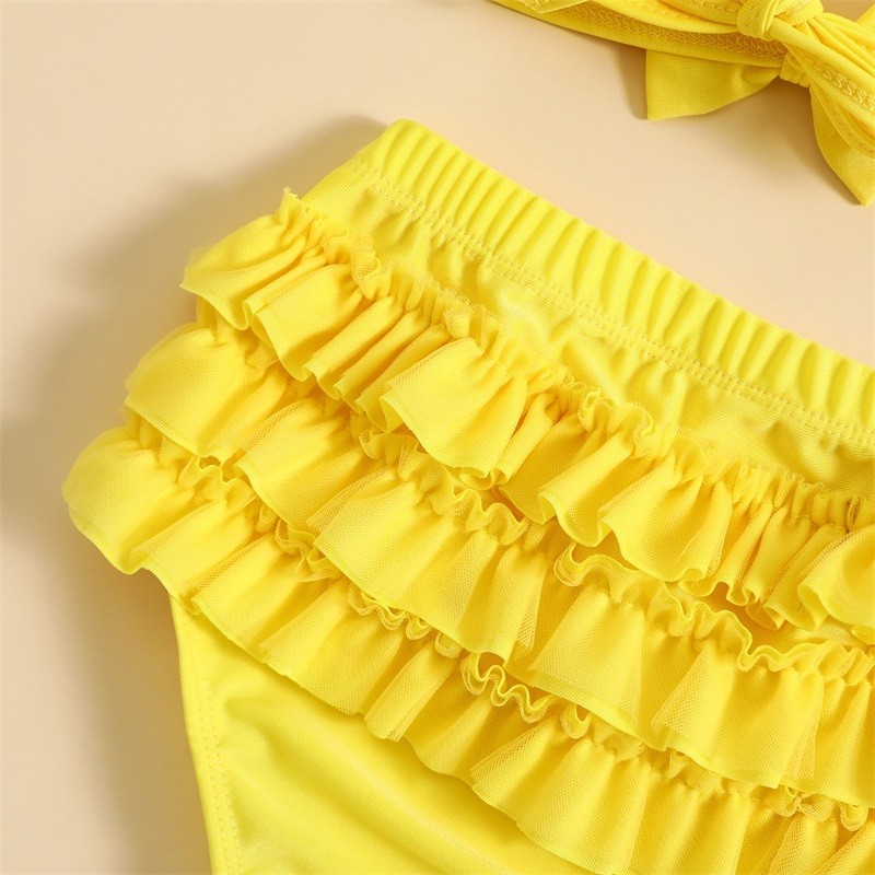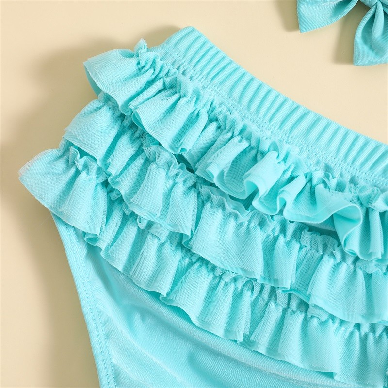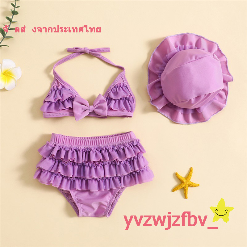 ชุดว่ายน้ำฤดูร้อนสำหรับเด็กผู้หญิงชุดชุดเสื้อแขวนคอ + กางเกงขาสั้นระบายชั้น + หมวก