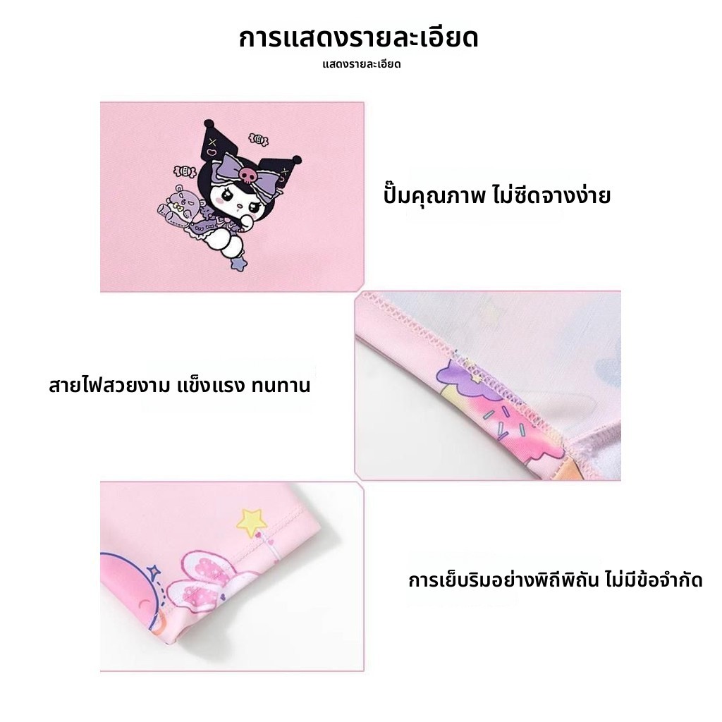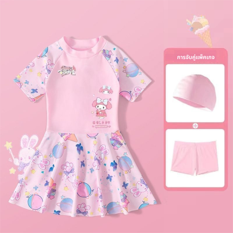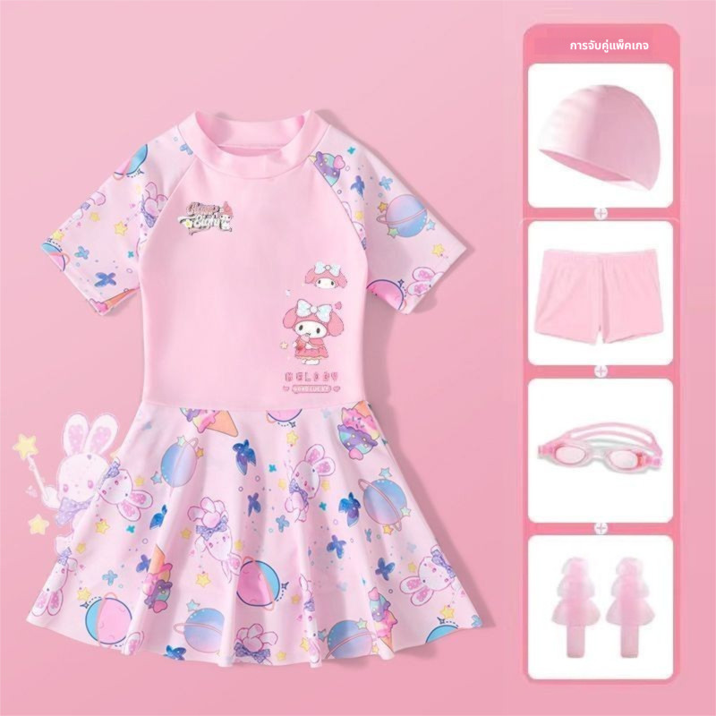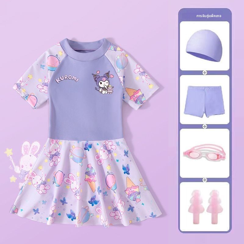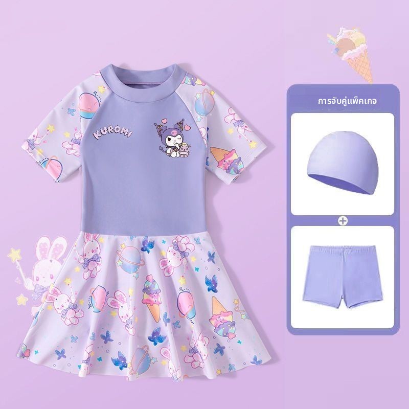 ชุดว่ายน้ำวันพีซเด็กผู้หญิง ลาย Kuromi พร้อมหมวกว่ายน้ำ แขนสั้น น่ารัก ระบายอากาศดี ใส่สบาย