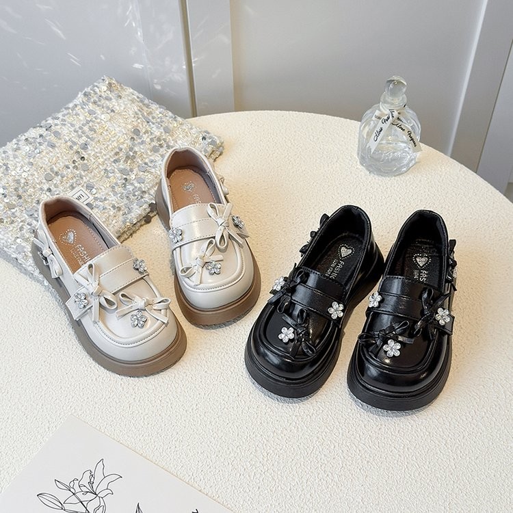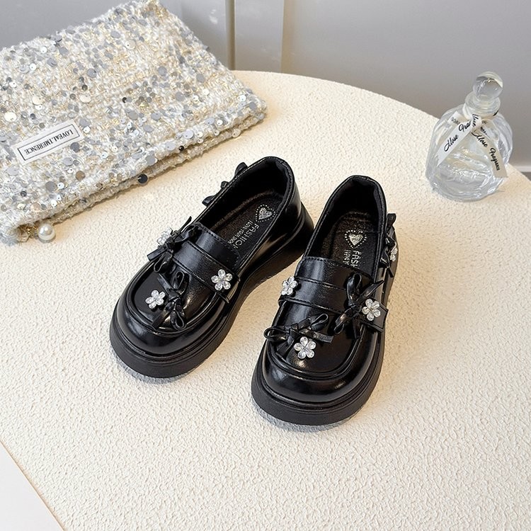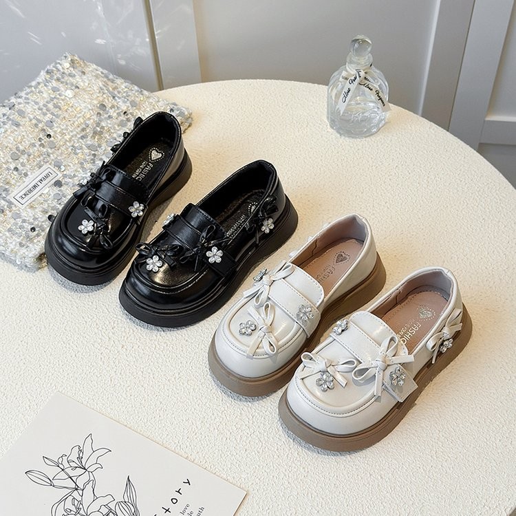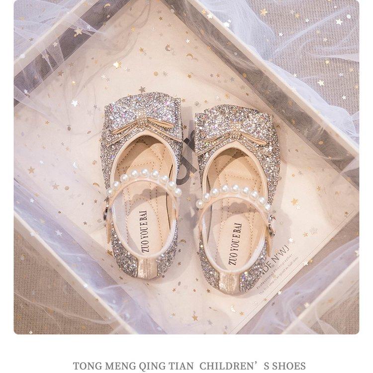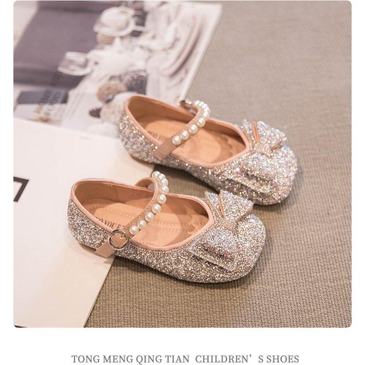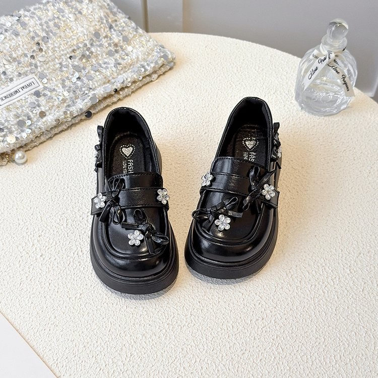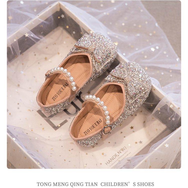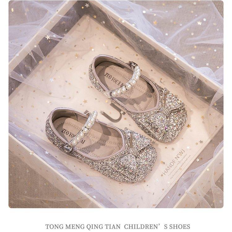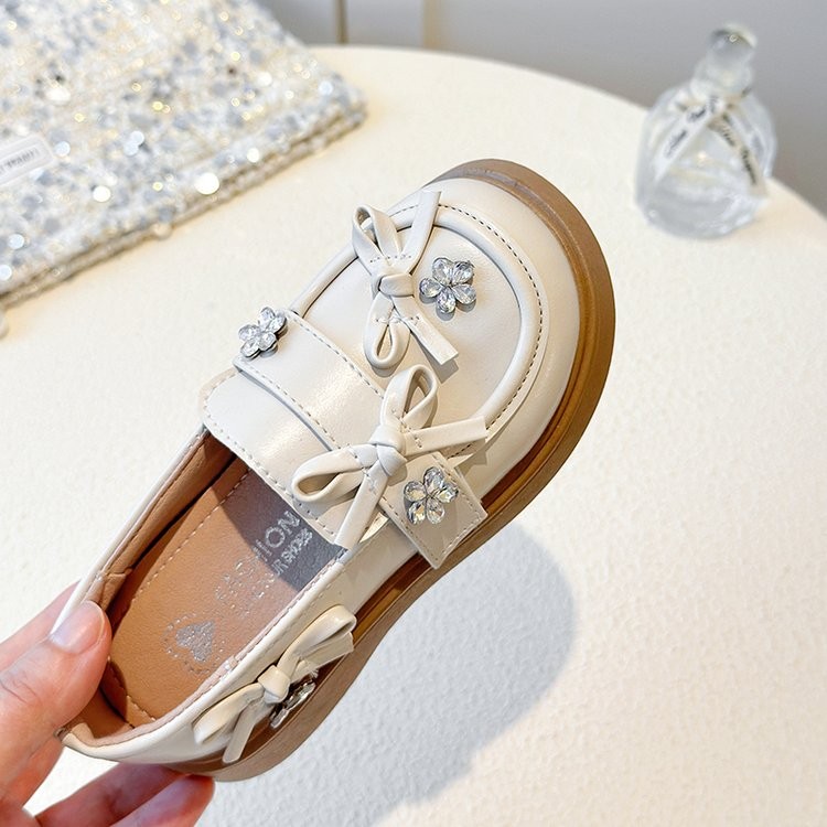 รองเท้าหนัง พื้นนิ่ม ประดับโบว์ และพลอยเทียม กันลื่น สไตล์เจ้าหญิง สําหรับเด็กผู้หญิง