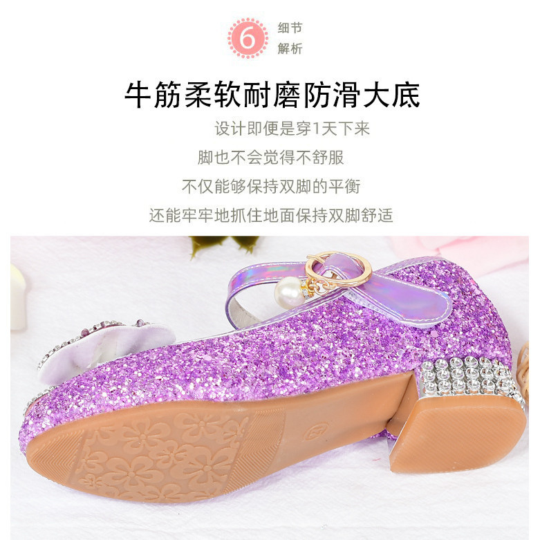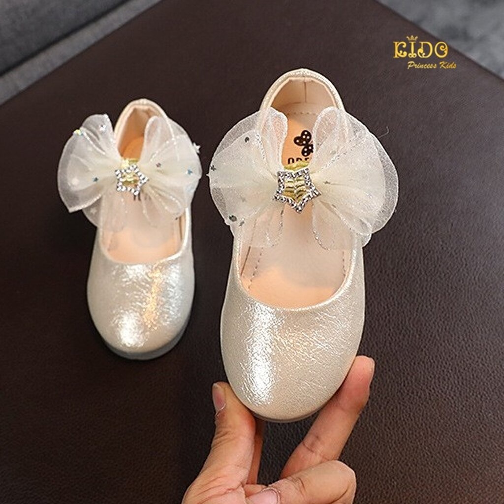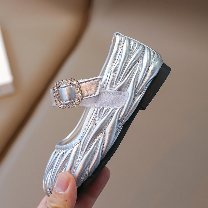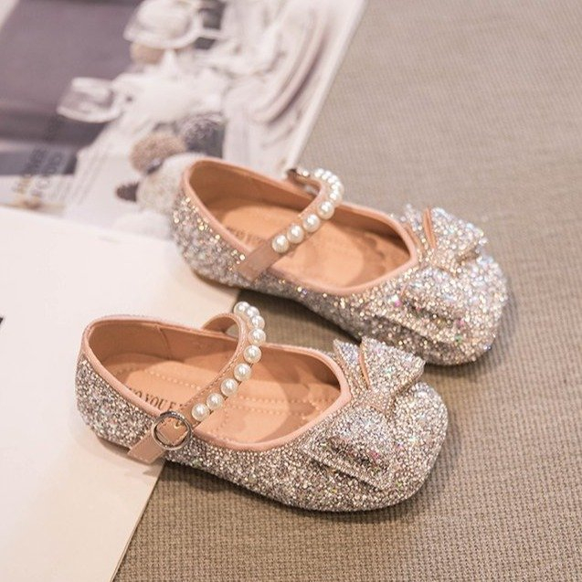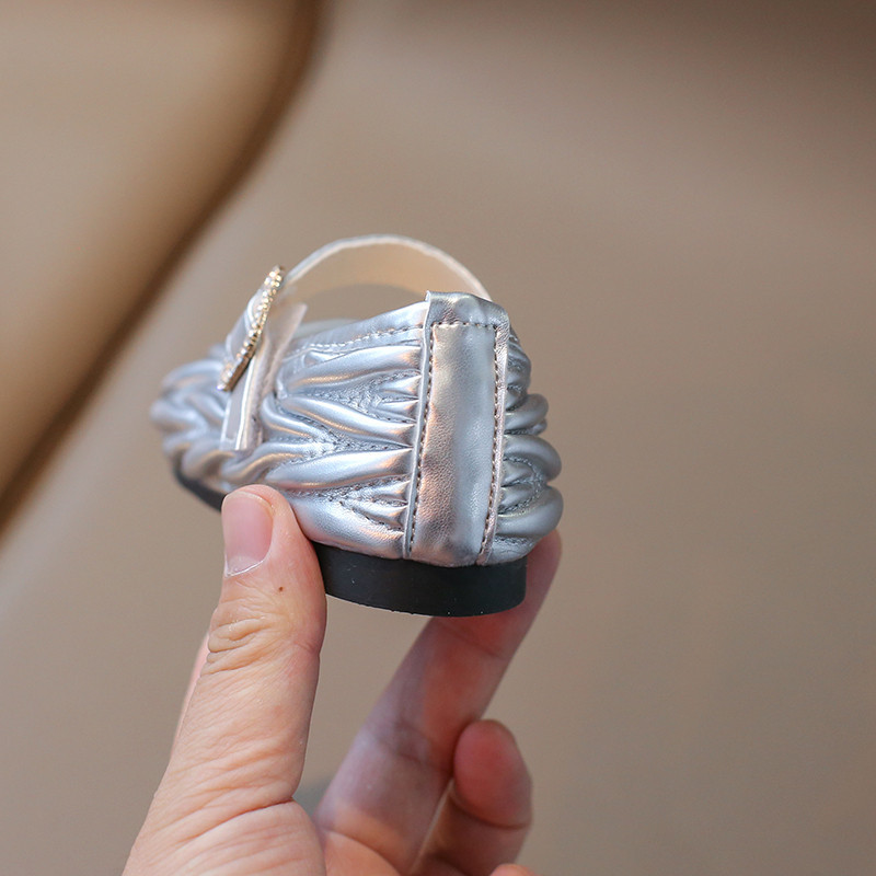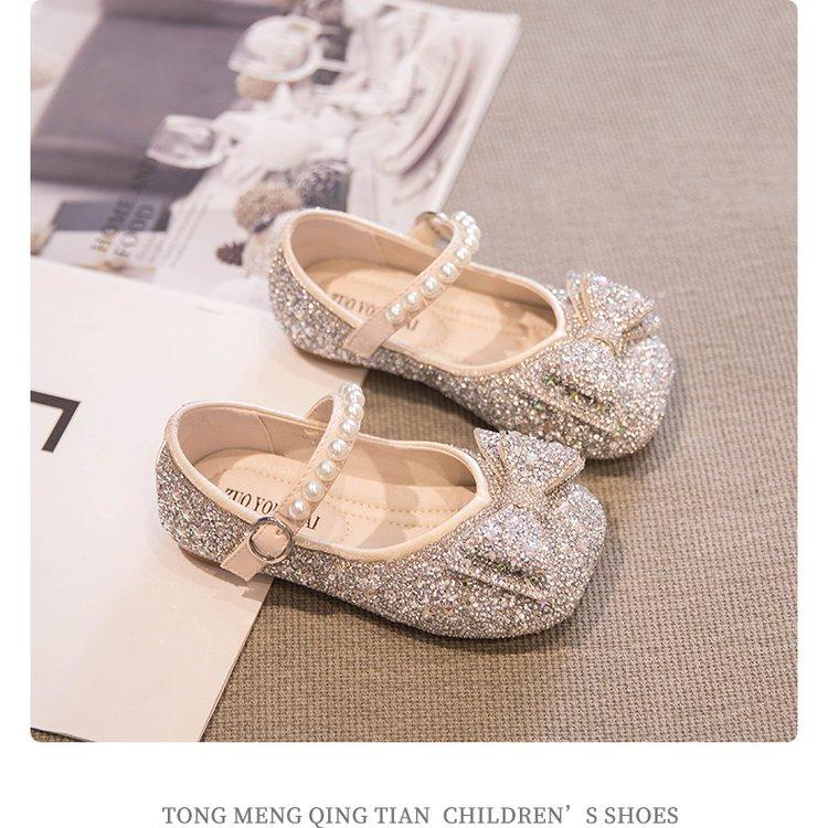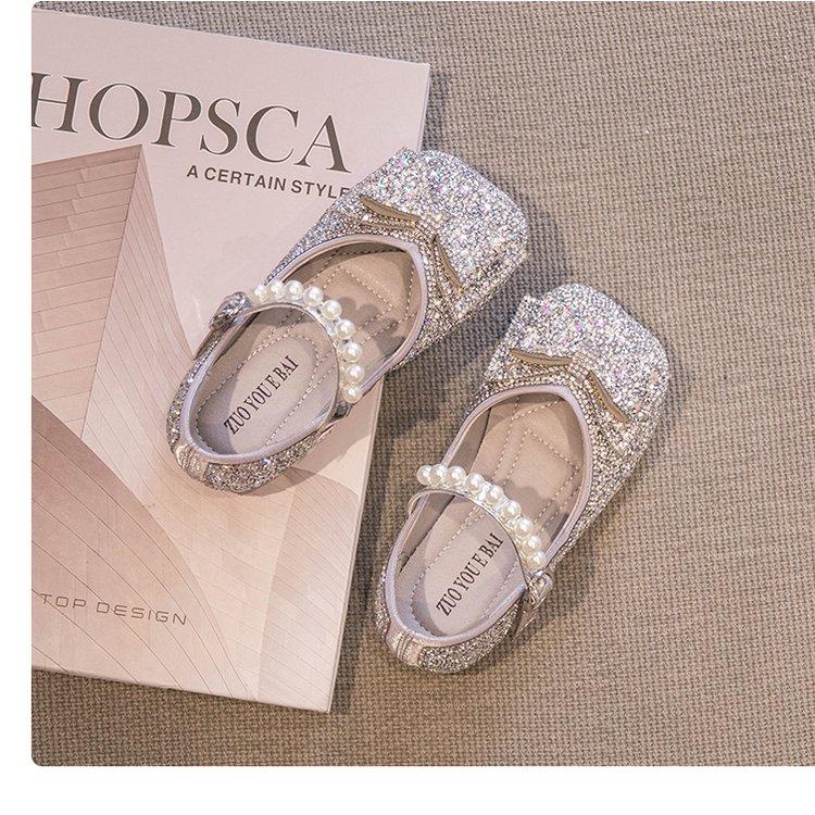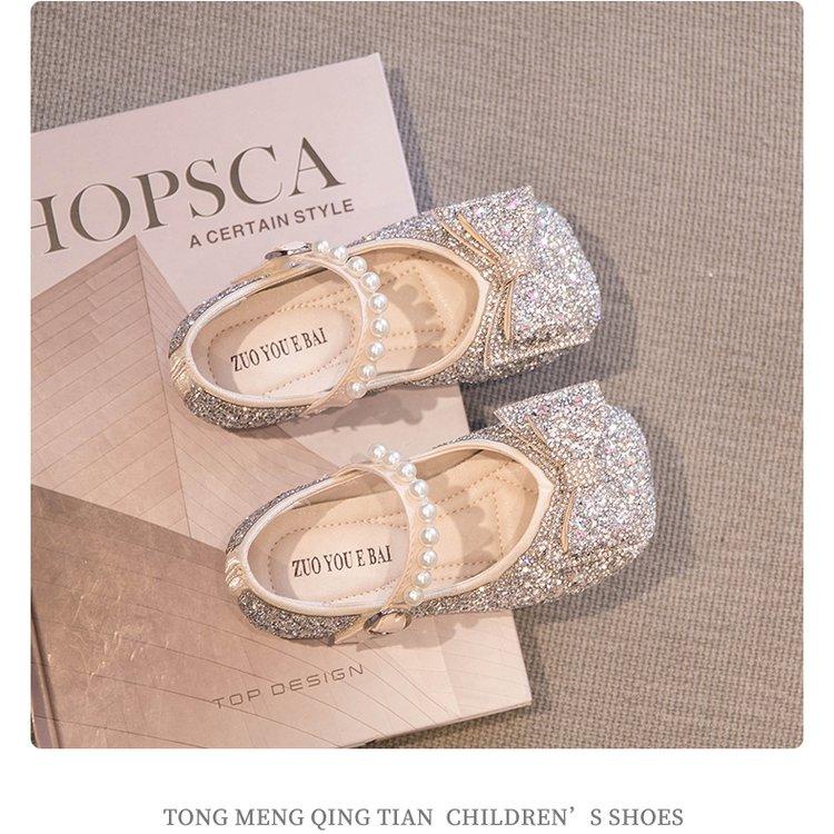 รองเท้าหนัง พื้นนิ่ม ประดับโบว์ และพลอยเทียม กันลื่น สไตล์เจ้าหญิง สําหรับเด็กผู้หญิง