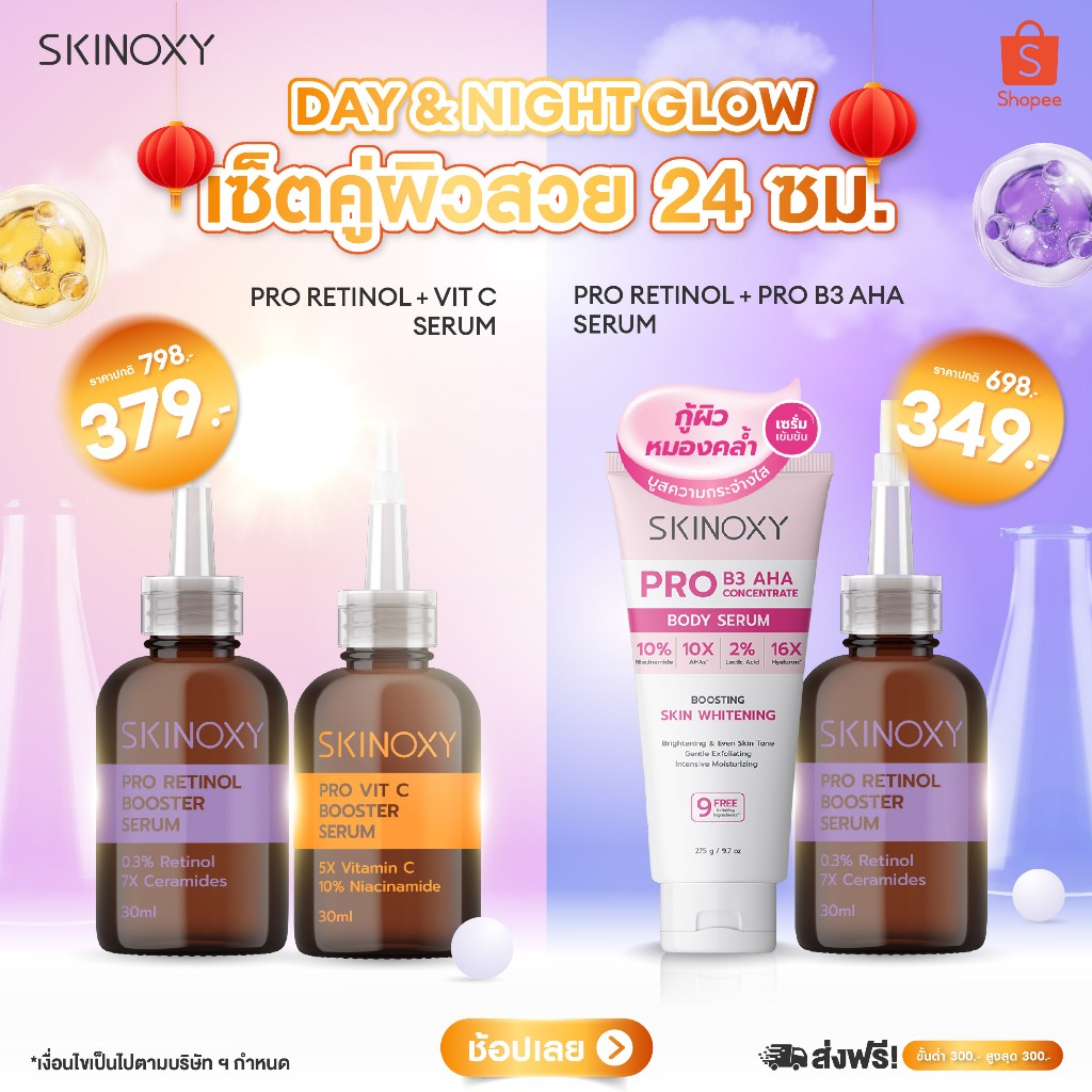 [ แพคคู่สุดคุ้ม ] บูสเตอร์ เซรั่มเข้มข้น Skinoxy Pro Booster Serum VitC & Retinol ขนาด 30ml.