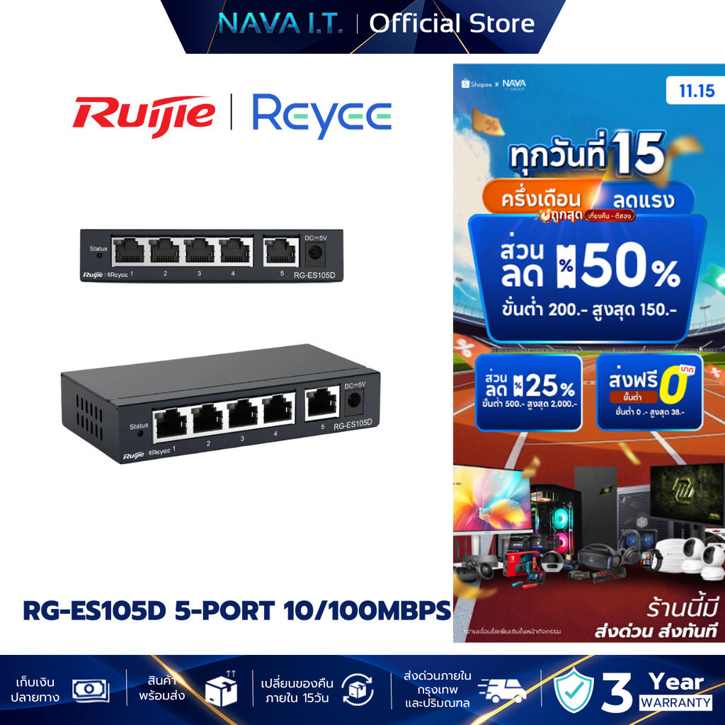 Ruijie Reyee RG-ES105D 5-Port 10/100 Mbps RJ45 Unmanaged Desktop