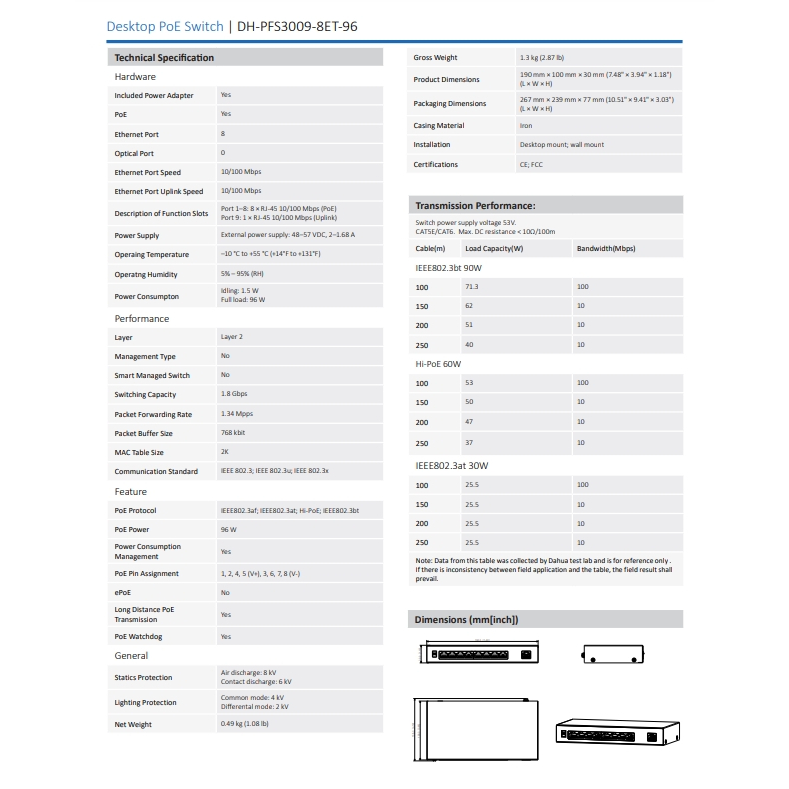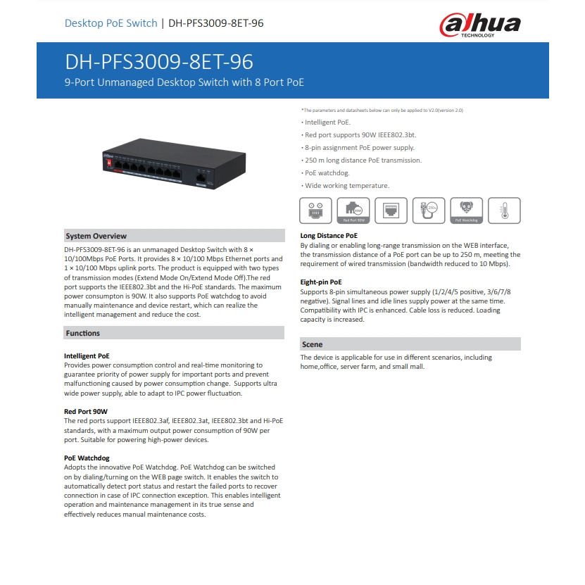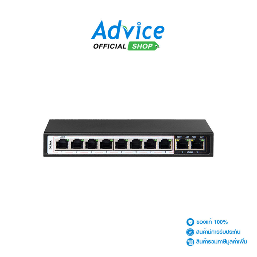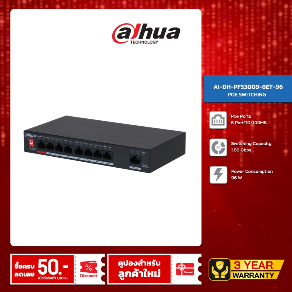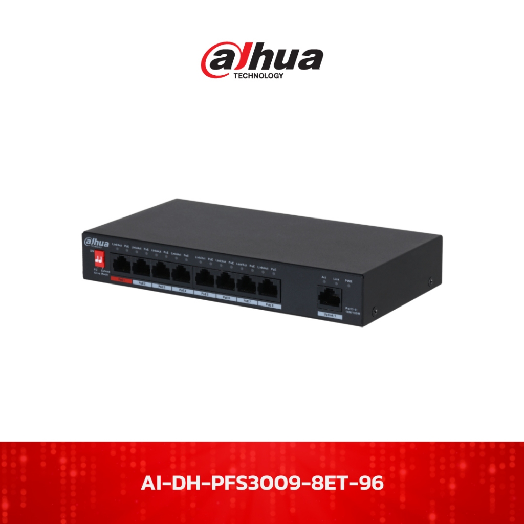 DAHUA POE SWITCHING 8+1 PORT (10/100MB POE) (10/100MB UPLINK) (UNMANAGE) (65W) รุ่น DH-PFS3009-8ET-65