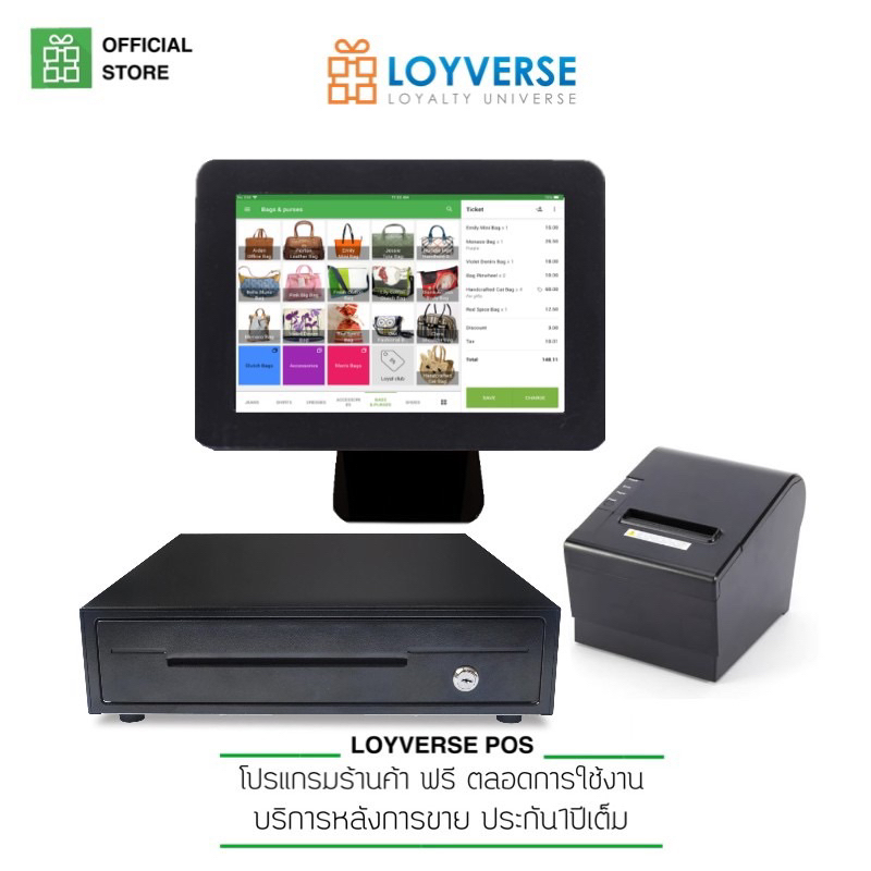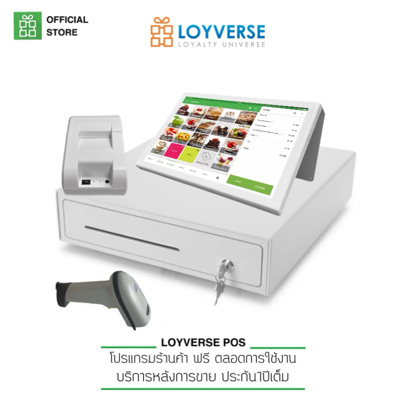 Loyverse POS 10.1″ ขาตั้งโลหะ NEW2025 เครื่องพิมพ์บลูทูธ 58mm สแกนเนอร์บลูทูธ ลิ้นชักเก็บเงินอัตโนมัติ เครื่องแคชเชียร์