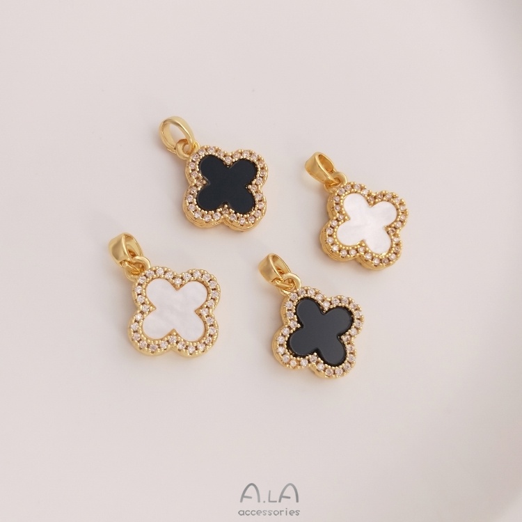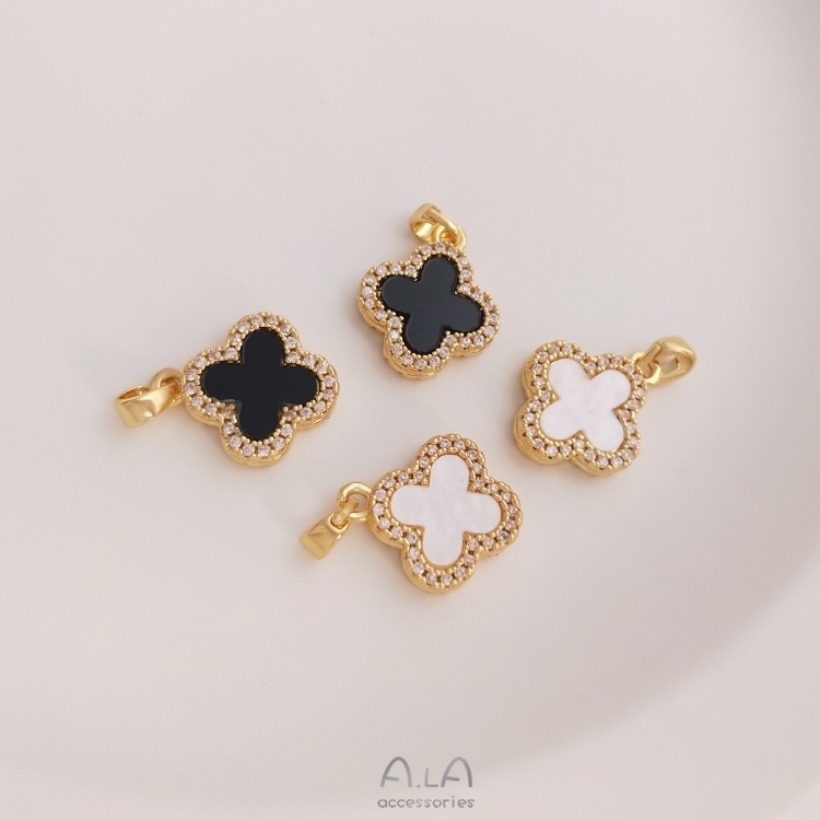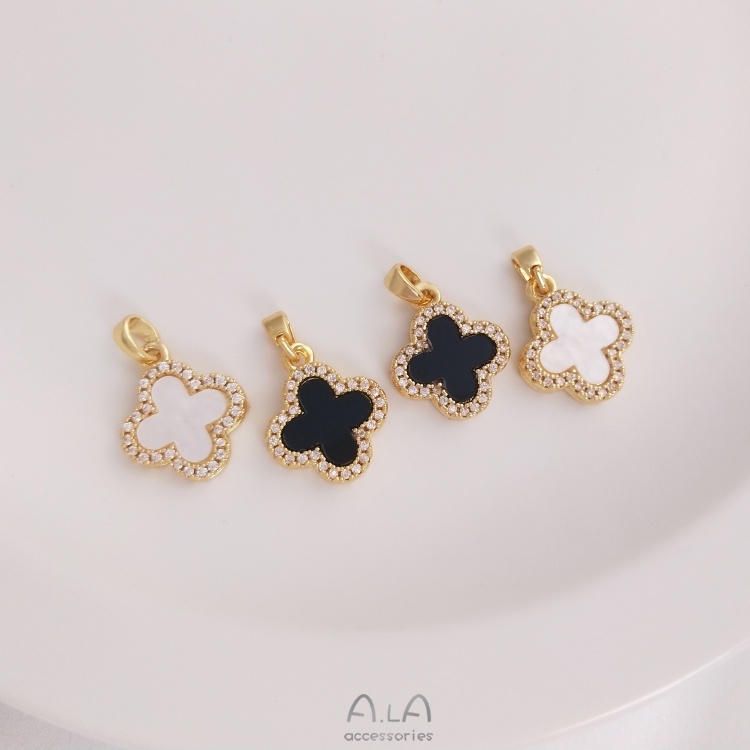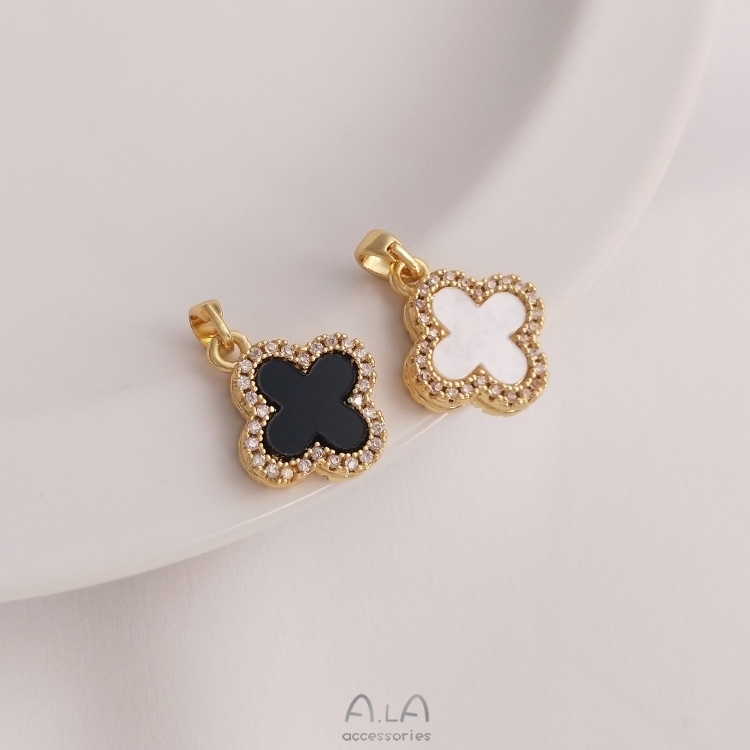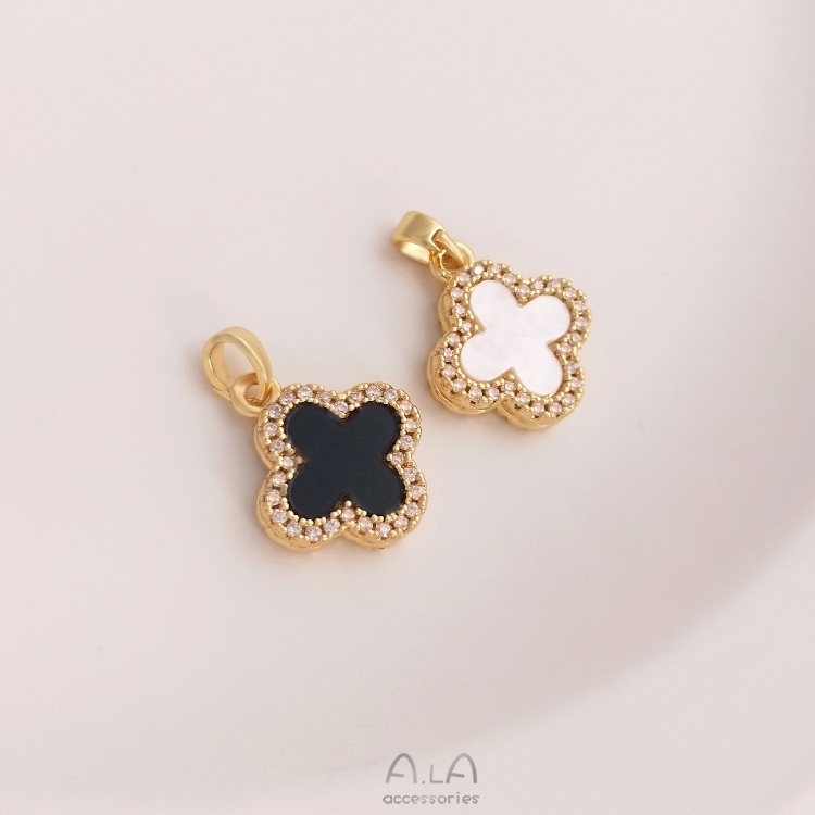 【💖หญ้าสี่ใบจี้💖】เพทายขอบ18Kโคลเวอร์สี่ใบสีทองด้านหนึ่งสีดำสีขาวจี้สร้อยคอหญ้าโชคดีDIYห่วงโซ่กระดูกไหปลาร้าจี้【จี้-3】