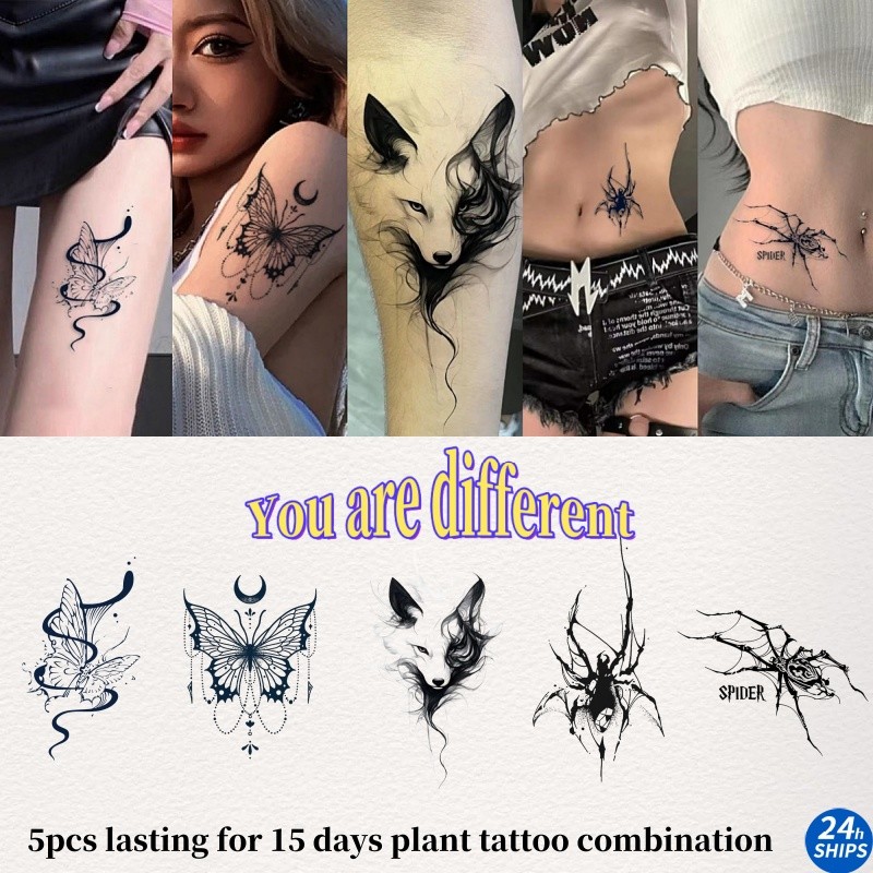 5พีซี สัตว์รูปแบบรวมกันสักสาวเซ็กซี่เอวพืชสักสติกเกอร์รอยสักกันน้ํายาวนาน15วันผิวสติกเกอร์ชั่วคราวสักปลอม