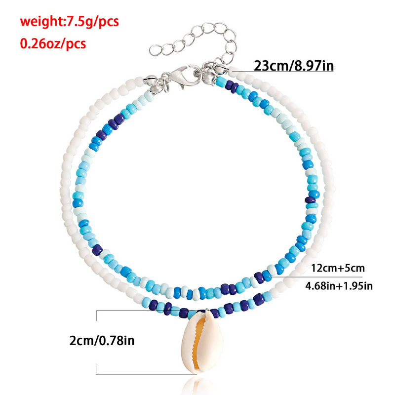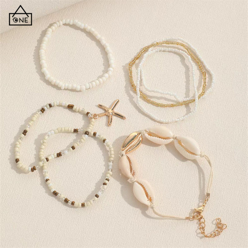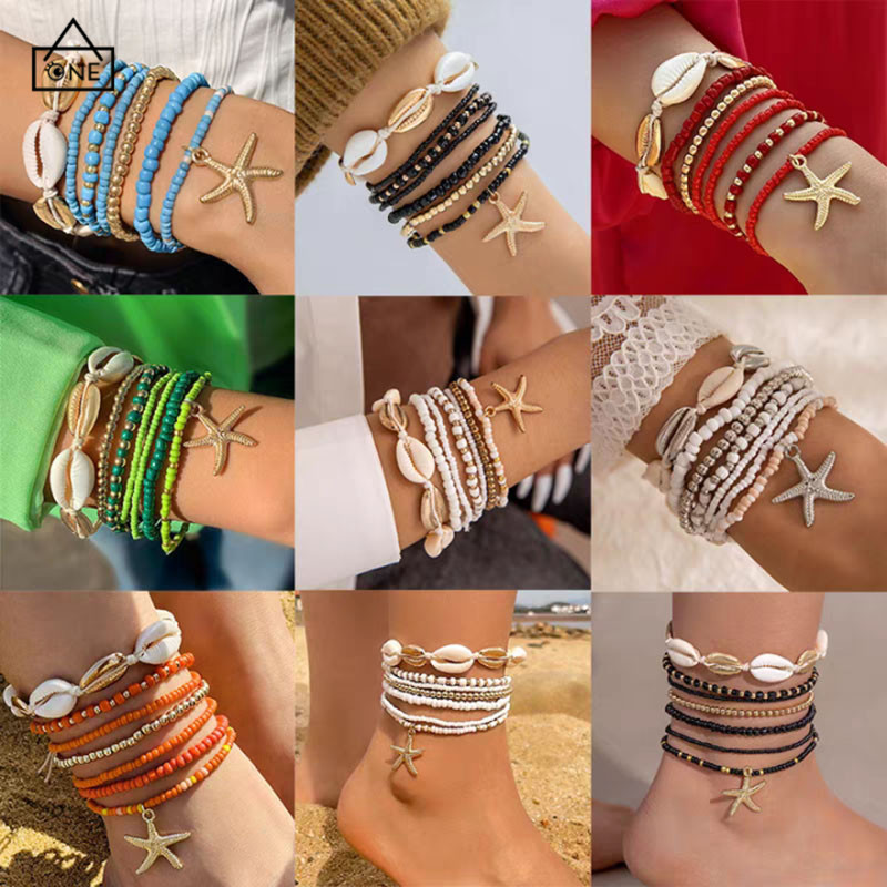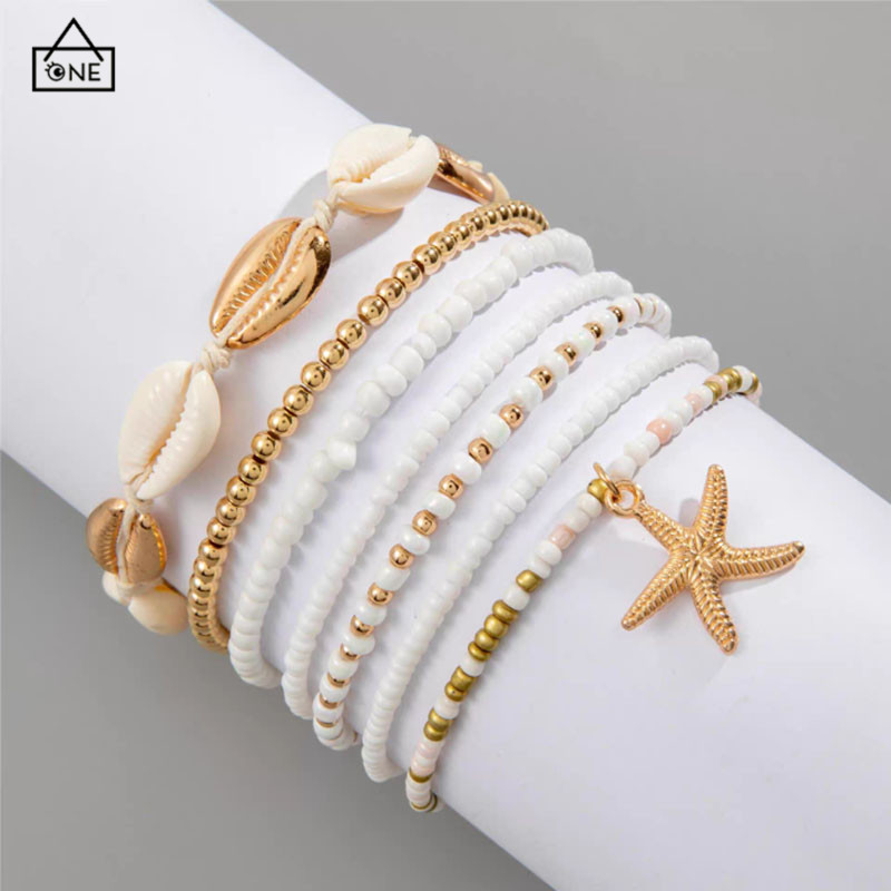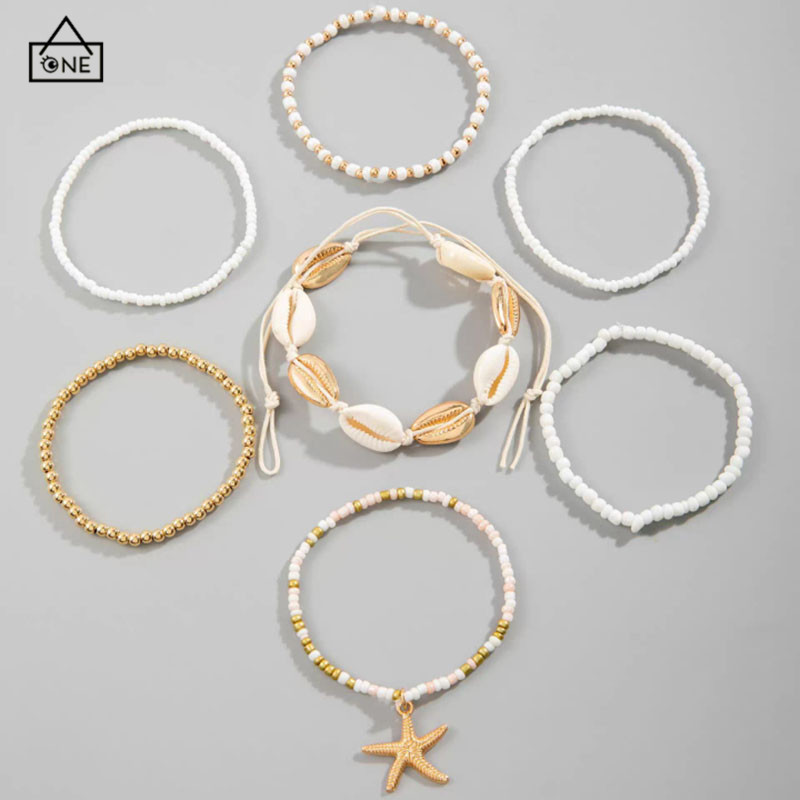 COD❤️ชุดสร้อยข้อเท้าเปลือกหอยชายหาด 7 ชิ้น ลูกปัดข้าวแบบทันสมัย สไตล์เรียบง่าย-a.one