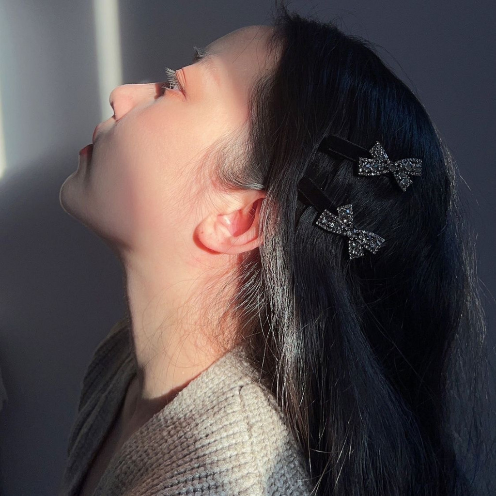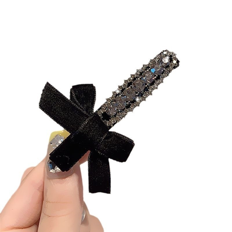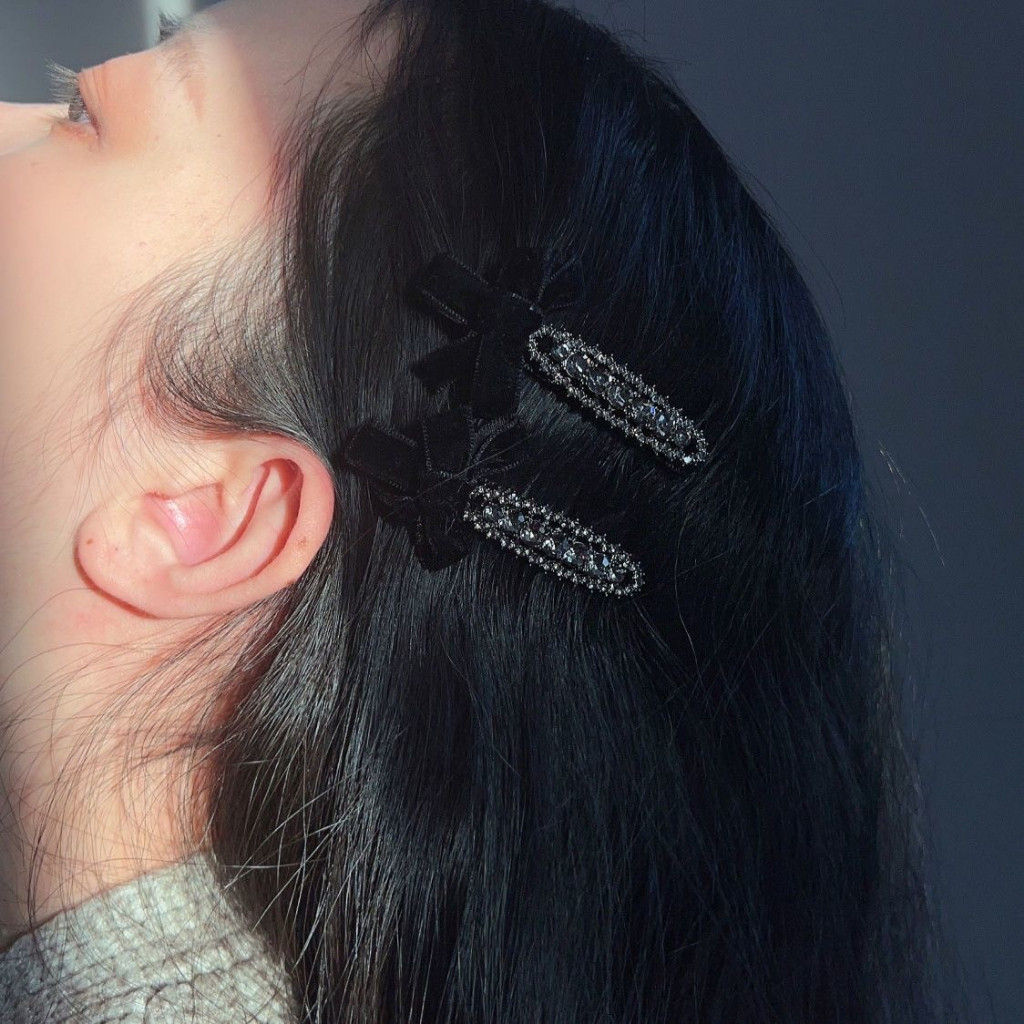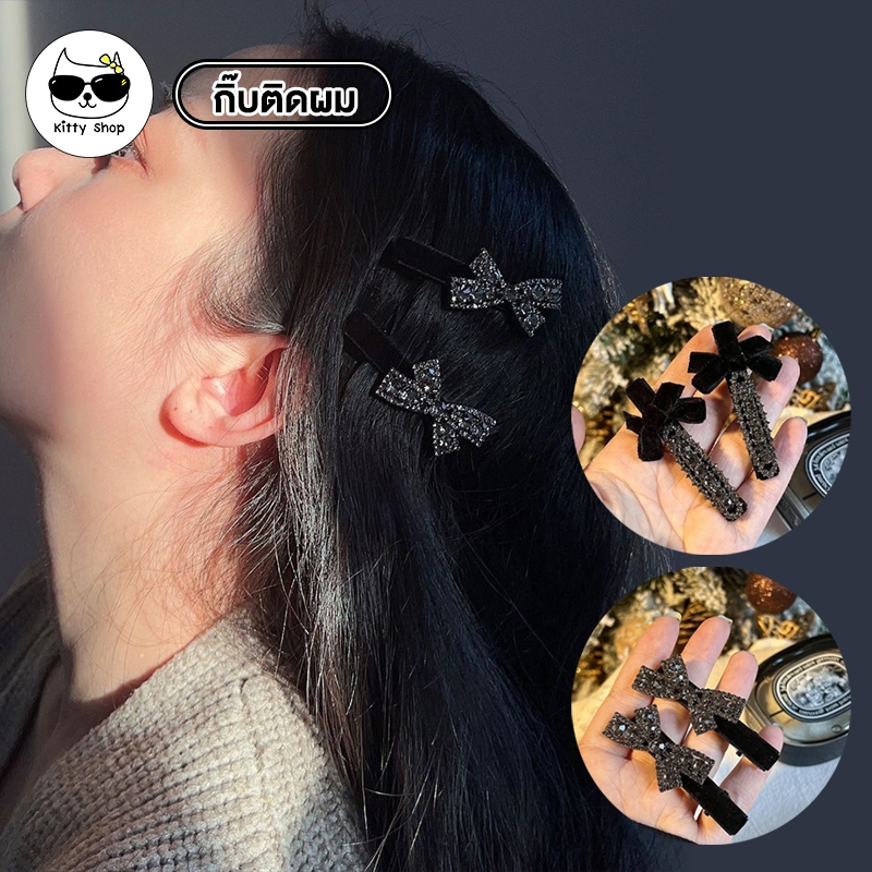 (พร้อมส่งในไทย) กิ๊บติดผม ผ้ากํามะหยี่ ประดับเพชร โบว์ สีดำ สไตล์เกาหลี หรูหรา