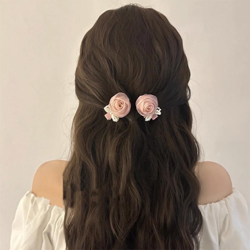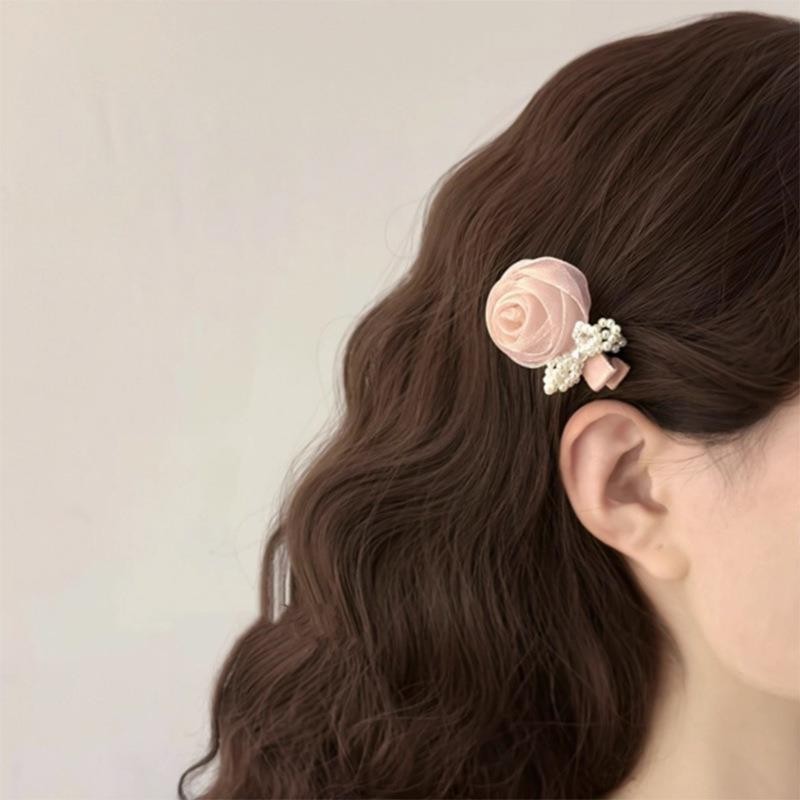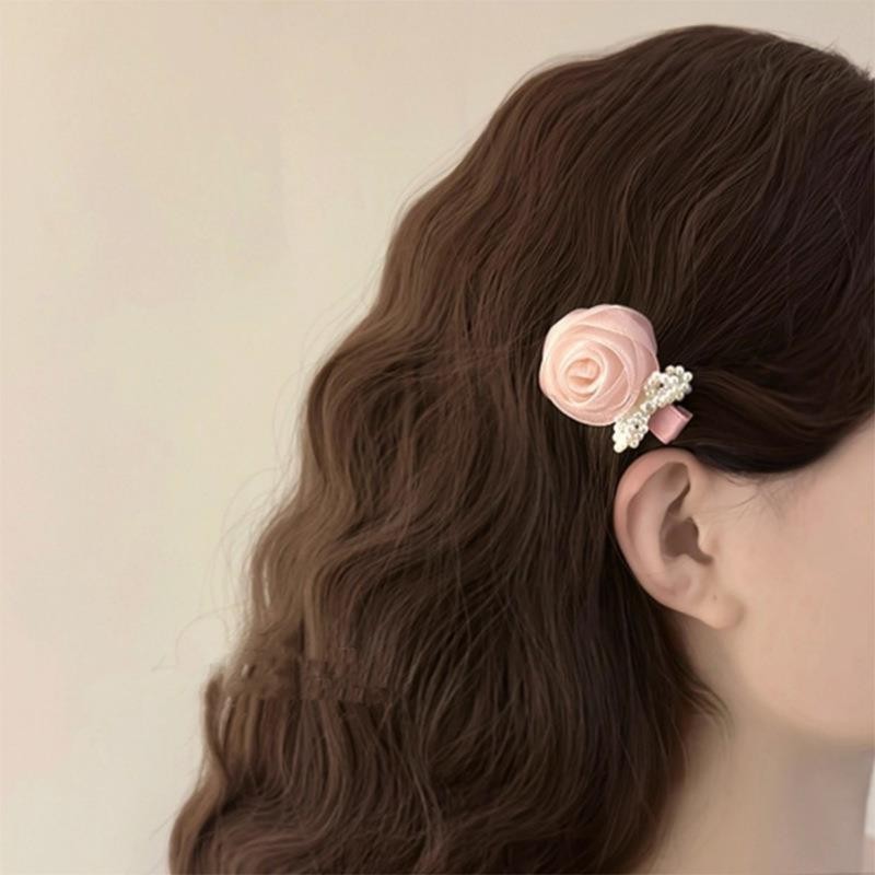 2024 กุหลาบมุกเกาหลีหวานสีชมพูกุหลาบกิ๊บเครื่องประดับผมดอกไม้สามมิติ