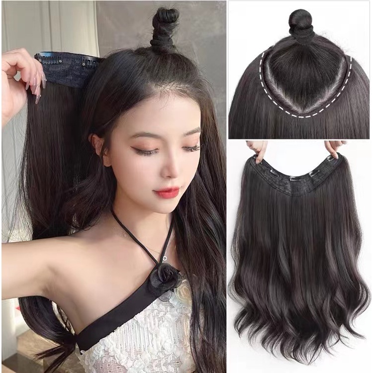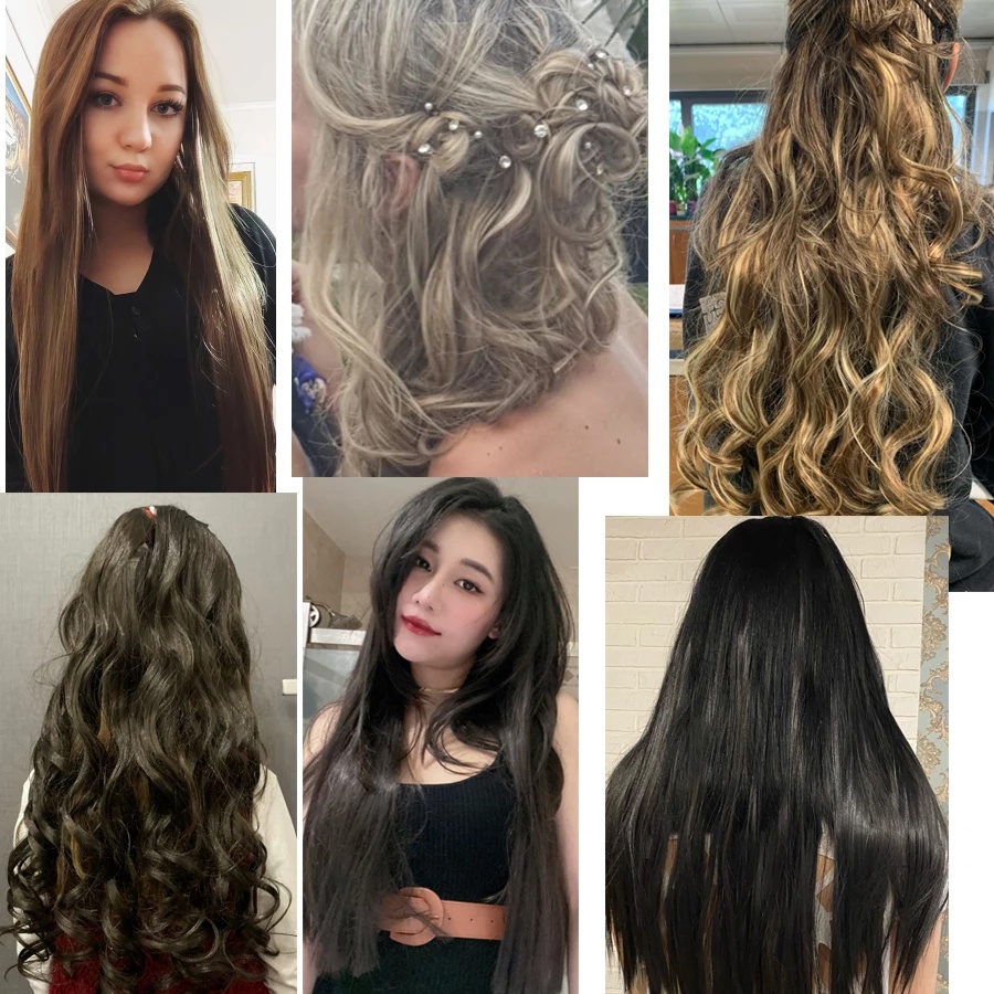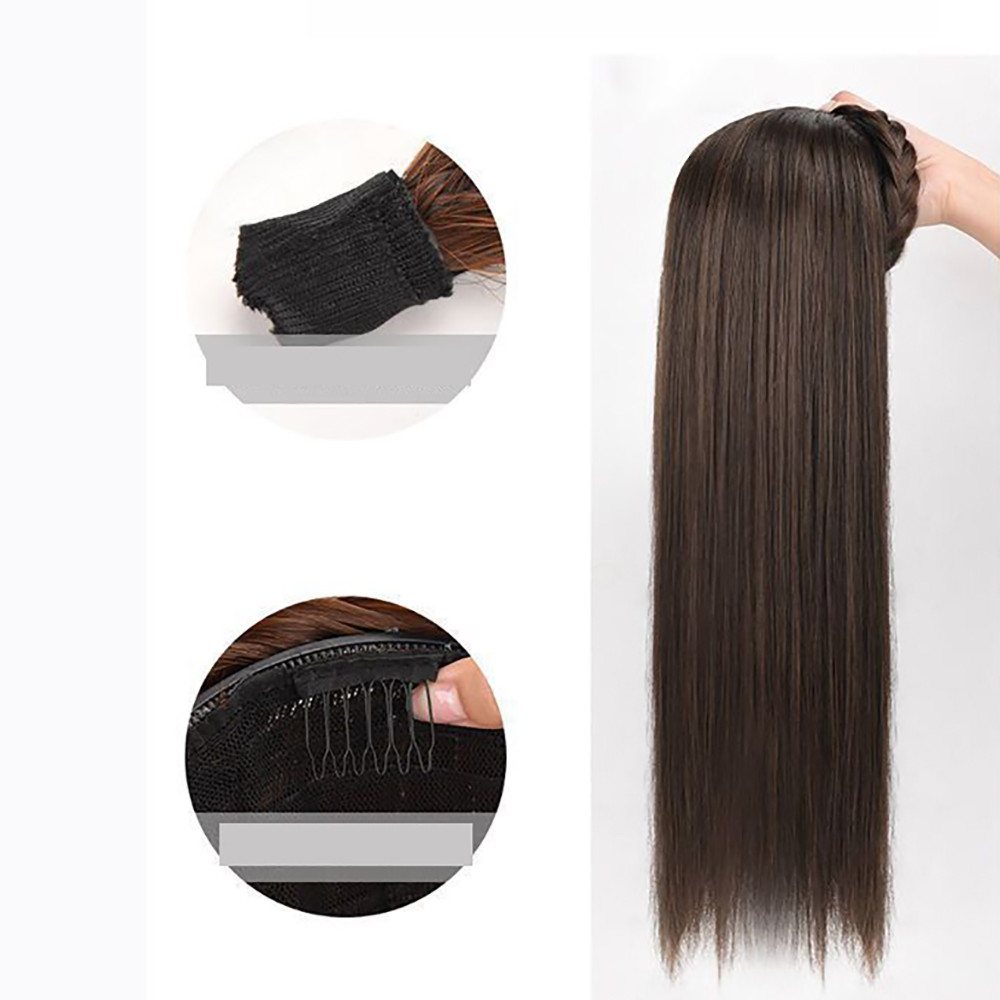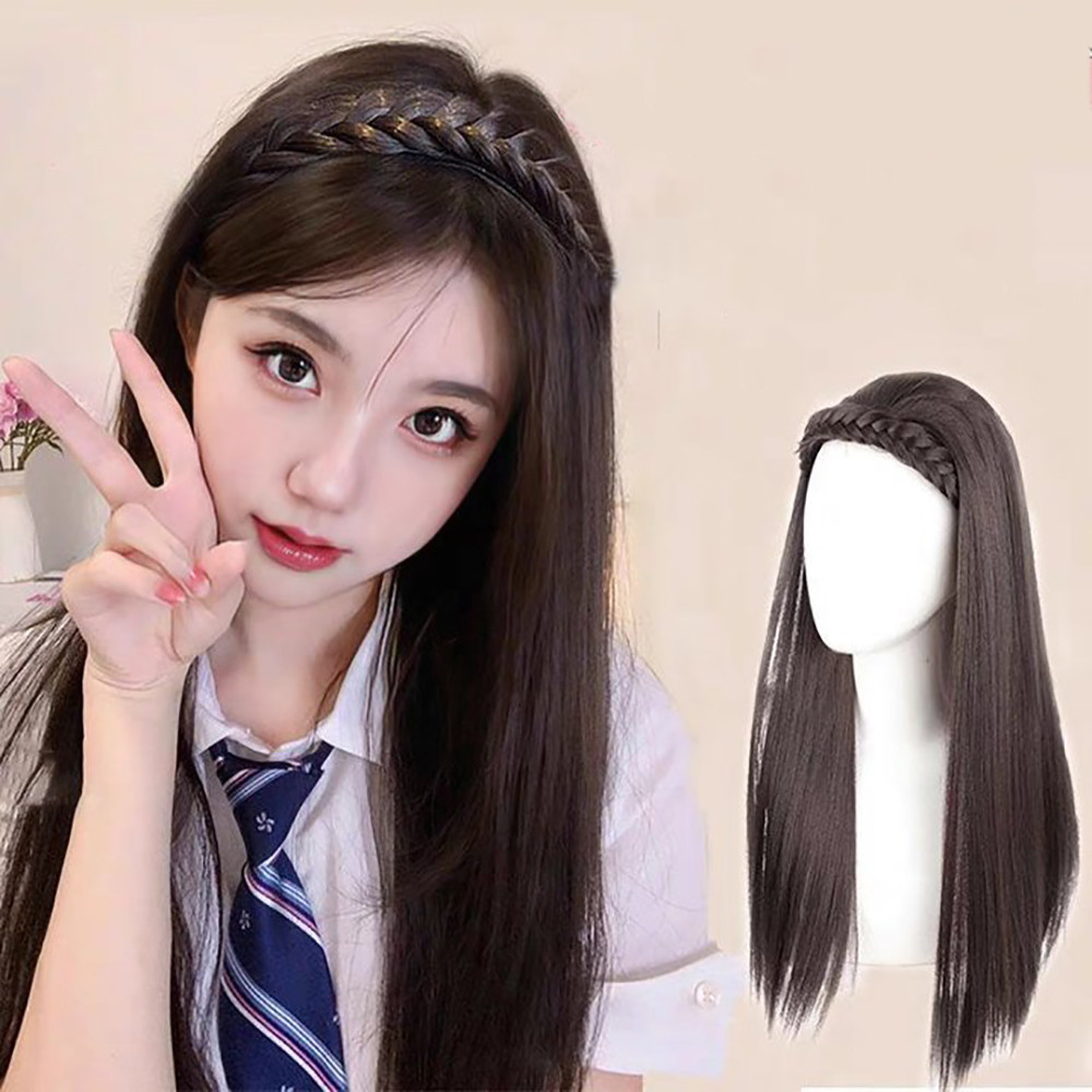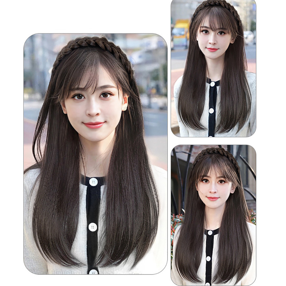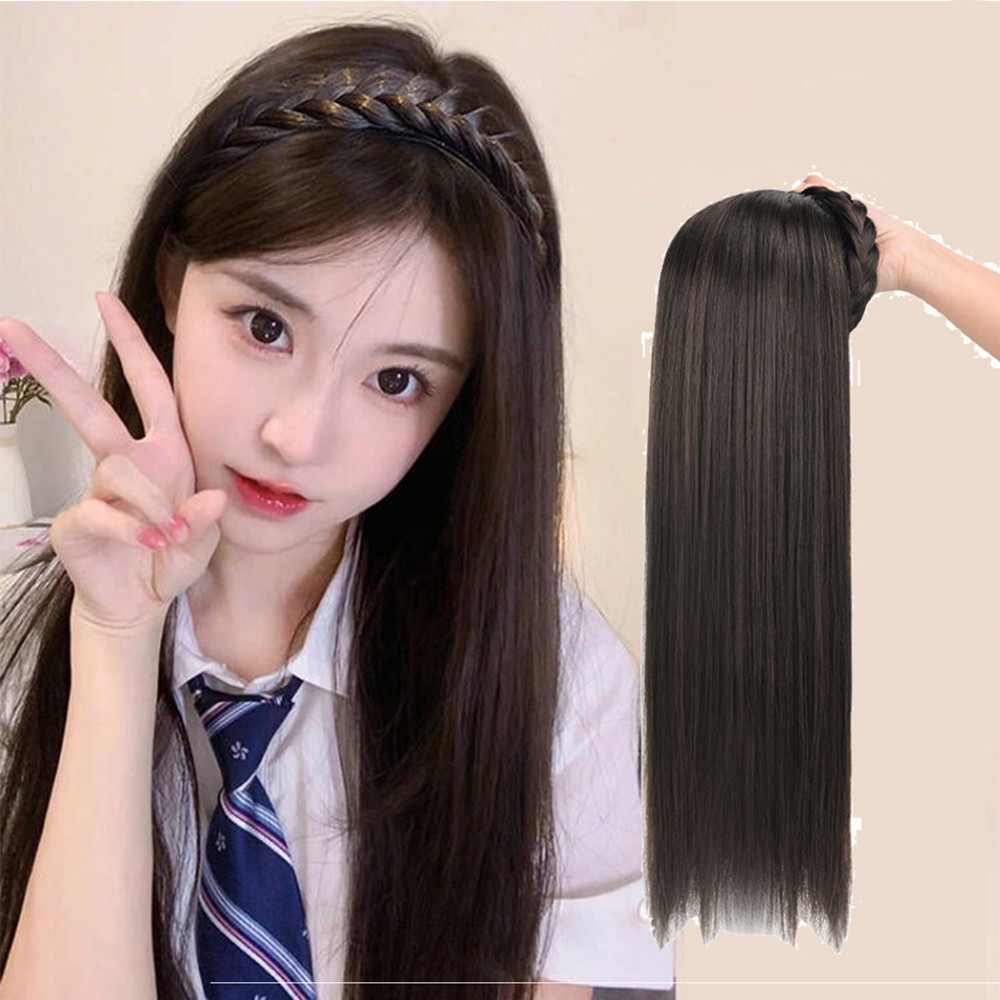 แฟชั่นผู้หญิงไม่มีรอยต่อยาวตรงแถบคาดศีรษะวิกผมจําลองครึ่งผูกหัวปก