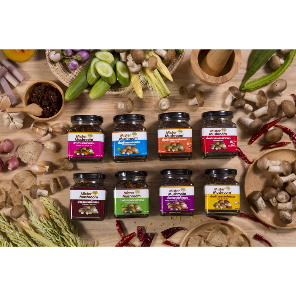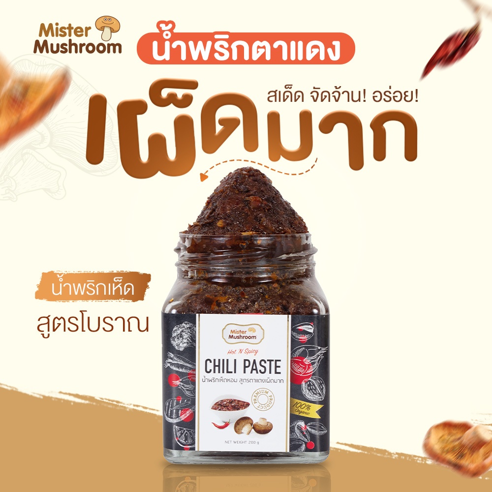 (Mister Mushroom) น้ำพริกเห็ดหอม สูตรตาแดงเผ็ดมาก ตรามิสเตอร์มัชรูม ขนาด 200 กรัม (วังน้ำเขียวฟาร์ม)