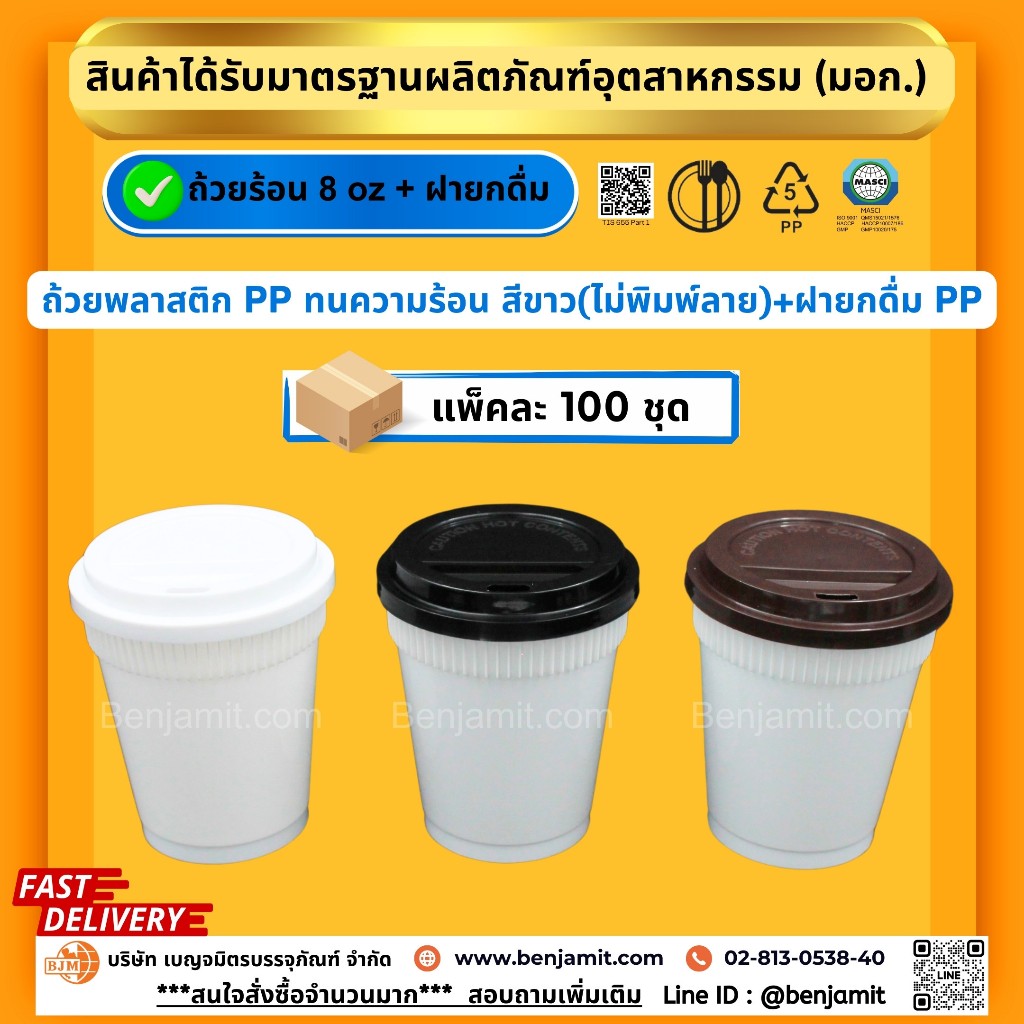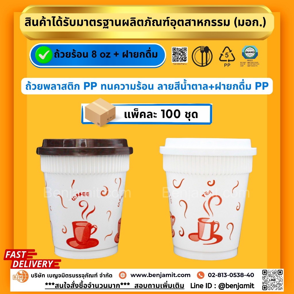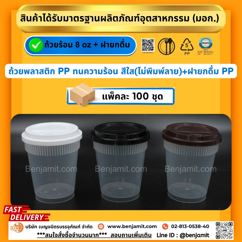 BJM ถ้วยกาแฟร้อน ถ้วยเครื่องดื่มร้อน ถ้วยพลาสติกPP ขนาด 8 oz + ฝายกดื่ม(PP)/1แพ็ค บรรจุ 100 ชุด