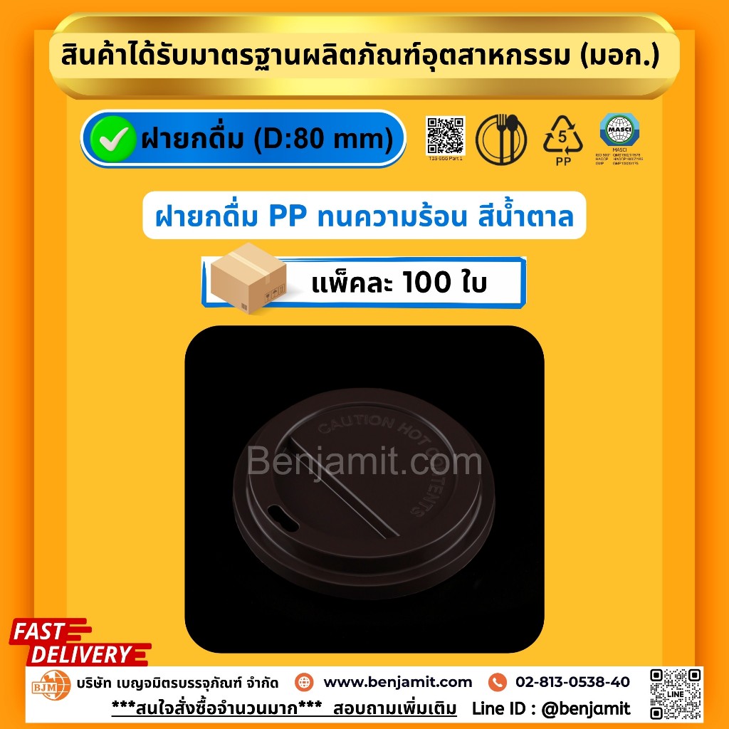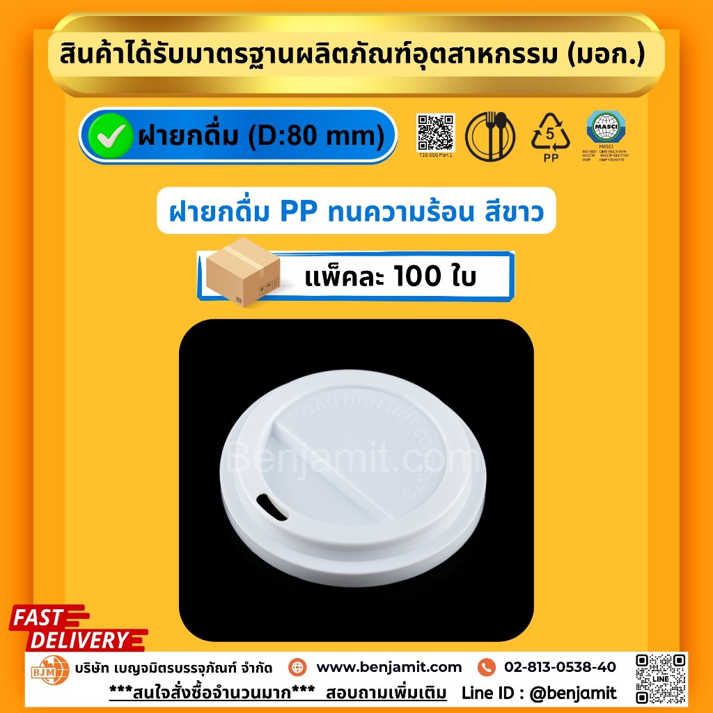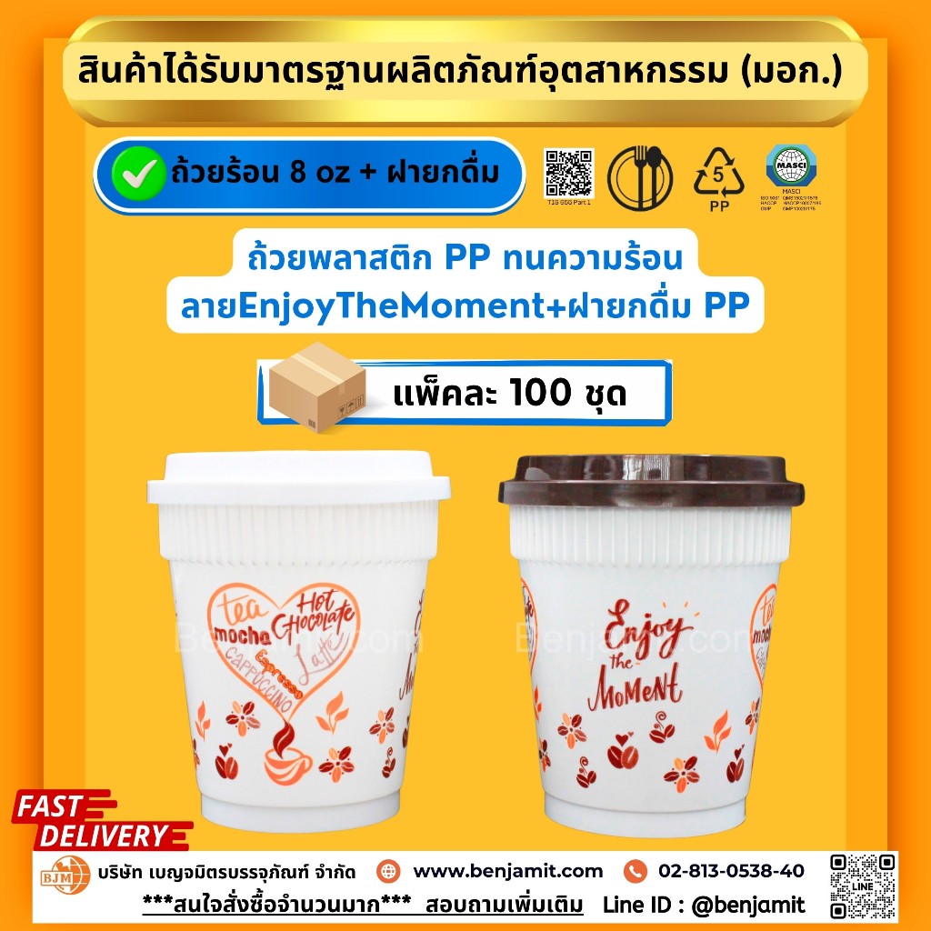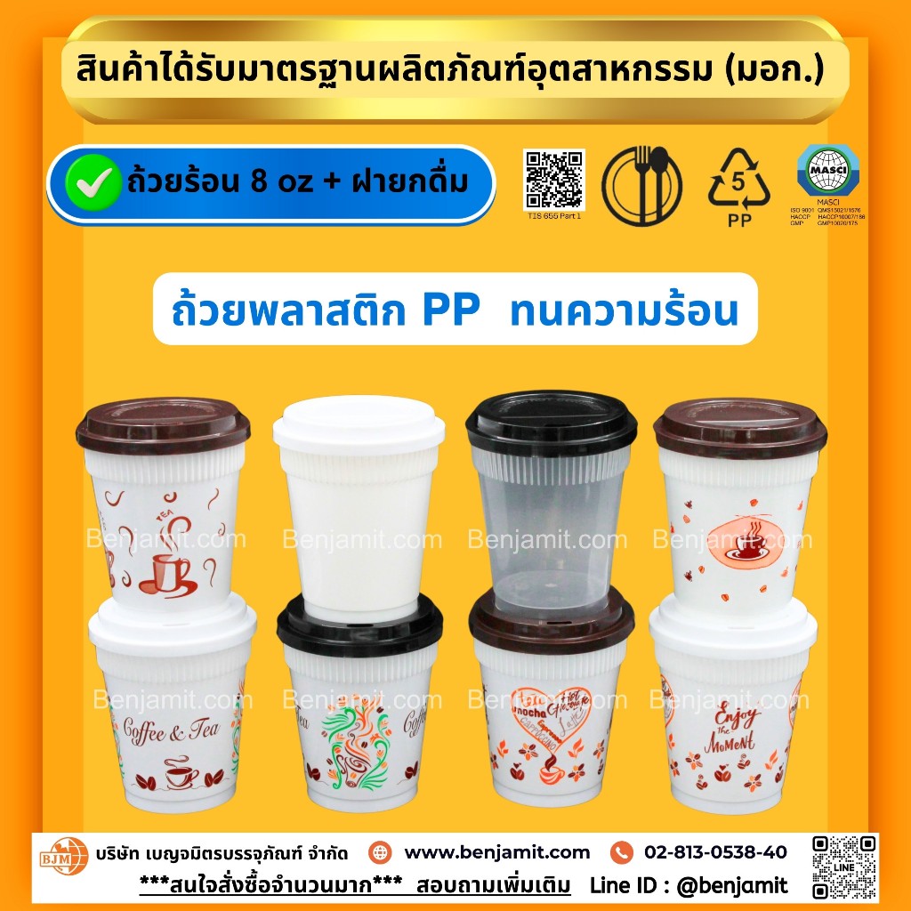 BJM ถ้วยกาแฟร้อน ถ้วยเครื่องดื่มร้อน ถ้วยพลาสติกPP ขนาด 8 oz + ฝายกดื่ม(PP)/1แพ็ค บรรจุ 100 ชุด