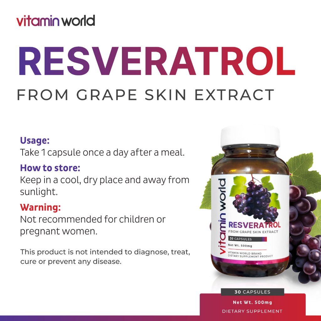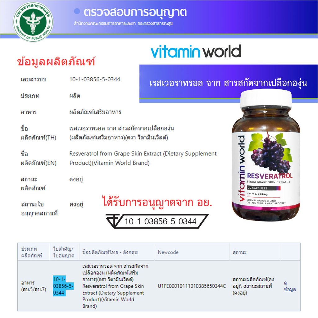 เรสเวอราทรอล วิตามินเวิลด์ x 1 ขวด สารสกัดจากเปลือกองุ่น Resveratrol from Grape Skin Extract Vitamin World ซิงค์ Zinc