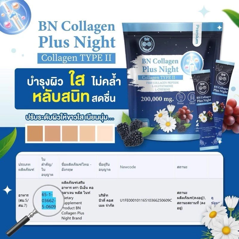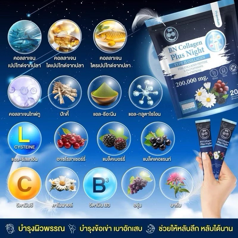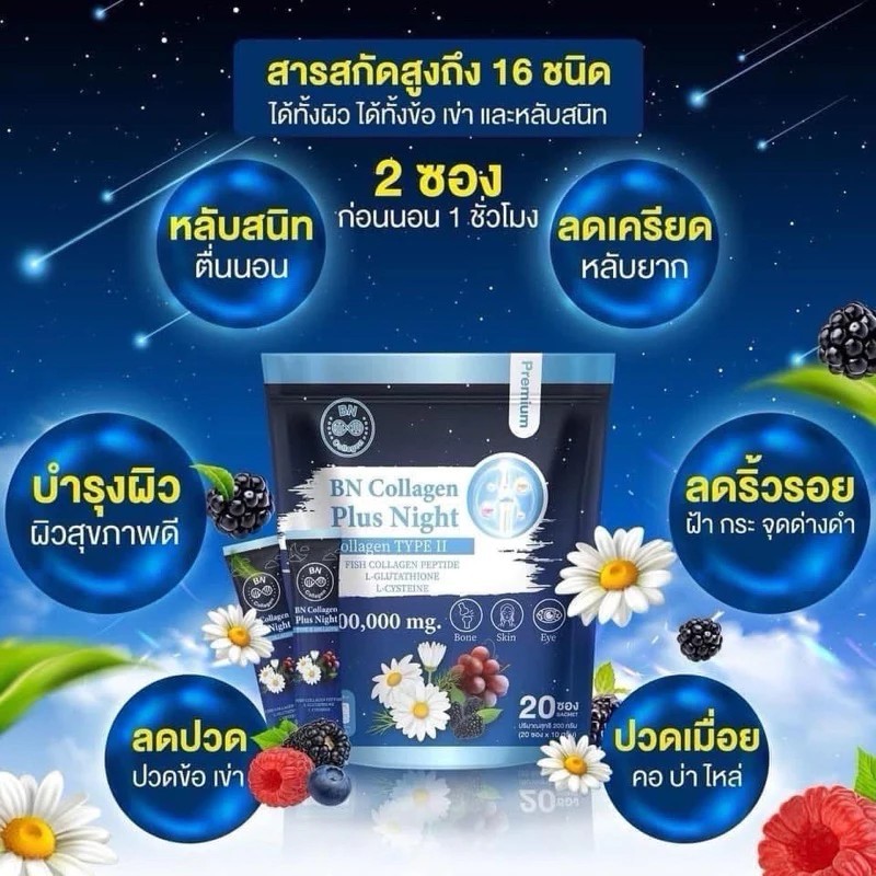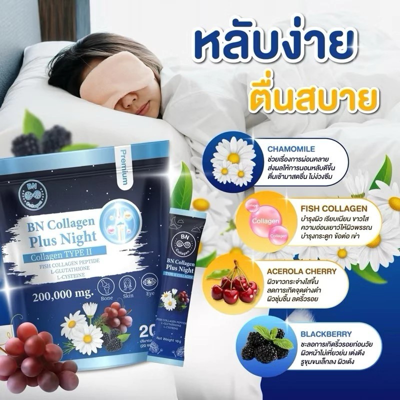 โปรทดลองทาน 1 ห่อ ( 20 ซอง ) BN Plus Night Collagen บีเอ็น ไนท์ พลัส คอลลาเจน ช่วยหลับ ผิวดี บำรุง ไขข้อ กระดูก
