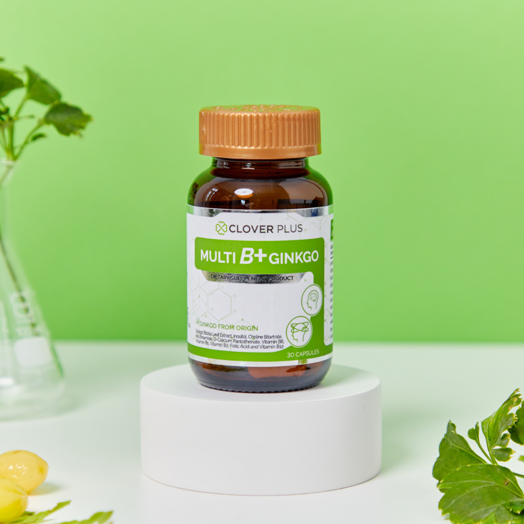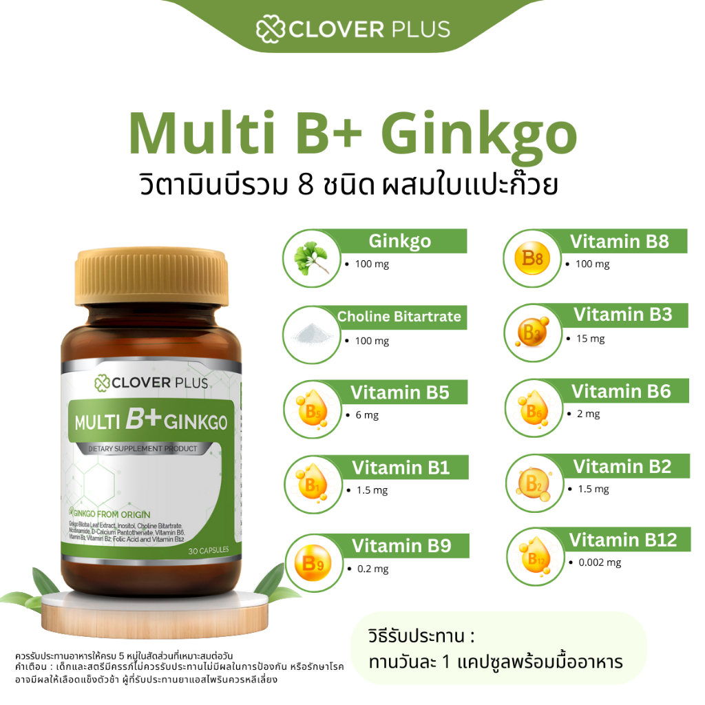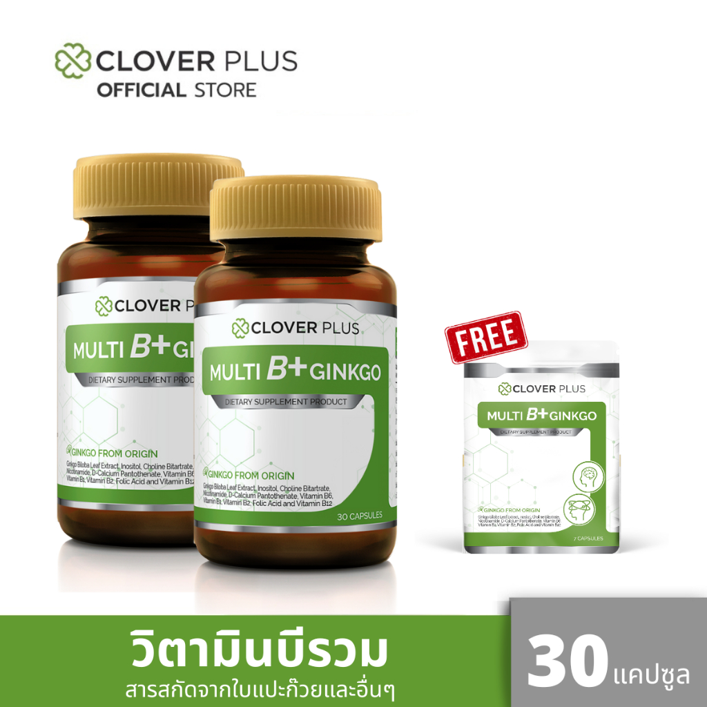 Clover Plus Multi B Plus Ginkgo 30 แคปซูล X 2 (แถม Multi B Plus Ginkgo 1 ซอง) สารสกัดจากใบแป๊ะก๊วย วิตามินบีรวม