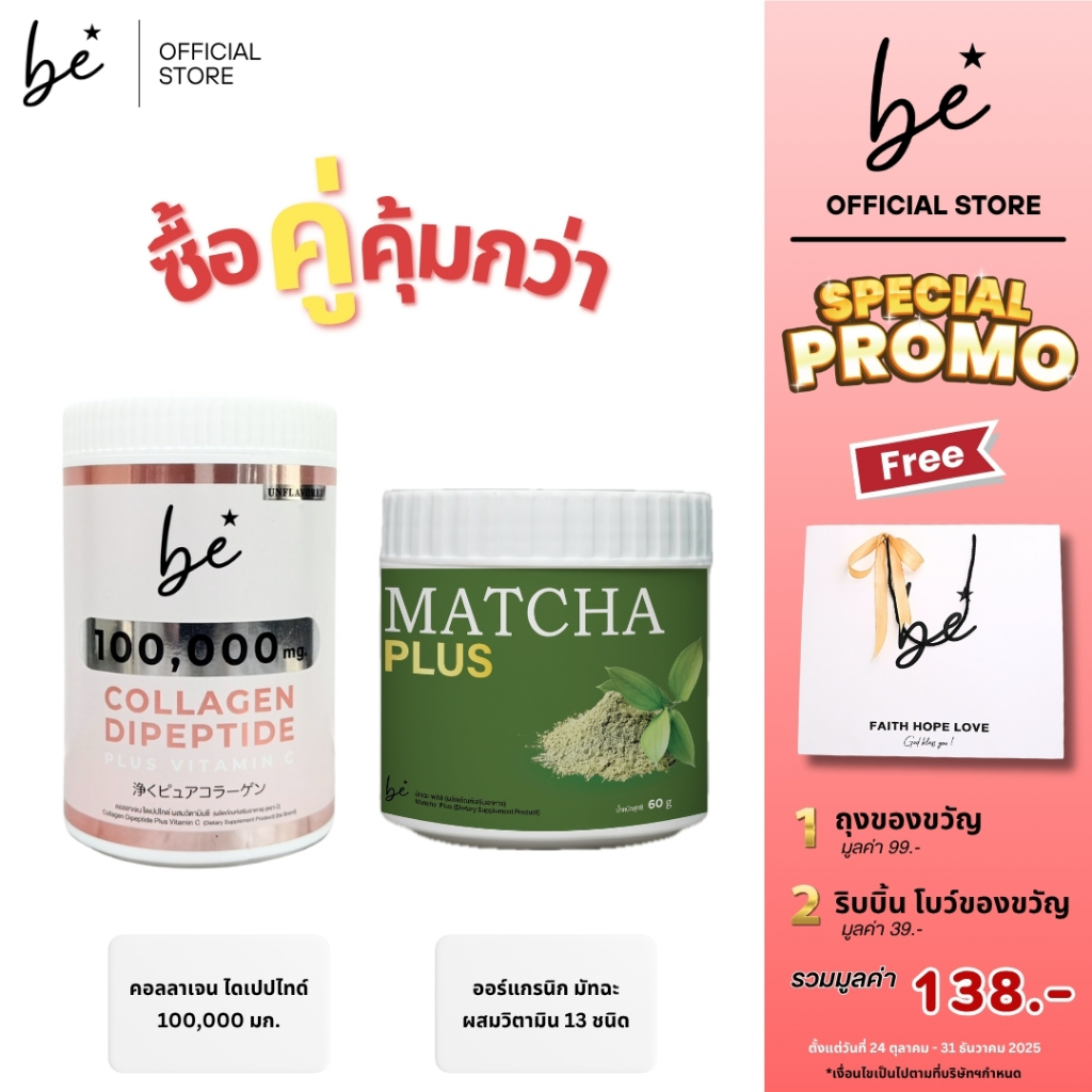 (บี คอลลาเจน 100 g. + บี มัทฉะ พลัส) ฟรี ถุงของขวัญ + ริบบิ้น เซ็ทซื้อคู่คุ้มกว่า