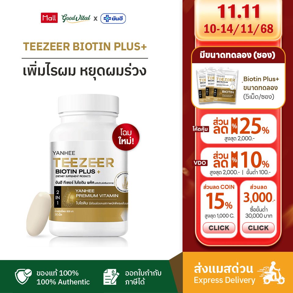 (ส่งแมสทันที) ยันฮี ไบโอติน พลัส Yanhee Teezeer Biotin Plus+ สูตรเข้มข้น ลดผมขาดหลุดร่วง (30เม็ด)