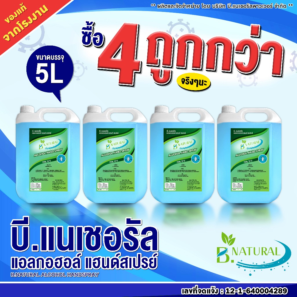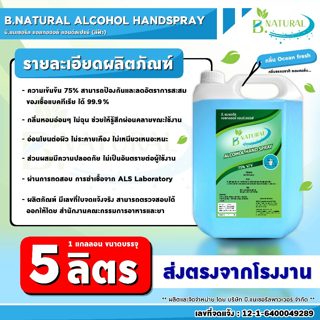 แอลกอฮอล์ แฮนด์สเปร์ย B. NATURAL 75% สีฟ้า ขนาด 5 ลิตร (4แกลลอน) กลิ่น Ocean Fresh