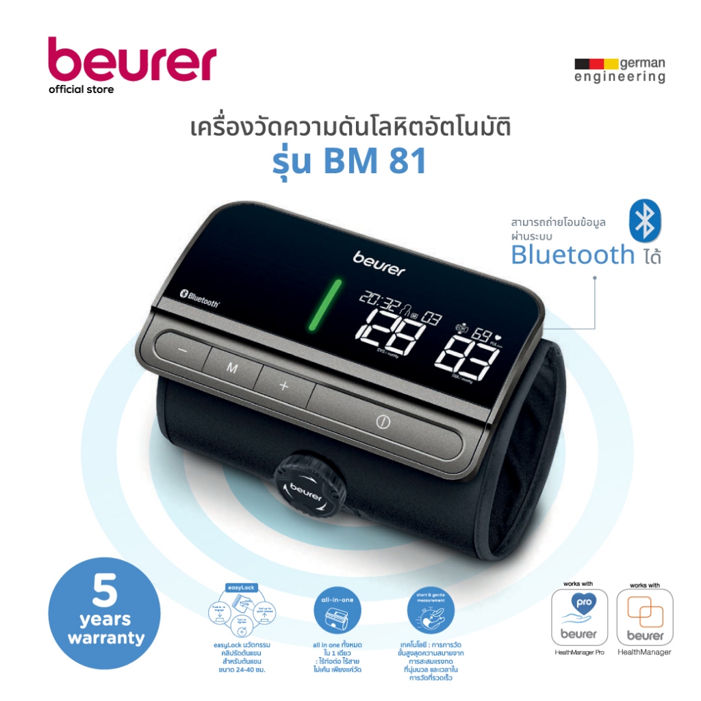 Beurer เครื่องวัดความดันโลหิตที่ต้นแขน ไร้สาย มาตรฐานเยอรมัน cuff Size ใหญ่ รุ่น BM81 [ ประกันศูนย์ 5 ปี ]