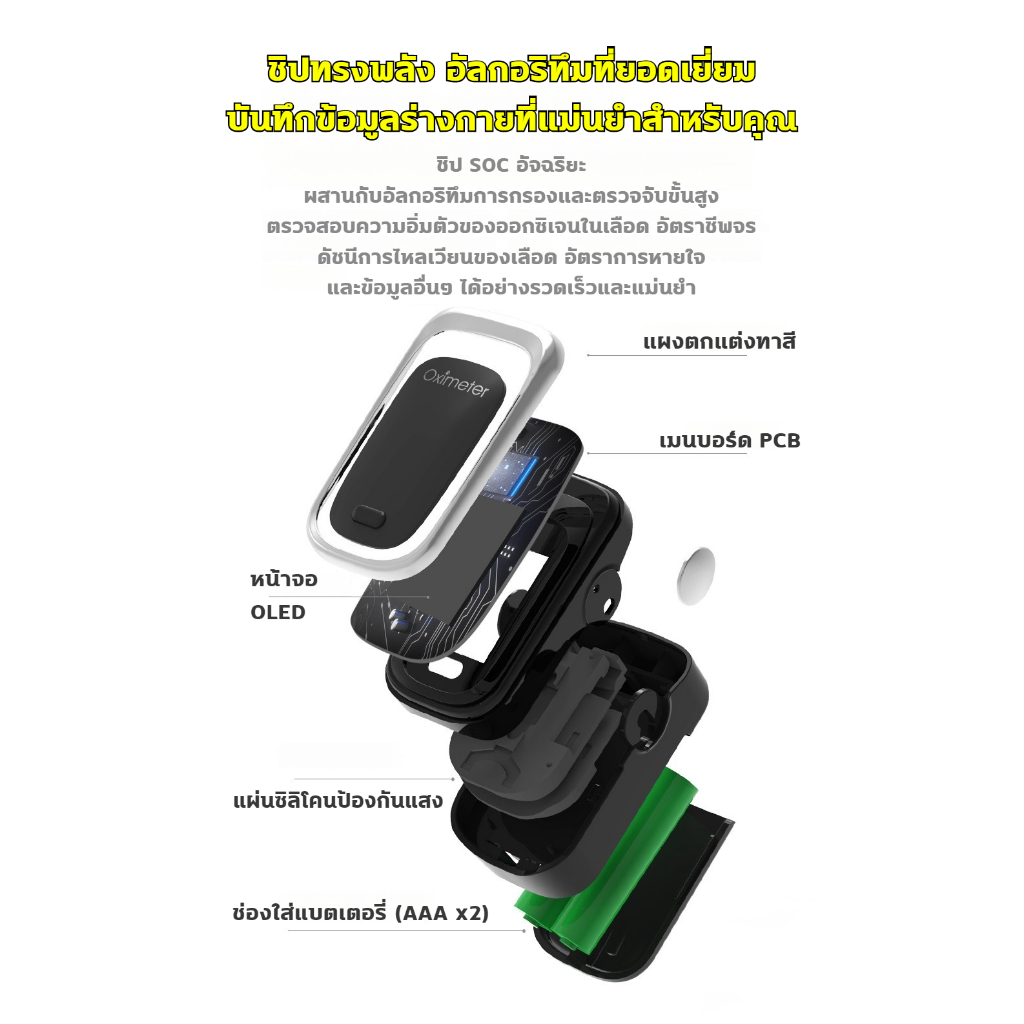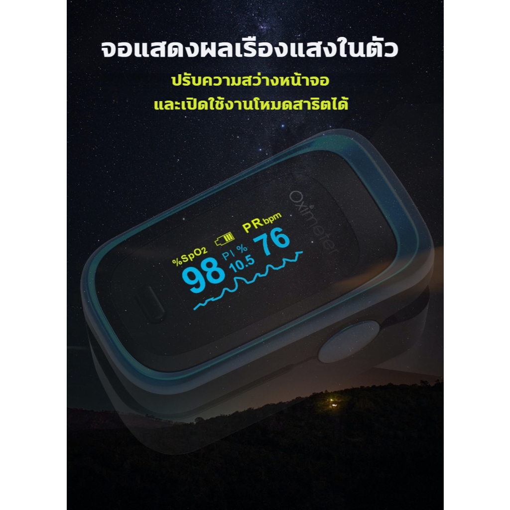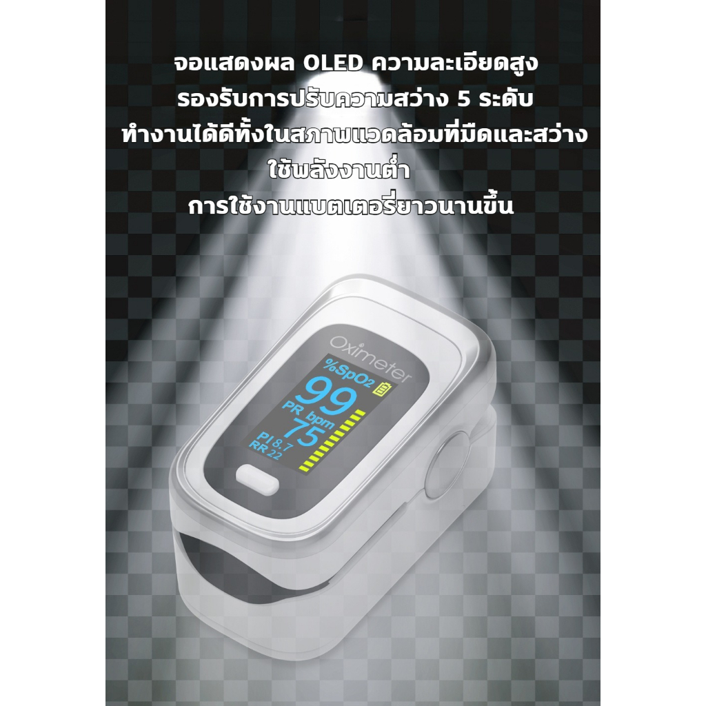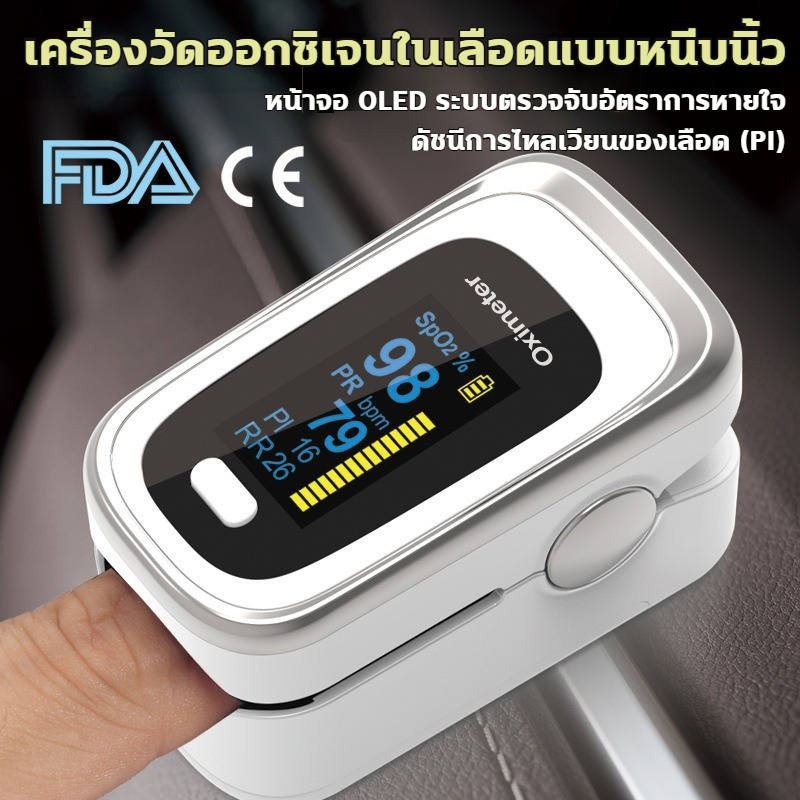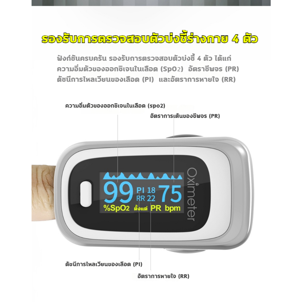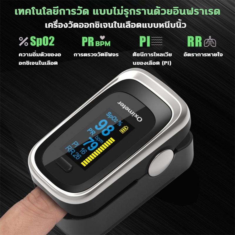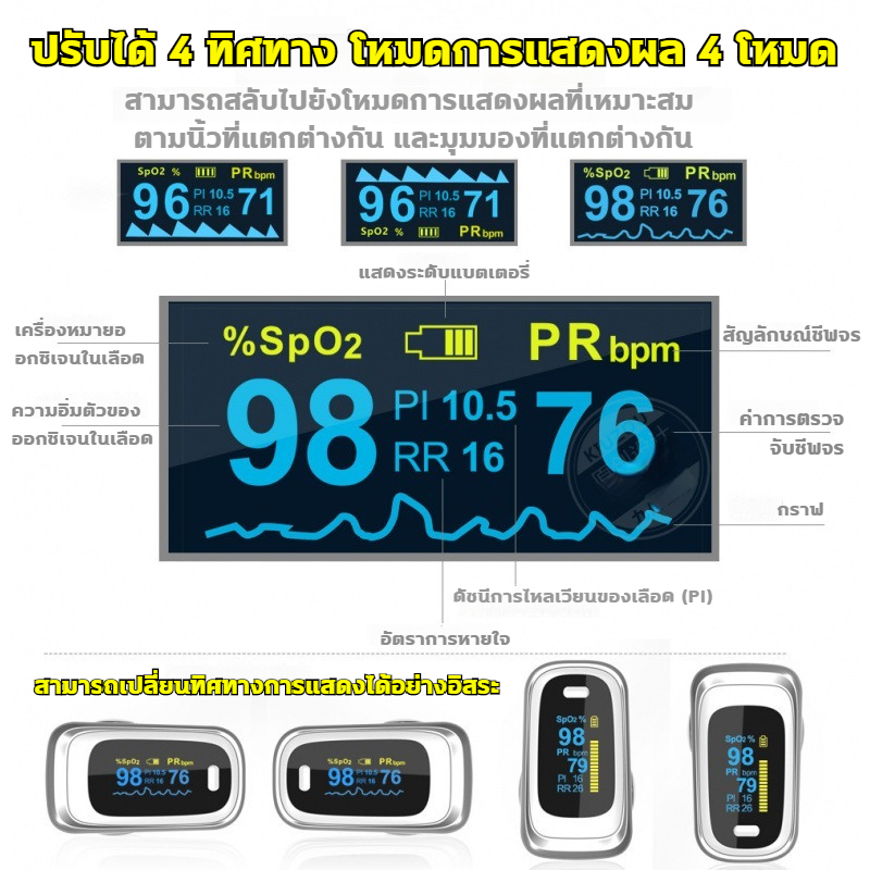 เครื่องวัดออกซิเจน ปลายนิ้ว 4 ฟังก์ชัน อัตราการหายใจ RR จอOLED 6โหมด ปรับได้4ทิศทาง อัตราการเต้นของหัวใจจอ มีแบตเตอรี่
