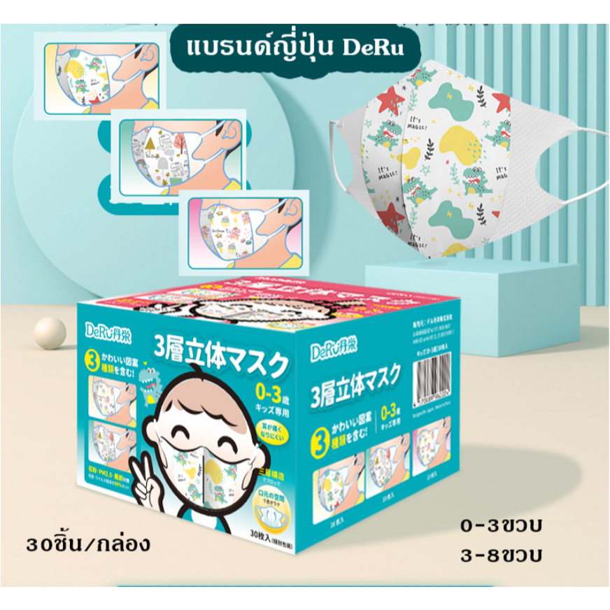 (🇹🇭พร้อมส่ง) แบรนด์ญี่ปุ่น DeRu แมสเด็ก0-3ขวบ/3-8ขวบ หน้ากากเด็ก 3D 30ชิ้น/กล่อง พร้อมส่ง