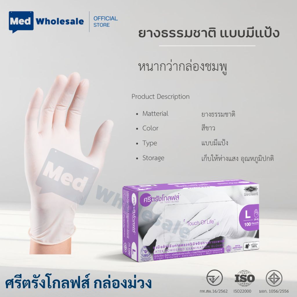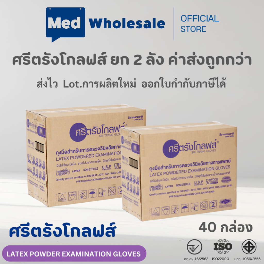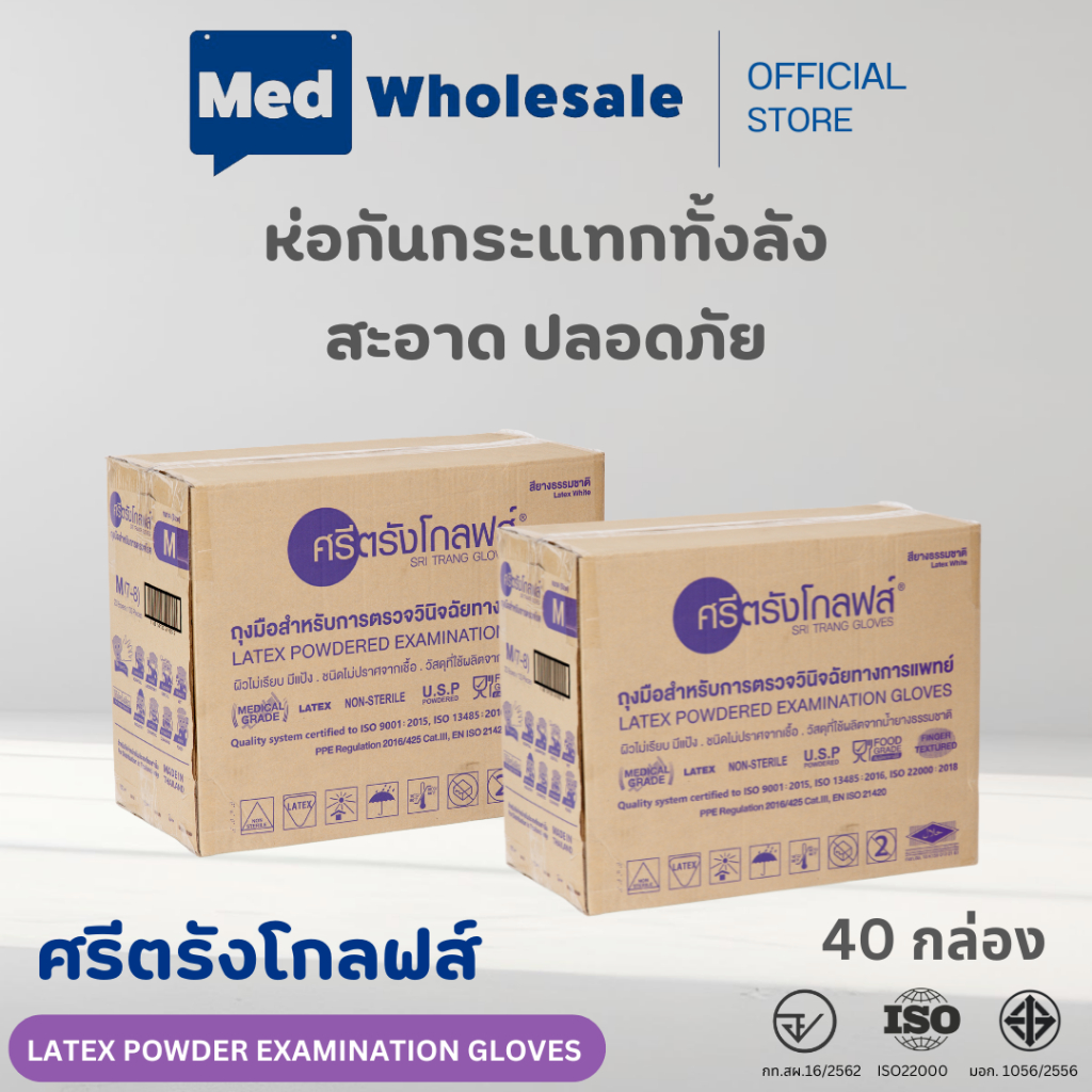 (ยก 2ลัง ค่าส่งถูก) ถุงมือศรีตรังโกลฟส์ กล่องม่วง แบบมีแป้ง ผลิตจากยางธรรมชาติ 40 กล่อง / ลัง