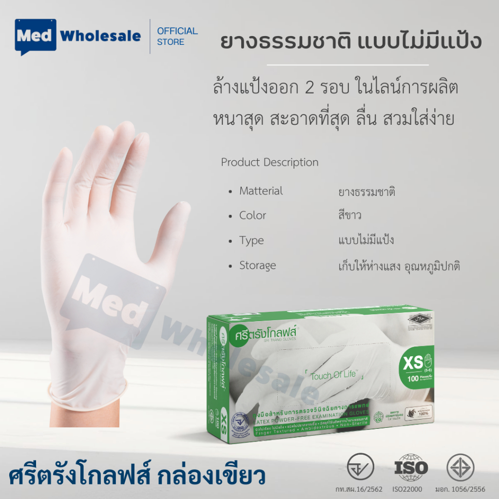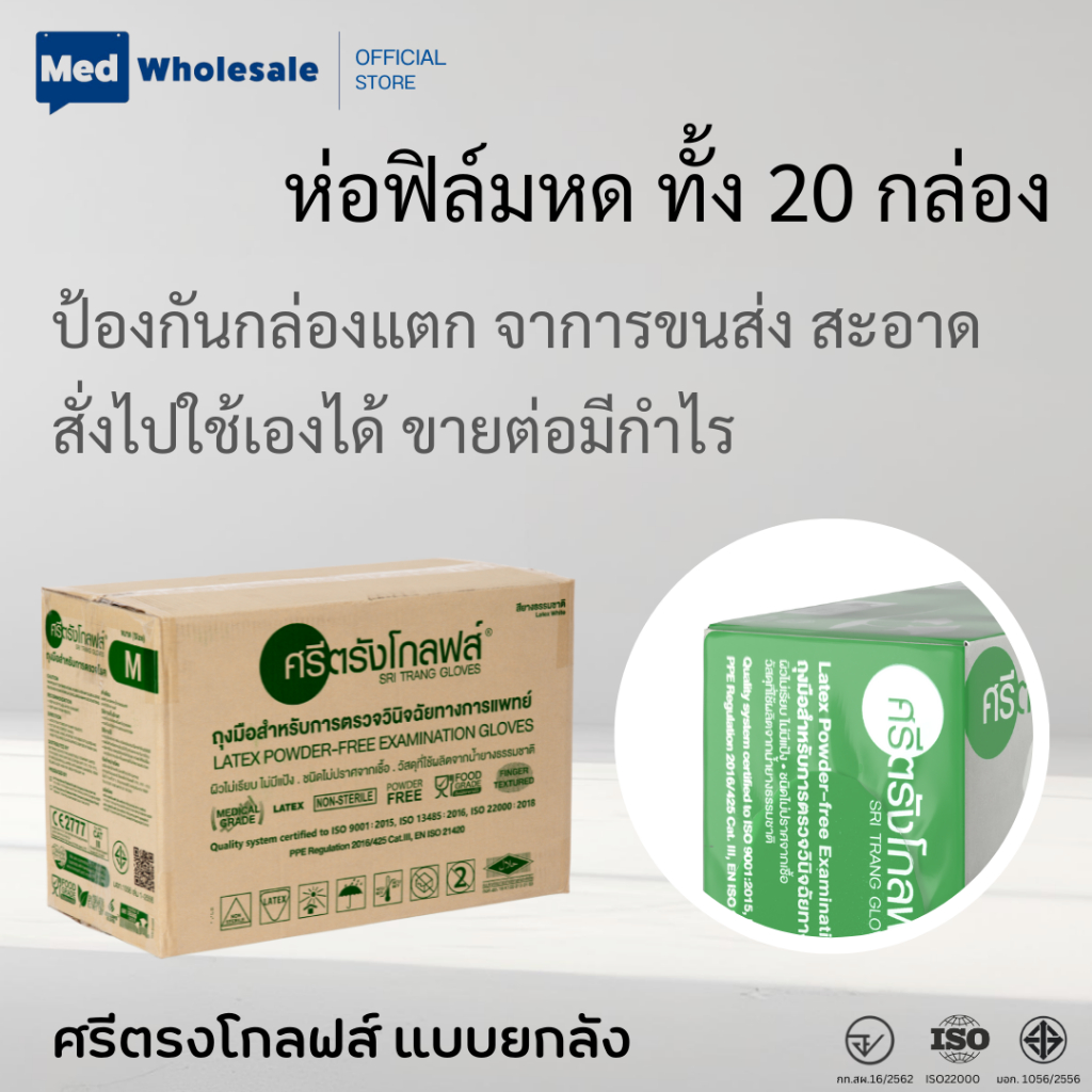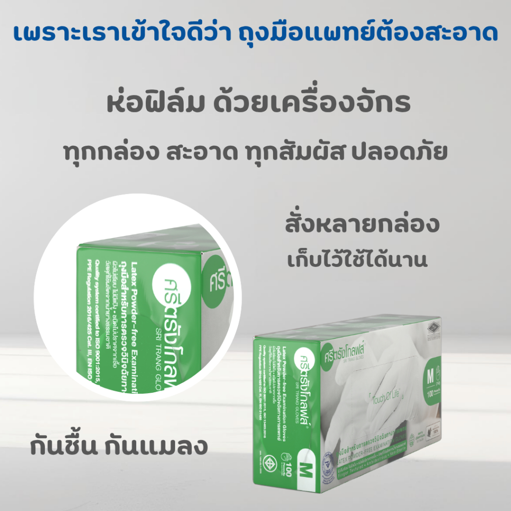 ( ยกลัง ห่อฟิล์มทุกกล่อง ) ถุงมือศรีตรังโกลฟส์ SRITRANG กล่องเขียว แบบไม่มีแป้ง ผลิตจากยางธรรมชาติ ออกใบกำกับได้