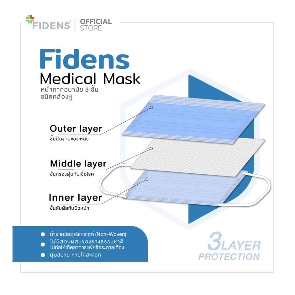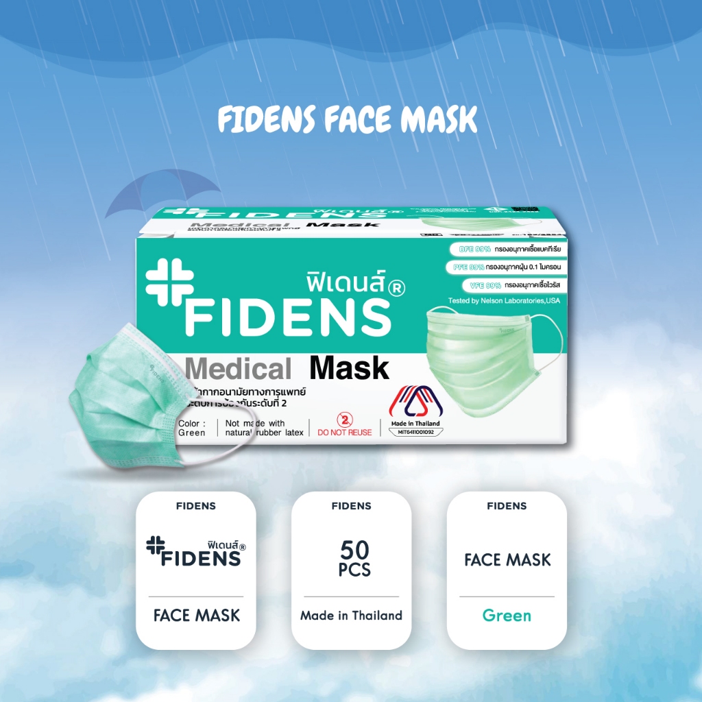 FIDENS FACE MASK 3 PLYฟิเดนส์ หน้ากากอนามัยทางการแพทย์ 3 ชั้นสีเขียว 3 กล่อง