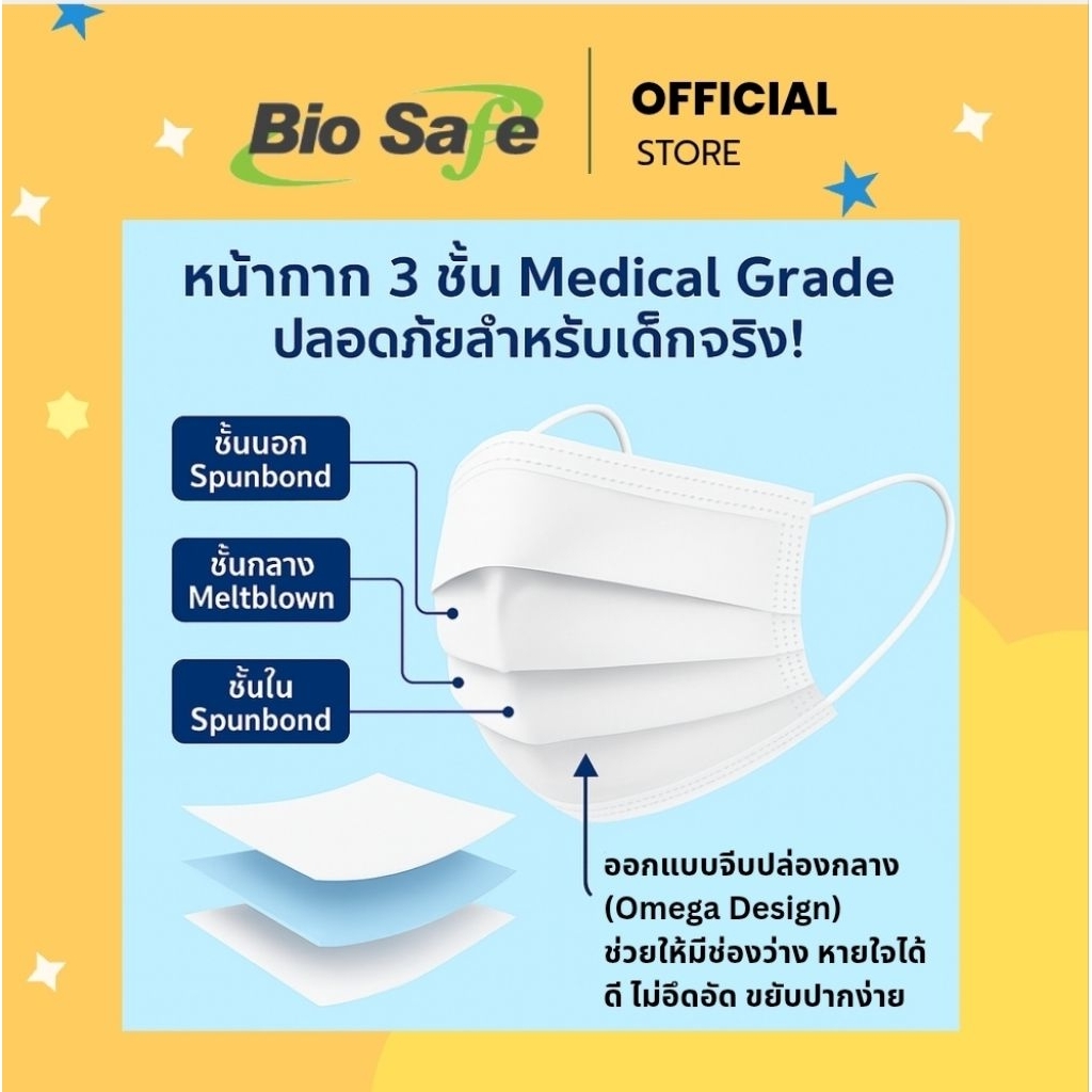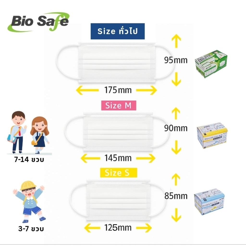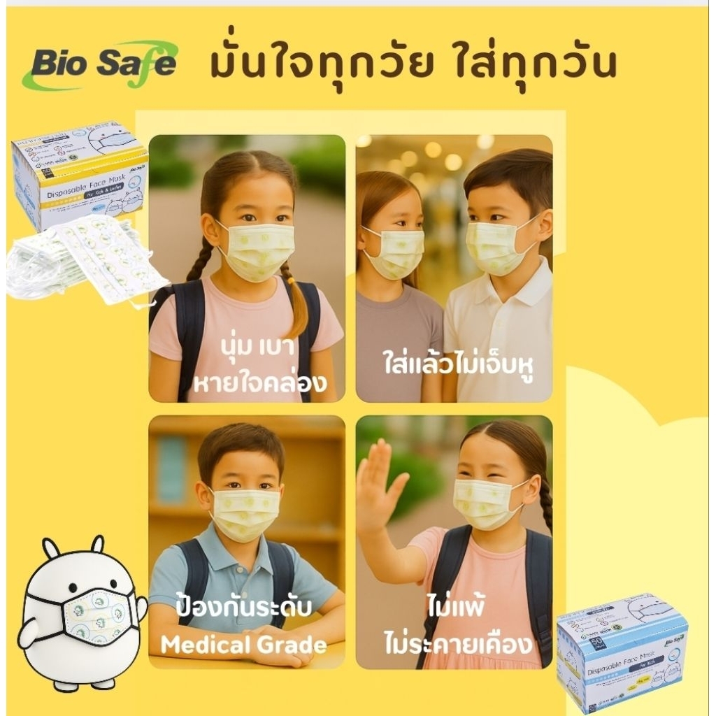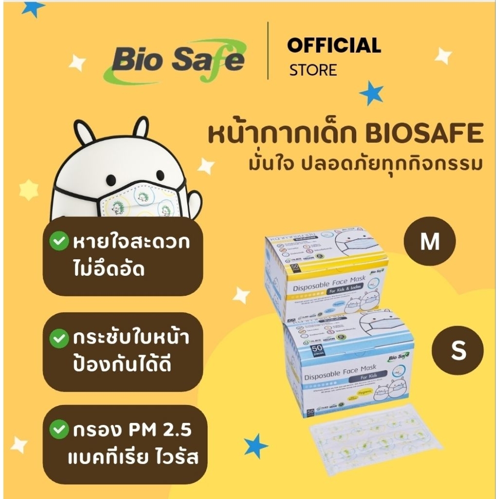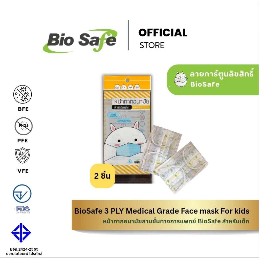 หน้ากากอนามัยเด็กลายการ์ตูน 3 ชั้นทางการแพทย์ ป้องกัน PM2.5 เชื้อโรค Size S M ซอง 2 ชิ้น BioSafe