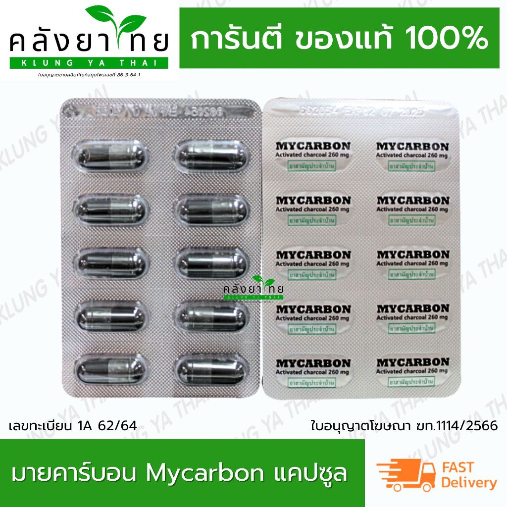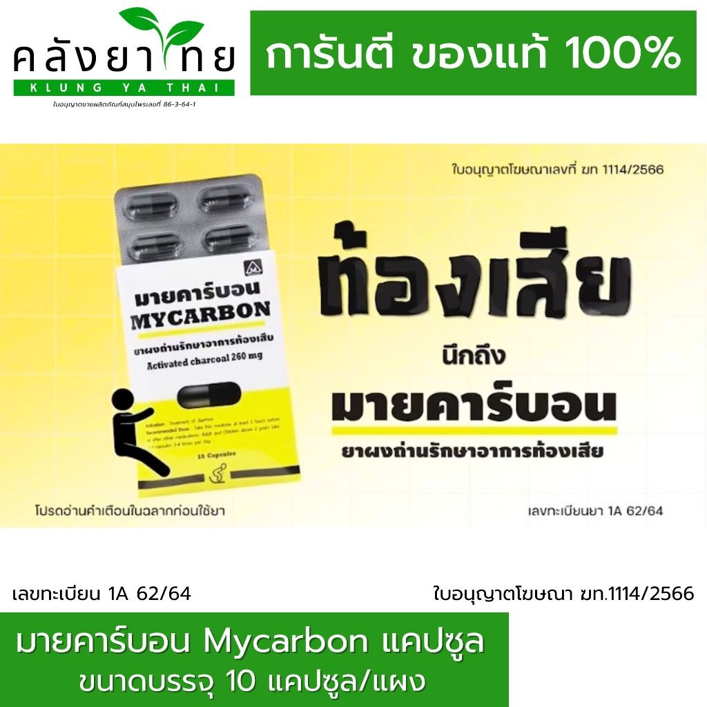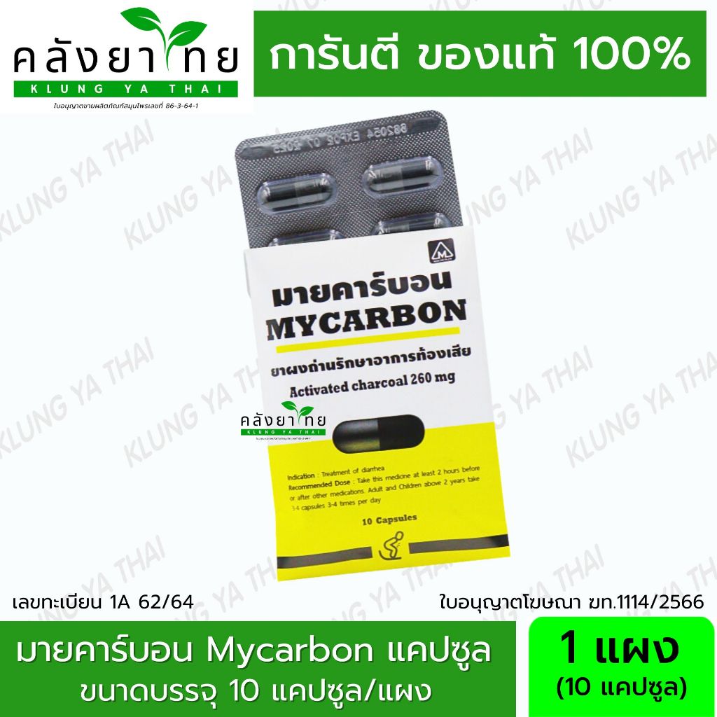 [1 ซอง] Mycarbon มายคาร์บอน ผงถ่าน รักษาอาการท้องเสีย จำนวน 1 แผง มี 10 เเคปซูล