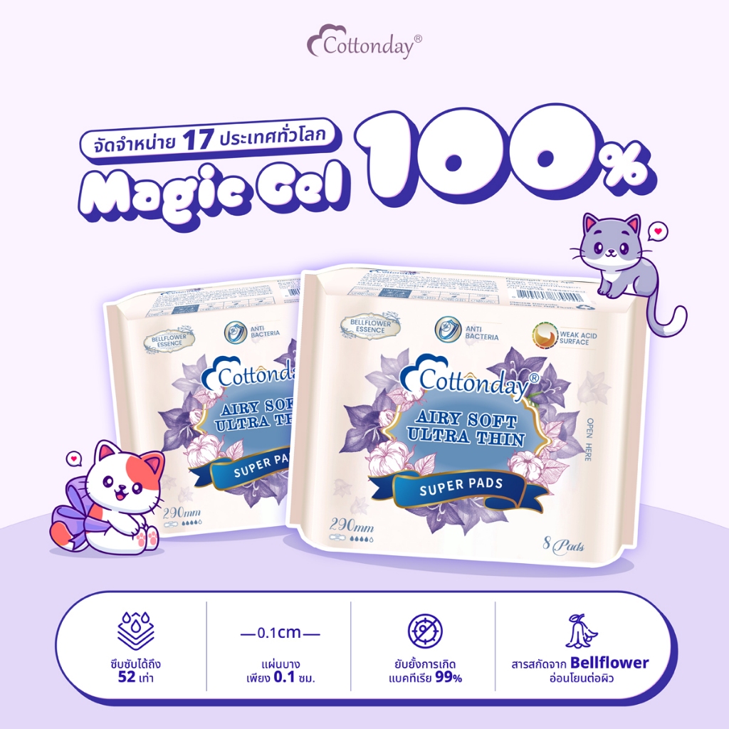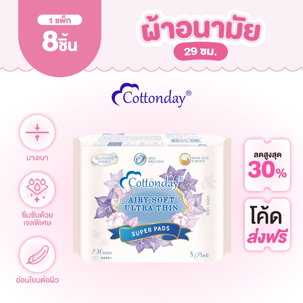Cottonday ผ้าอนามัยแบบกลางคืน Ultra Thin Regular Night Pads ขนาด 29cm 8 ชิ้น มีปีก ของใช้ผู้หญิง