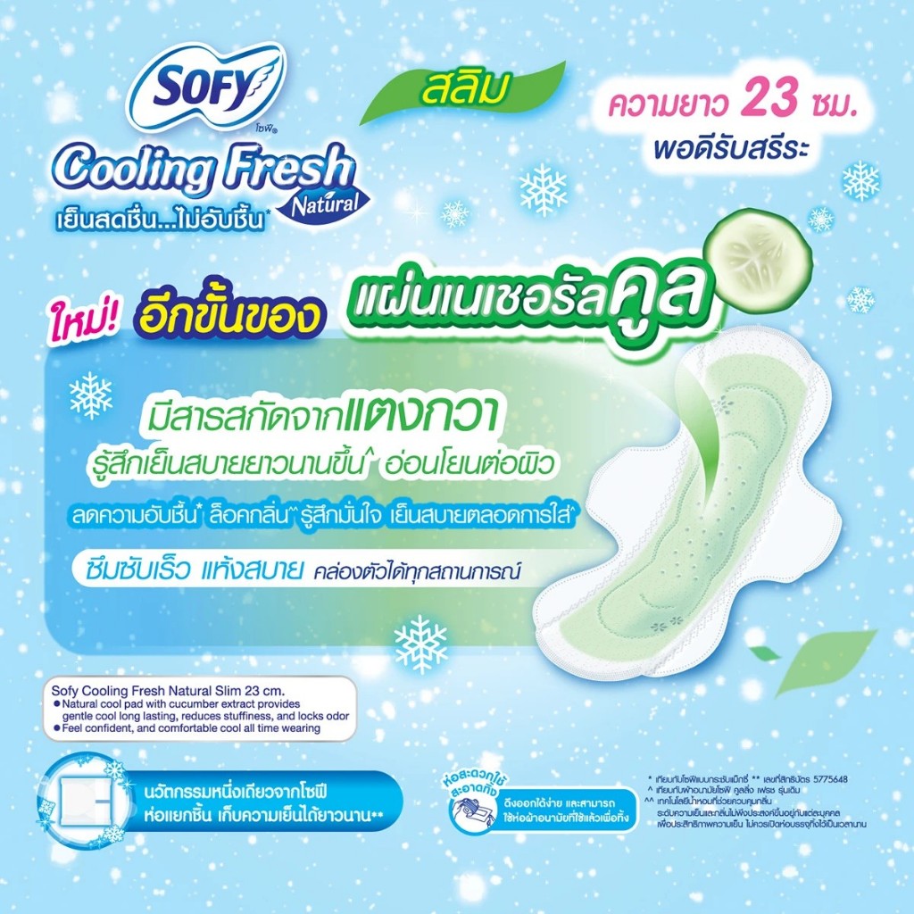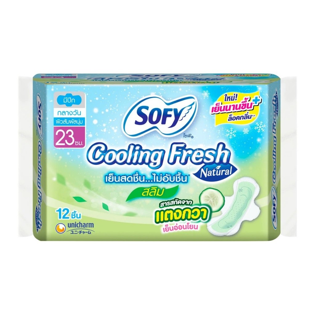 โซฟี ผ้าอนามัย คูลลิ่งเฟรช เนเชอรัล สลิม สำหรับกลางวัน แบบมีปีก 23 ซม. 12 ชิ้น