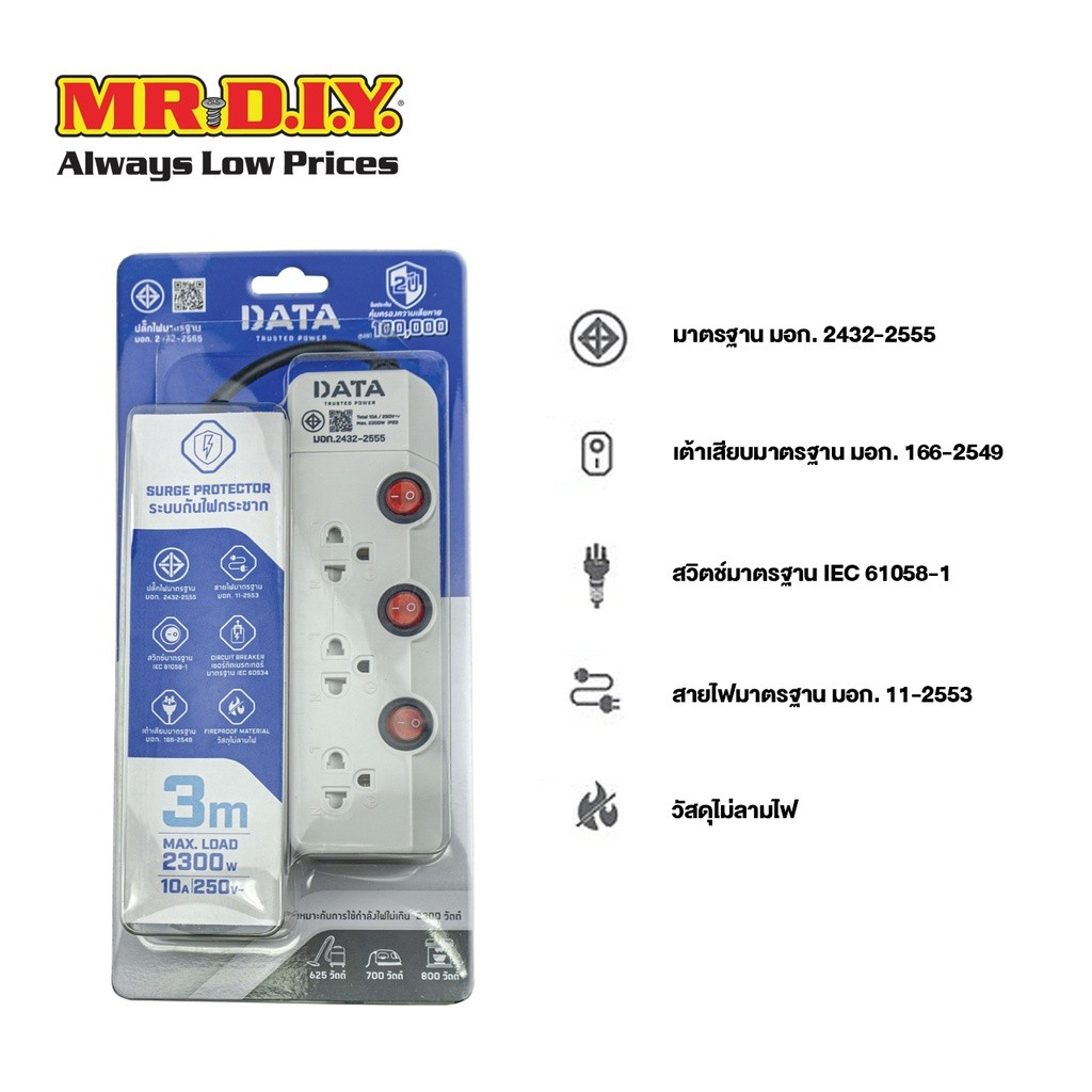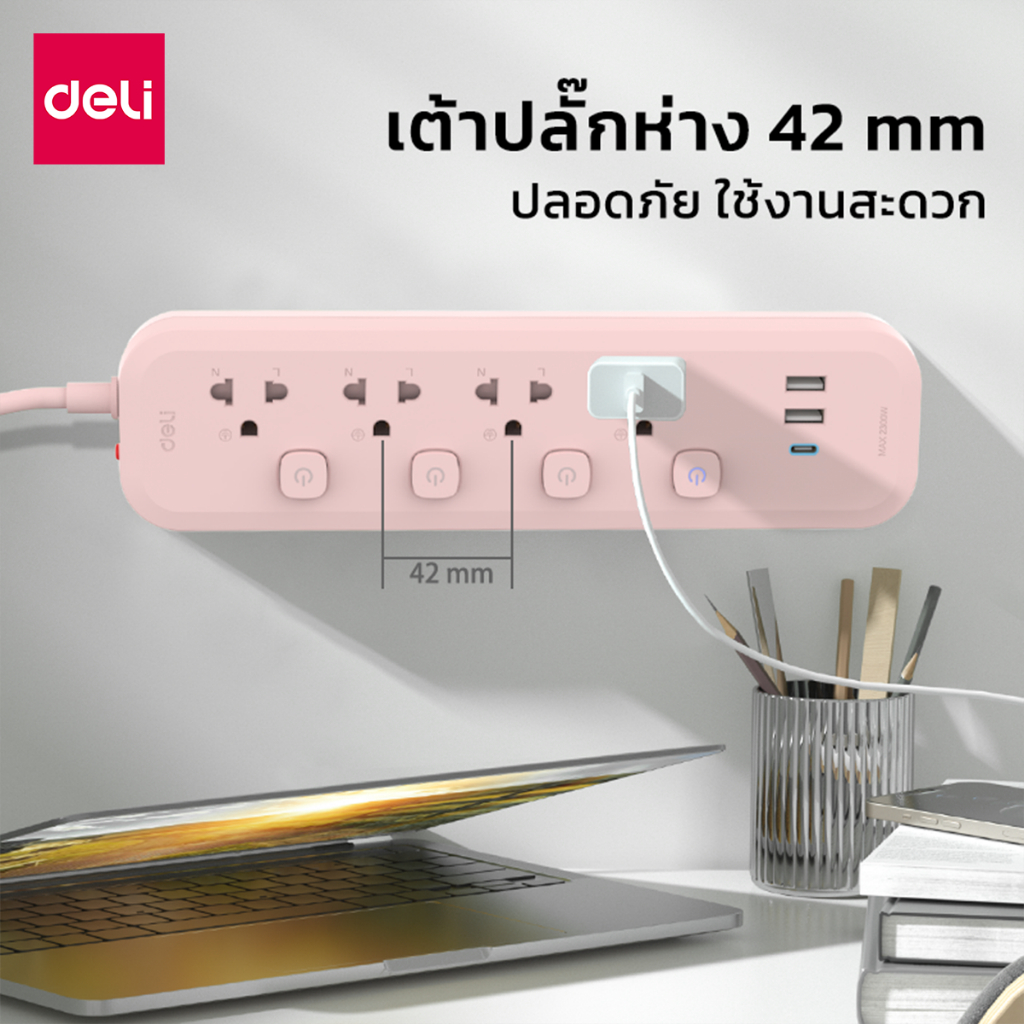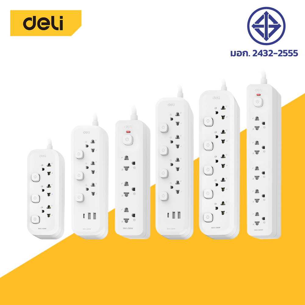 Deli ปลั๊กไฟ USB ปลั๊ก3ตา กำลังไฟ 2300W มอก. สวิตช์ปิด-เปิด ตัดไฟได้ สายยาว 3 5m รับประกันนาน 3ปี Power Socket
