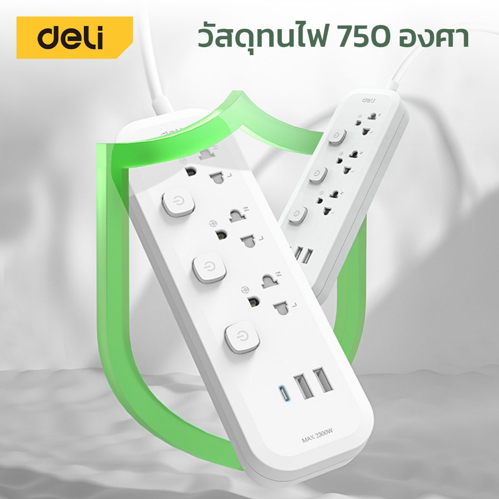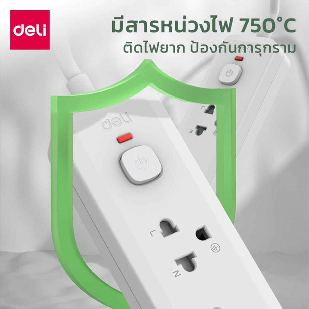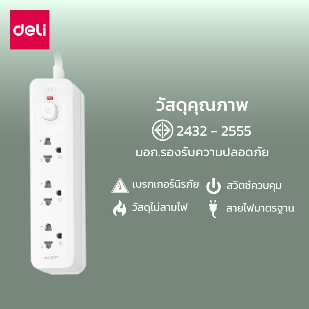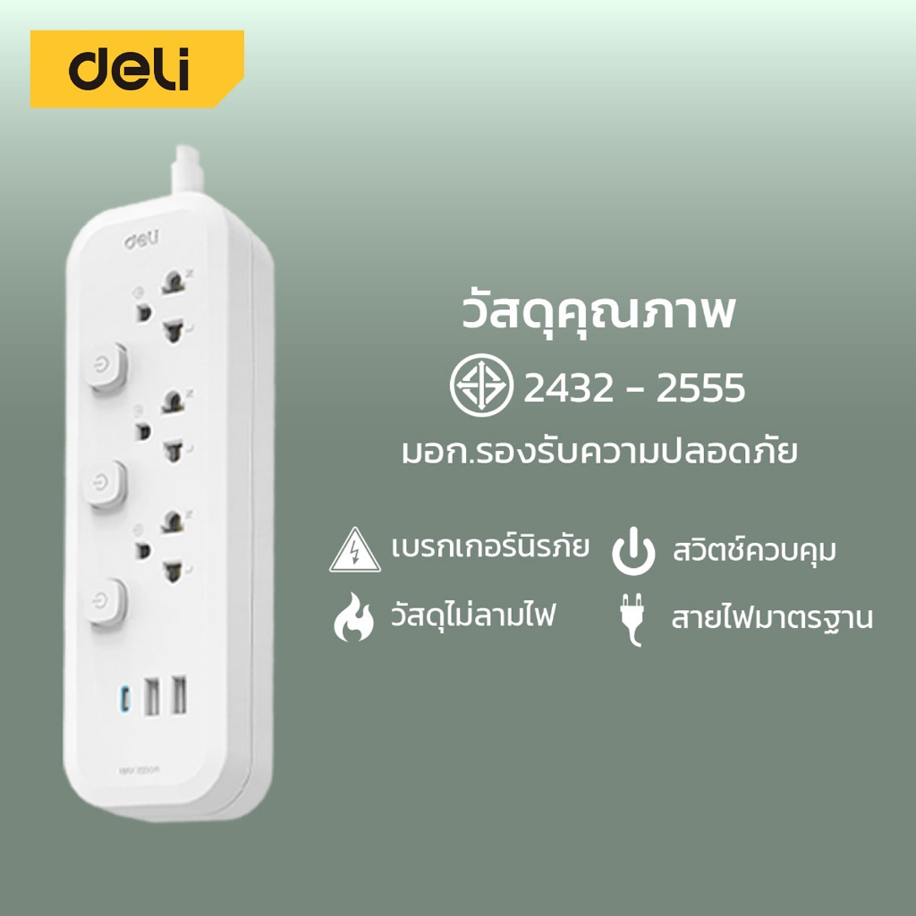 Deli ปลั๊กUSB ปลั๊กไฟ แบบสามตา กำลังไฟสูงสุด 2300W ยาว 3เมตร ทนไฟได้ 750 ํC มาตรฐาน มอก Power Socket