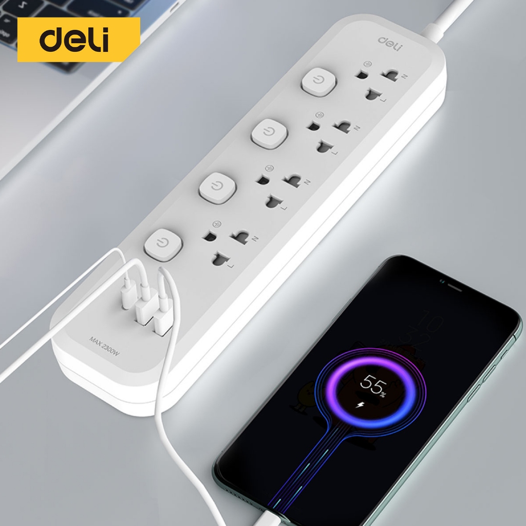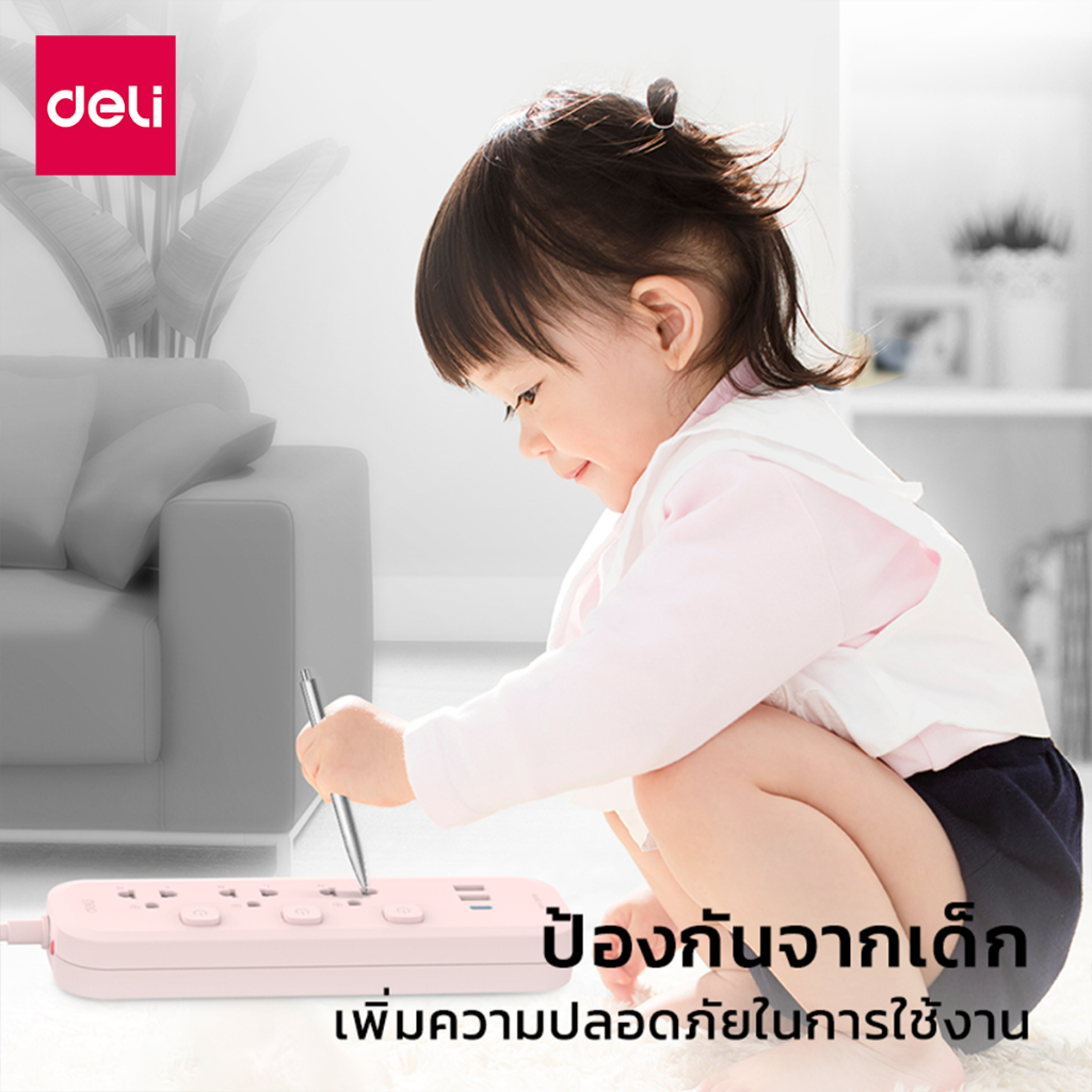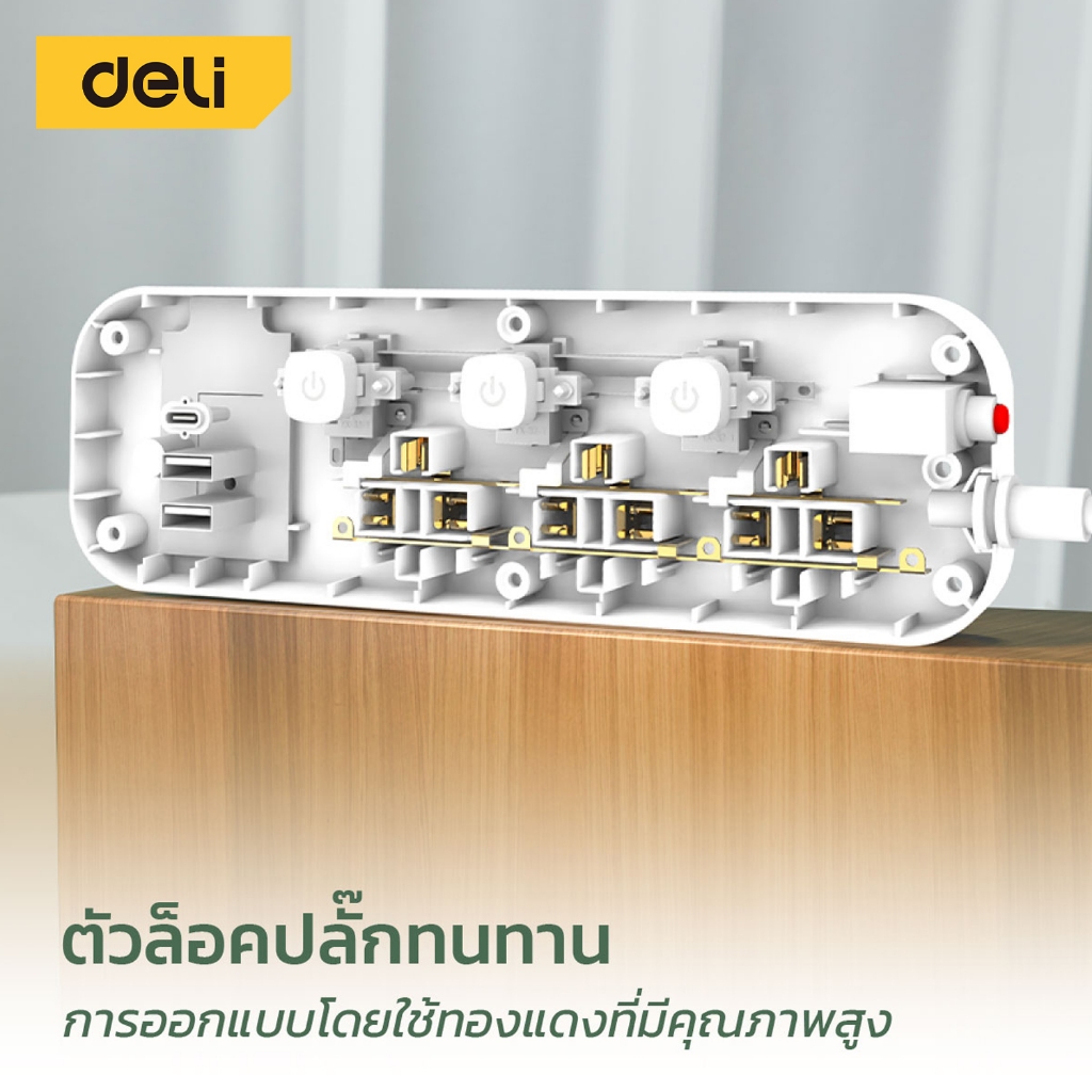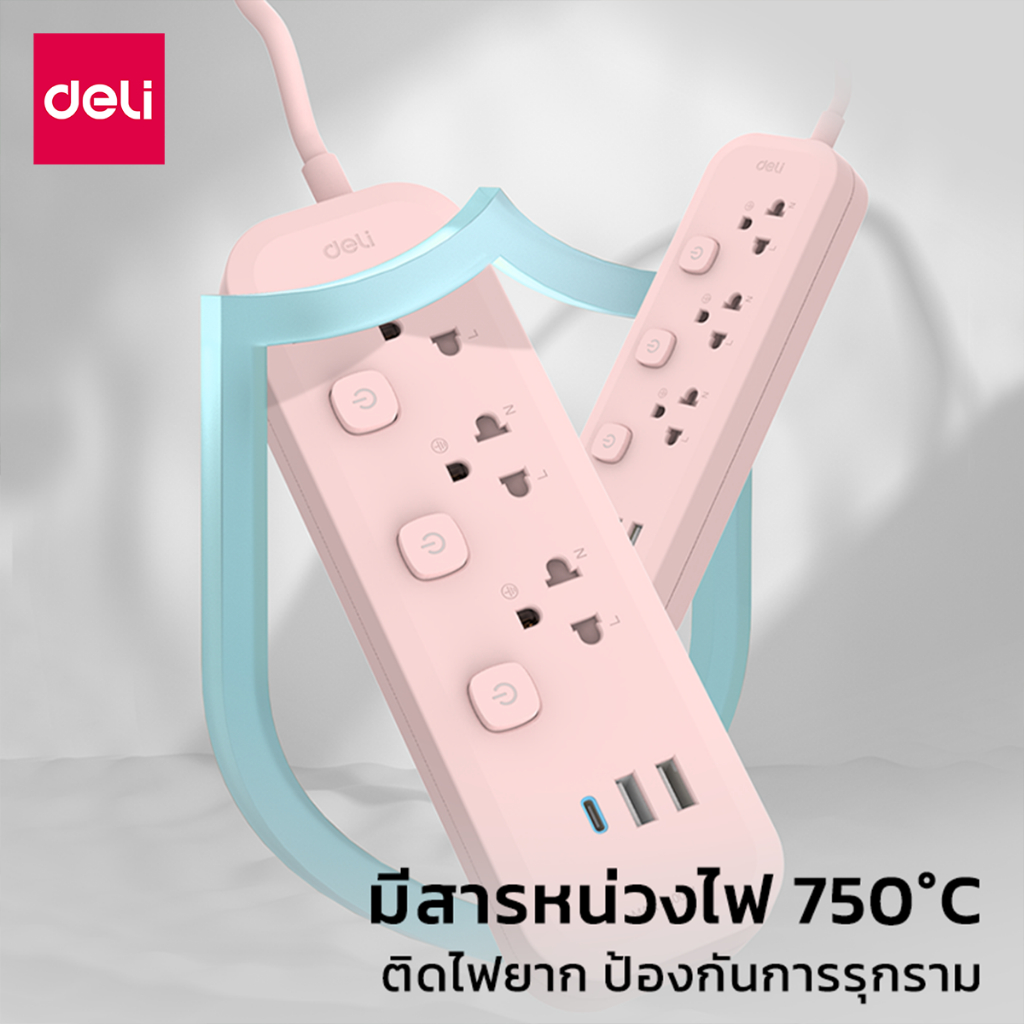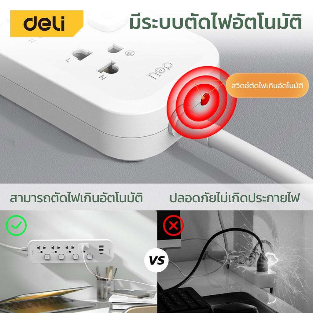 Deli ปลั๊กUSB ปลั๊กไฟ แบบสามตา กำลังไฟสูงสุด 2300W ยาว 3เมตร ทนไฟได้ 750 ํC มาตรฐาน มอก Power Socket