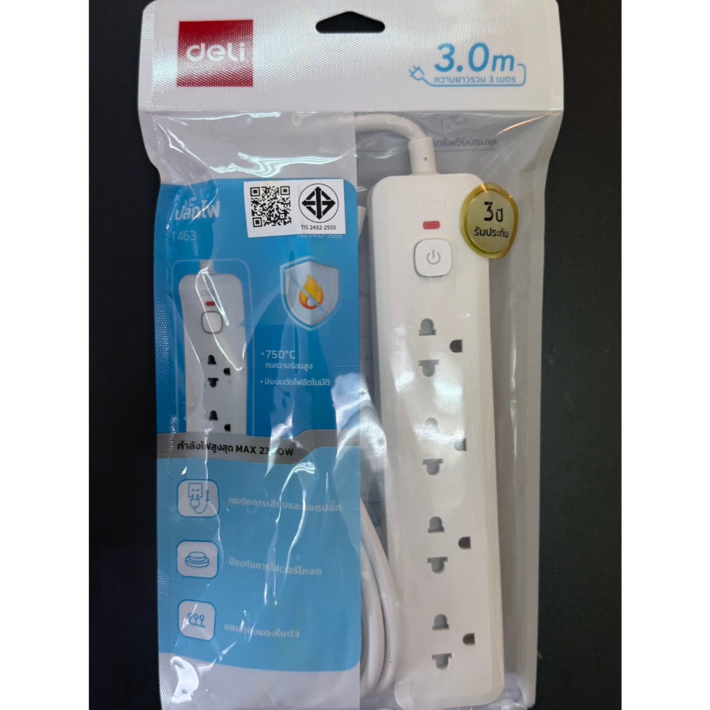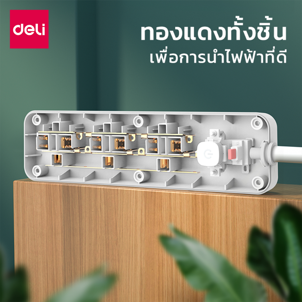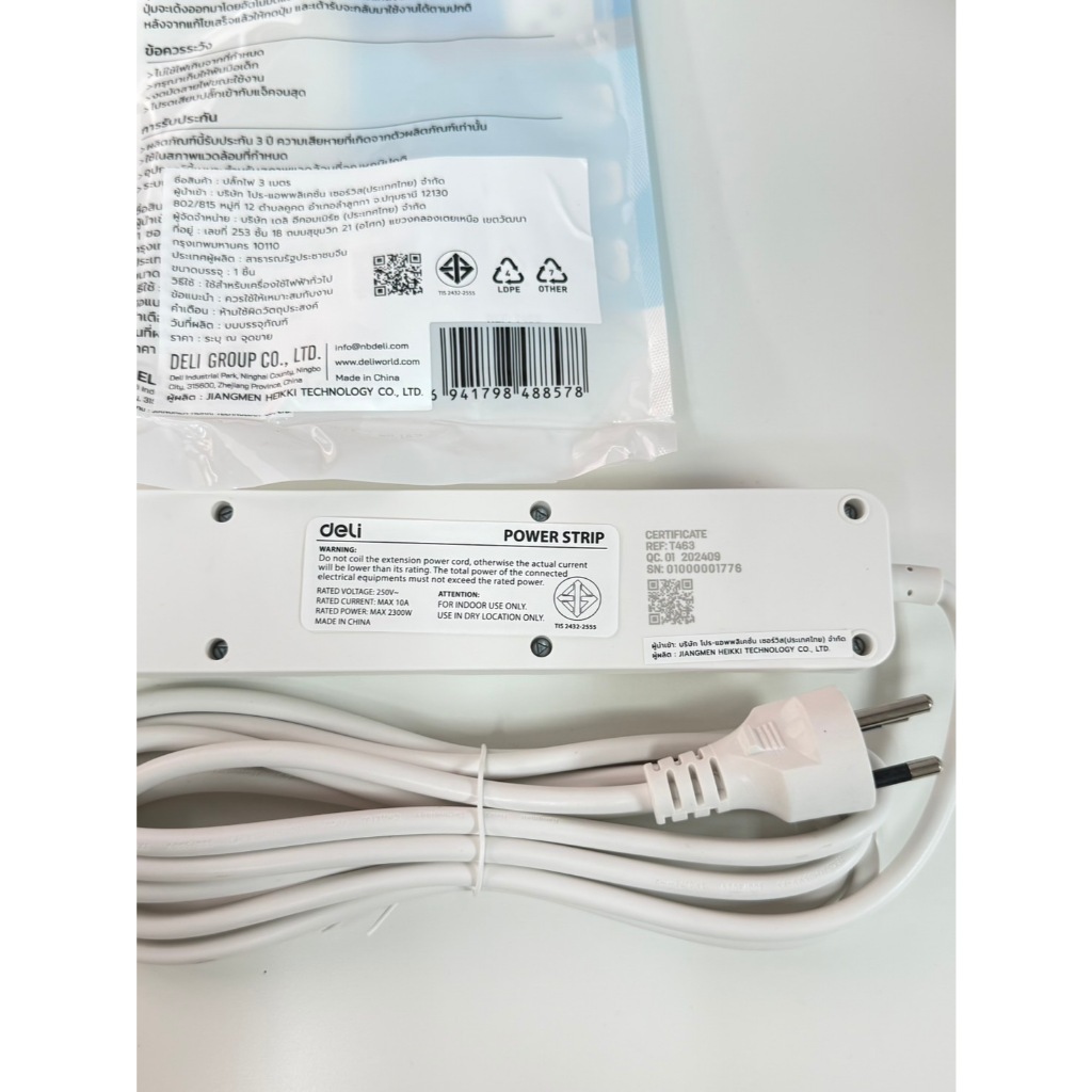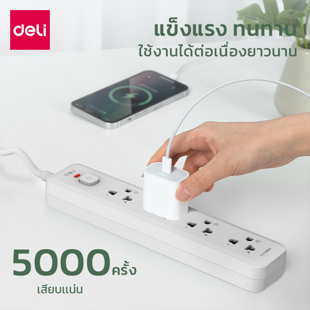 Deli ปลั๊กUSB ปลั๊กไฟ แบบสามตา กำลังไฟสูงสุด 2300W ยาว 3เมตร ทนไฟได้ 750 ํC มาตรฐาน มอก Power Socket