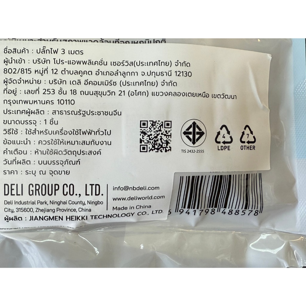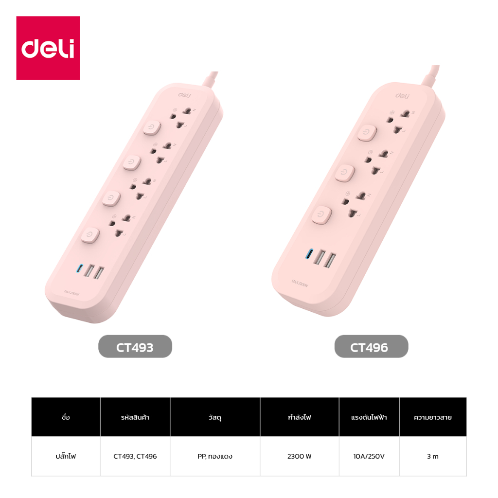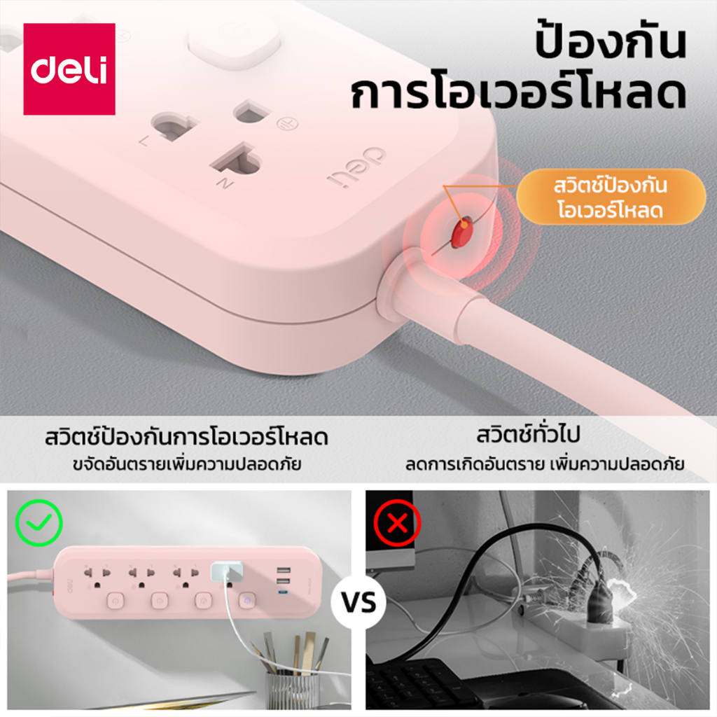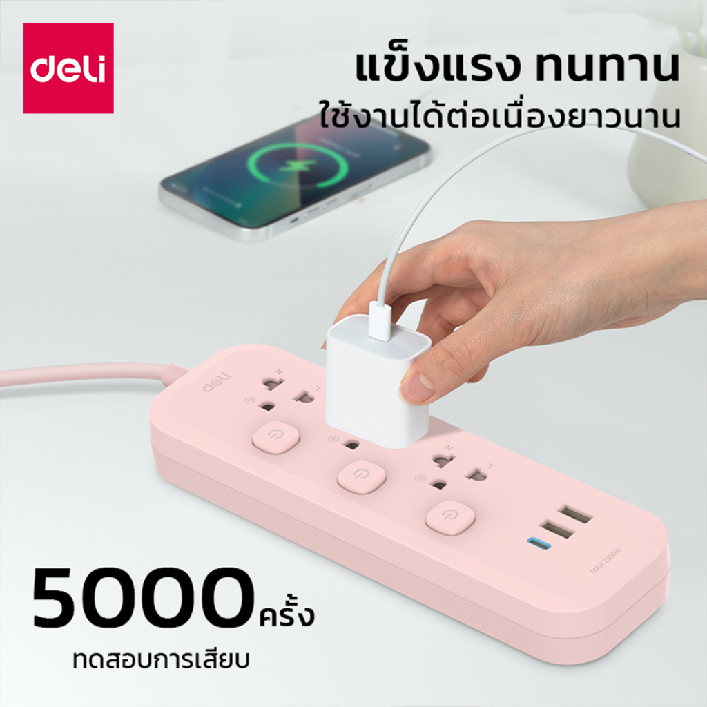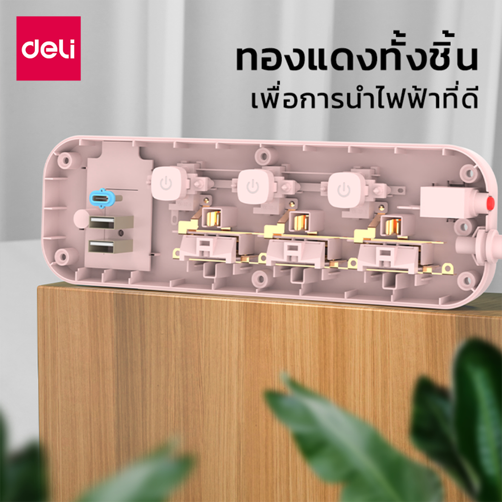 Deli ปลั๊กUSB ปลั๊กไฟ แบบสามตา กำลังไฟสูงสุด 2300W ยาว 3เมตร ทนไฟได้ 750 ํC มาตรฐาน มอก Power Socket