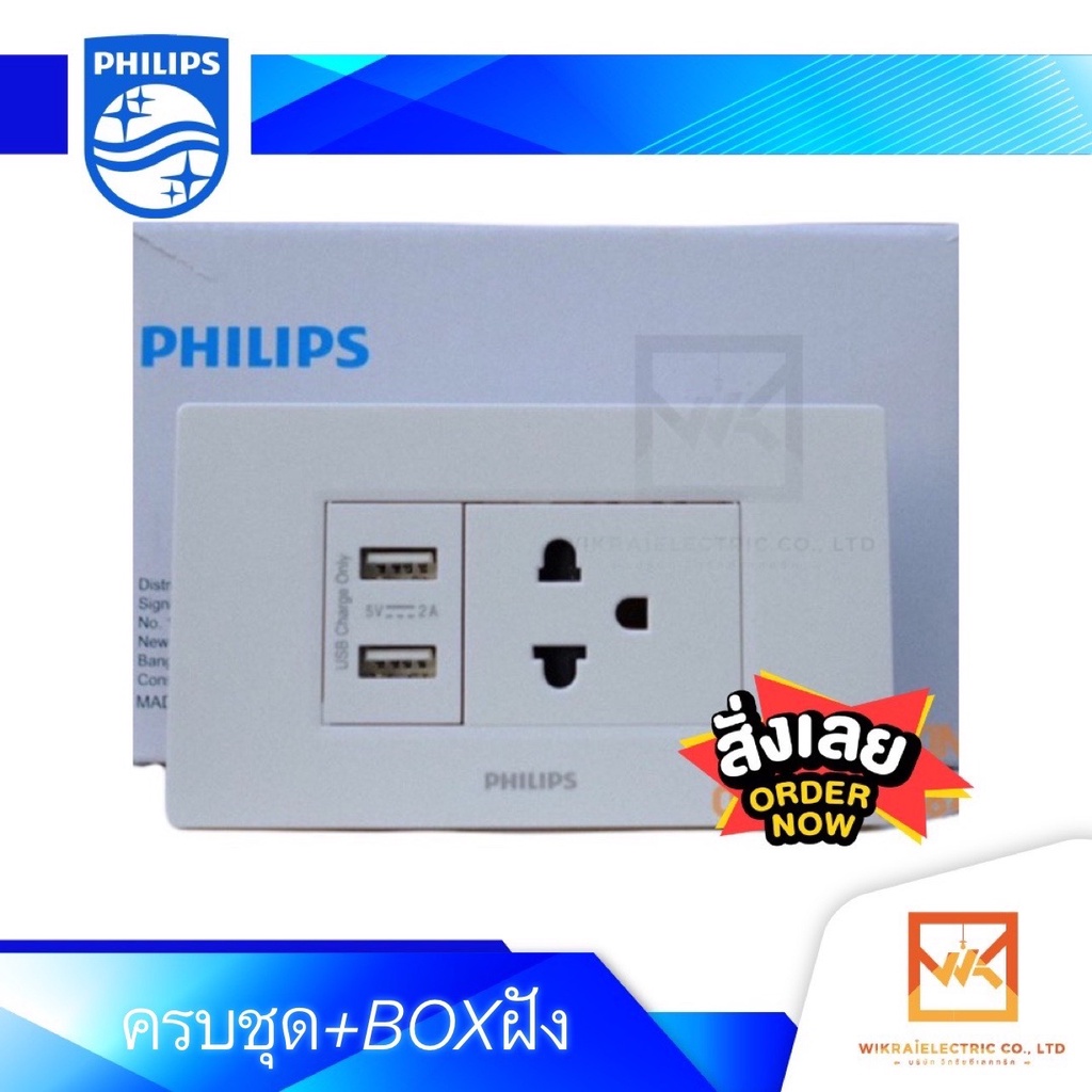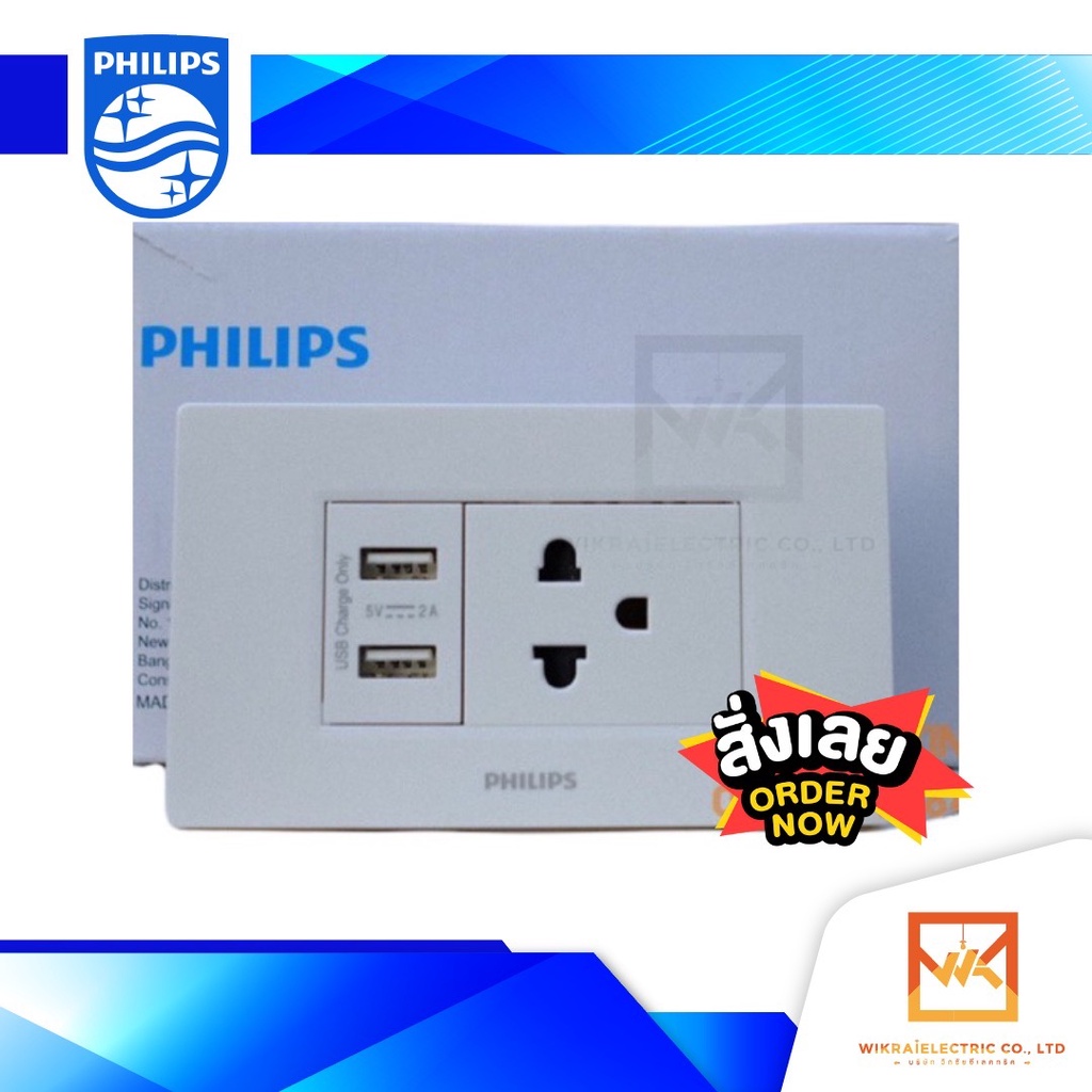PHILIPS เต้ารับUSB 2 ช่อง ปลั๊กกราวน์เดี่ยวพร้อมหน้ากาก3ช่อง สีขาว ฟิลิปส์ ครบชุด รุ่น Leaf สวิตซ์ สวิท สวิตซ์ปลั๊ก