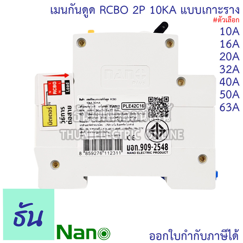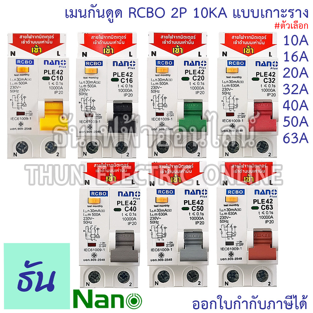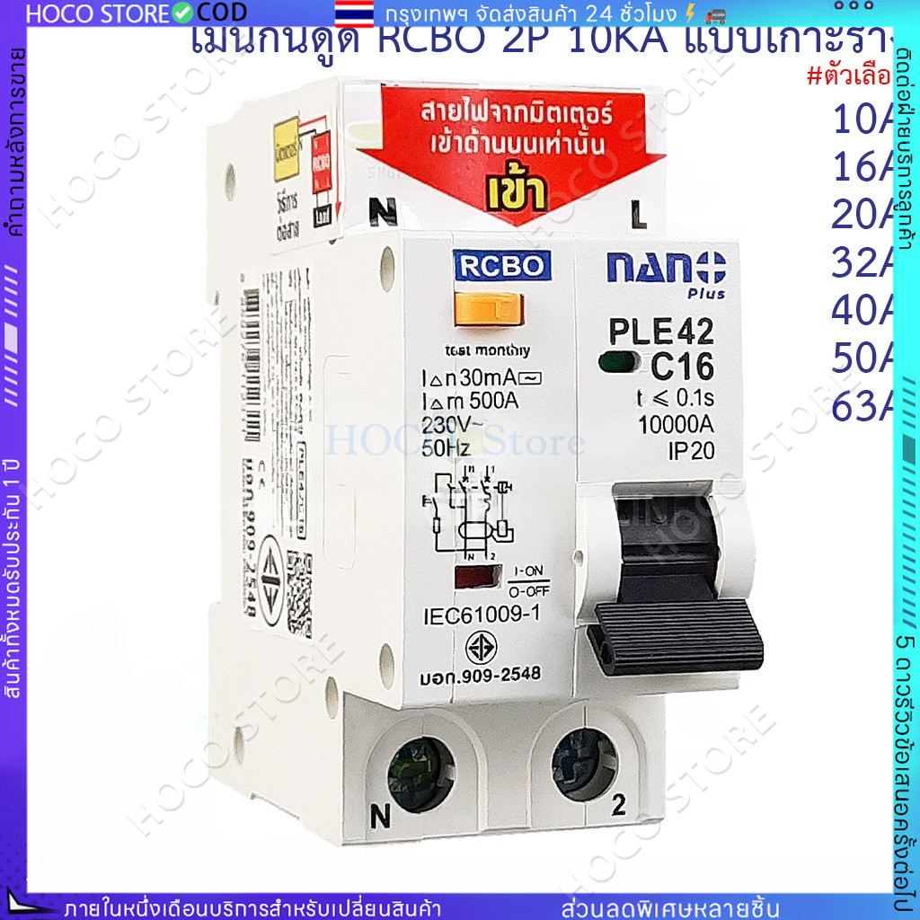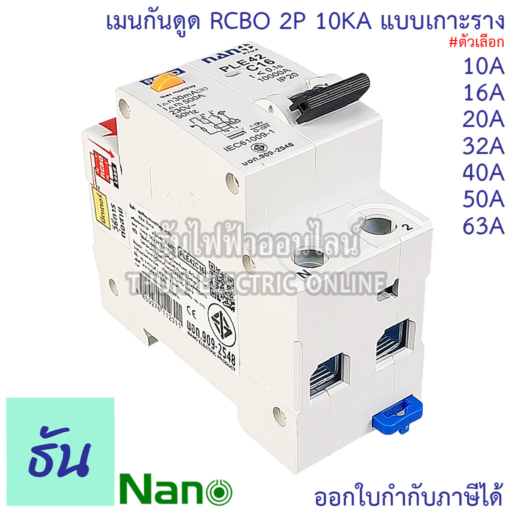 Nano RCBO 2P 10A, 16A, 20A, 32A, 40A, 50A, 63A เมนกันดูด แบบเกาะราง เบรกเกอร์ 2 เฟส PLE42C10 PLE42C16PLE42C16, PLE42C20